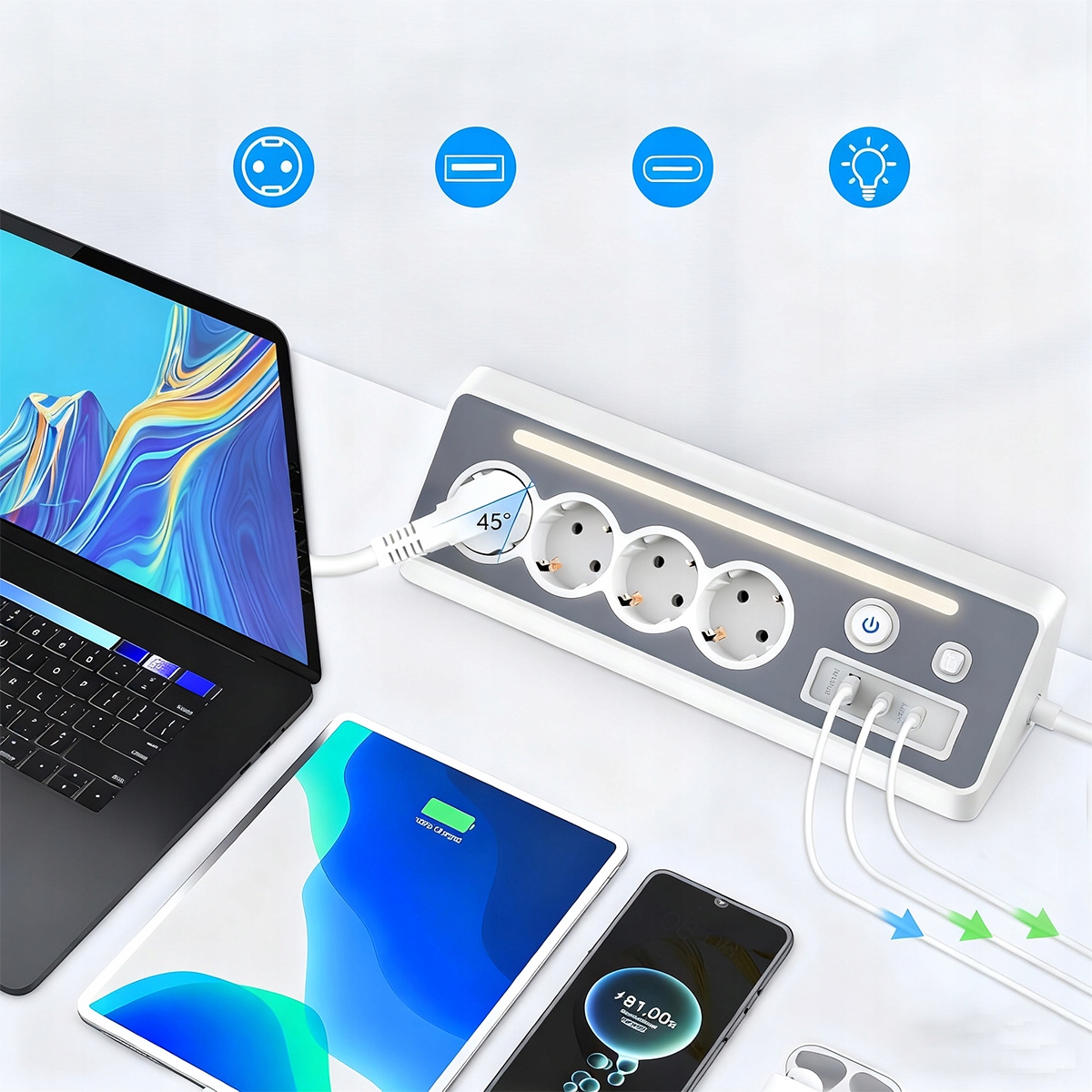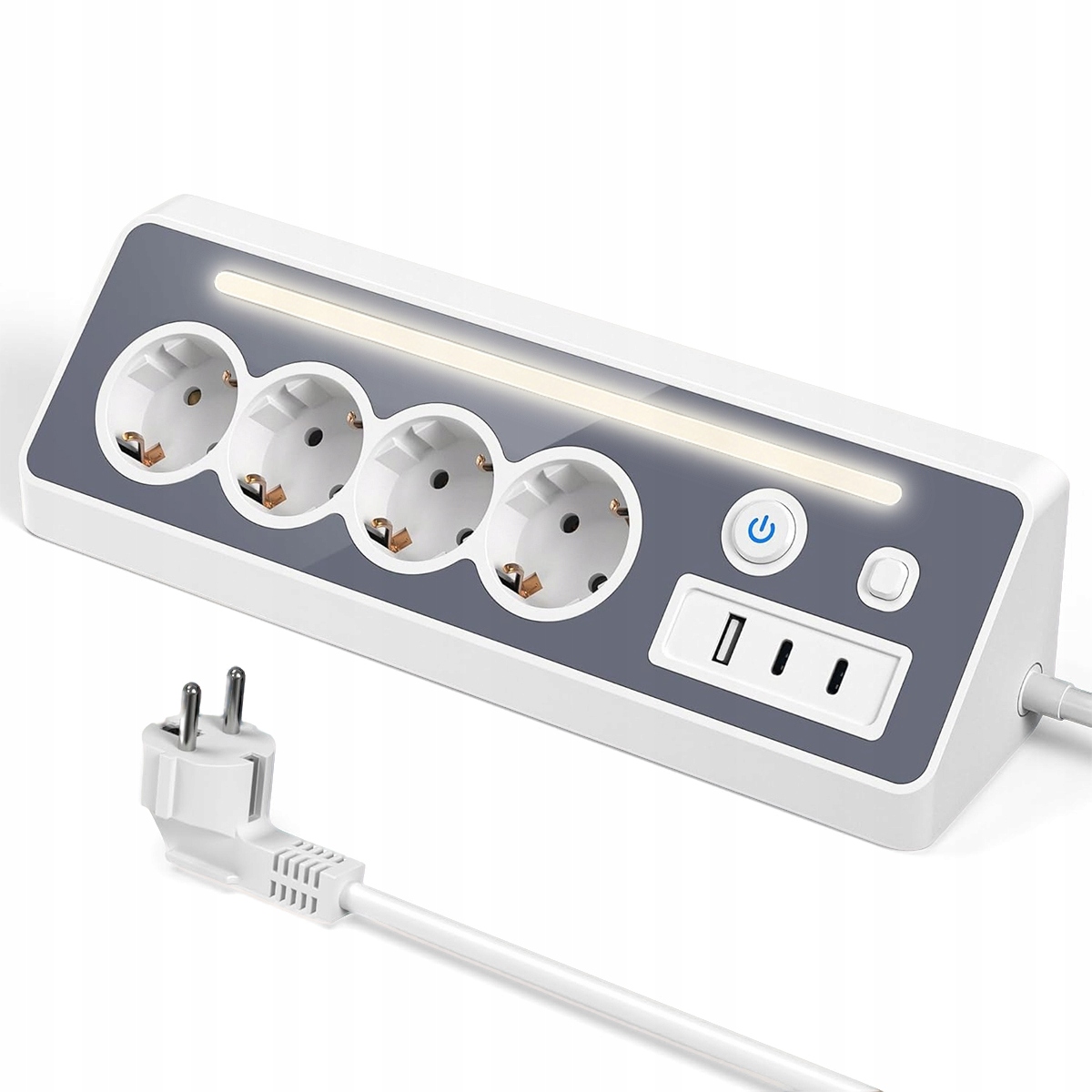 ✅ Ta listwa zasilająca posiada 4 gniazda (3680 W/16 A), 2 porty USB-C, 1 port USB-A (łączne wyjście 5 V/3,4 A), energooszczędną lampkę nocną LED oraz 2 przełączniki.