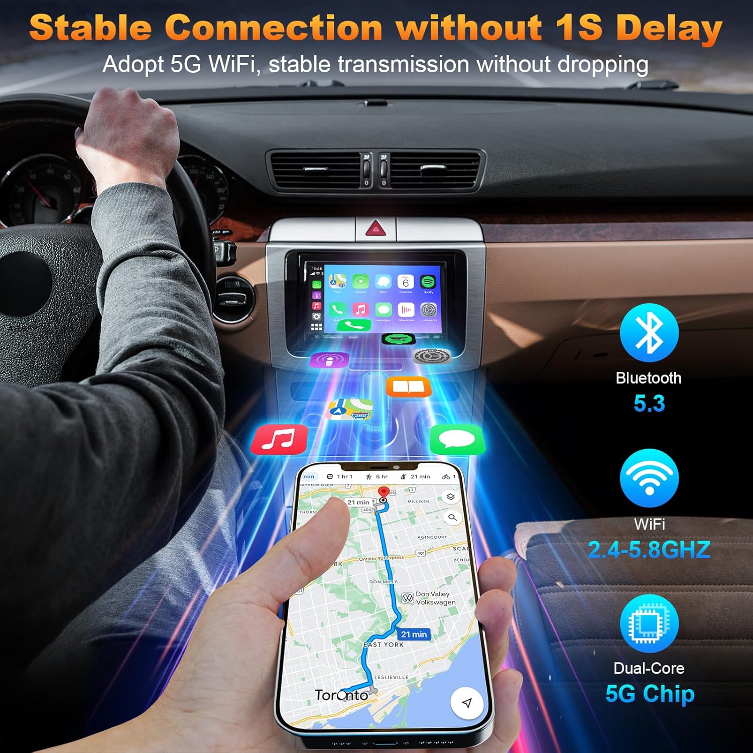 SZYBKIE I STABILNE POŁĄCZENIE 5 GHz - adapter wykorzystuje nowoczesny dwurdzeniowy chip 5G, Bluetooth 5.0 oraz Wi-Fi 5,8 GHz, aby zapewnić błyskawiczne i stabilne łączenie z CarPlay. Automatyczne parowanie po uruchomieniu auta, nawet gdy telefon jest w kieszeni.