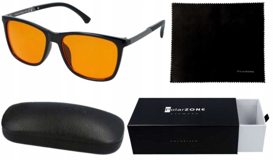 W zestawie: okulary, etui, ściereczka i pudełko. Wszystkie produkty marki PolarZONE.
