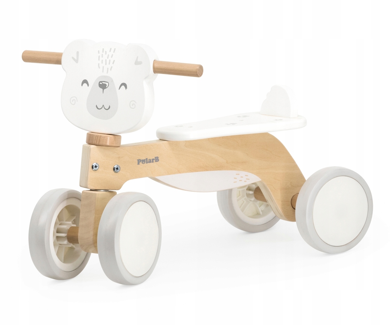 Ten uroczy, drewniany jeździk w kształcie misia zapewnia maluchom bezpieczną zabawę dzięki solidnej konstrukcji z drewna oraz czterem wytrzymałym oponom EVA, które zapewniają płynność podczas jazdy.
