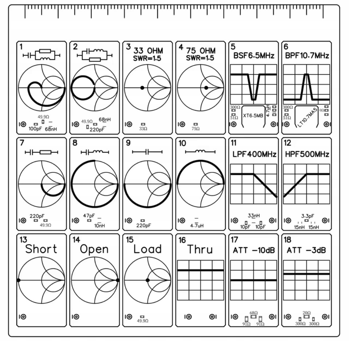 Płytka testowa przeznaczona do nauki i praktycznego testowania pracy analizatorów wektorowych VNA (np. NanoVNA, NanoVNA-F, SAA2, MiniVNA itp.). Zawiera 18 pól testowych, które umożliwiają wykonywanie realnych pomiarów i ćwiczeń z zakresu RF.