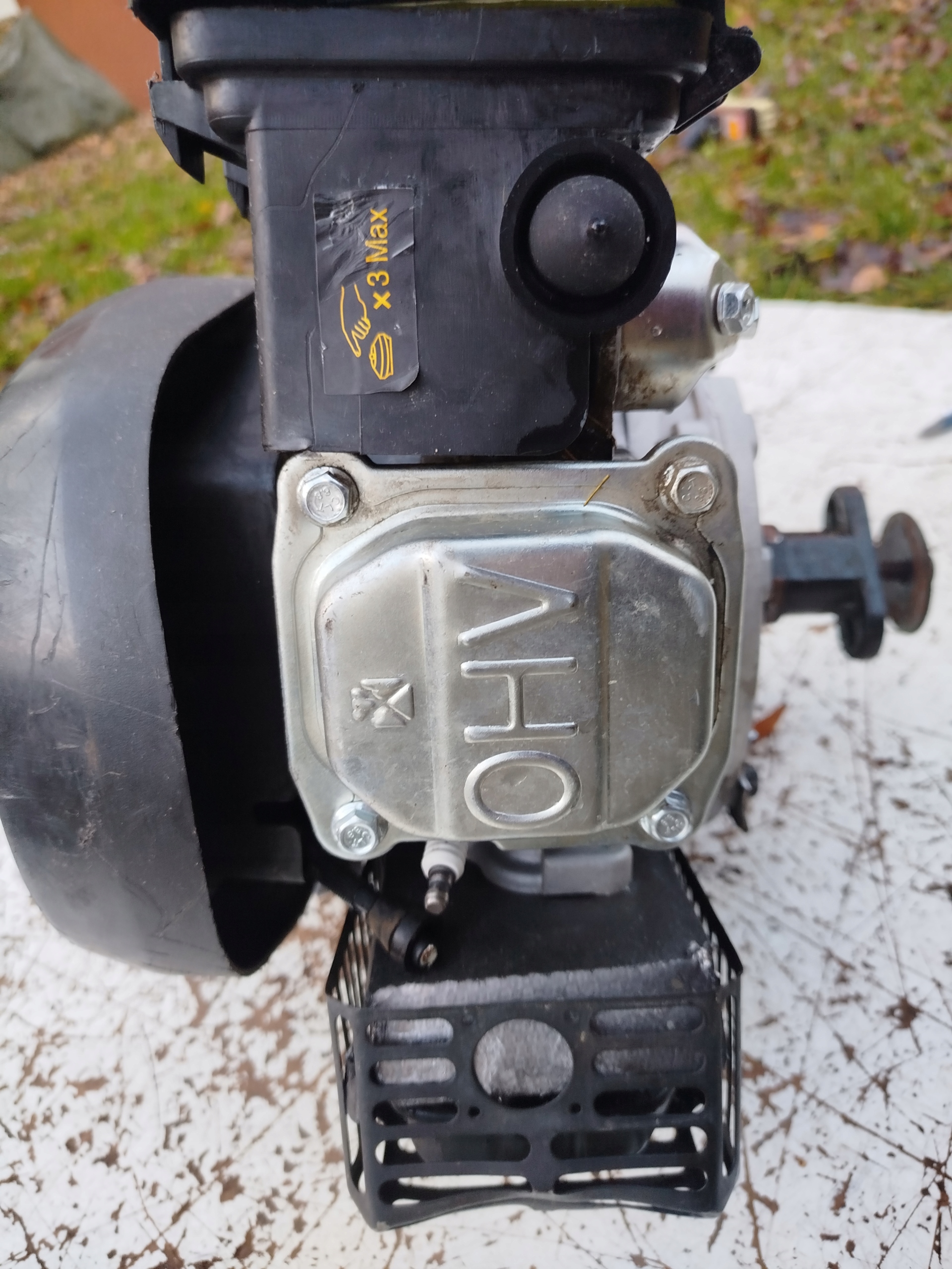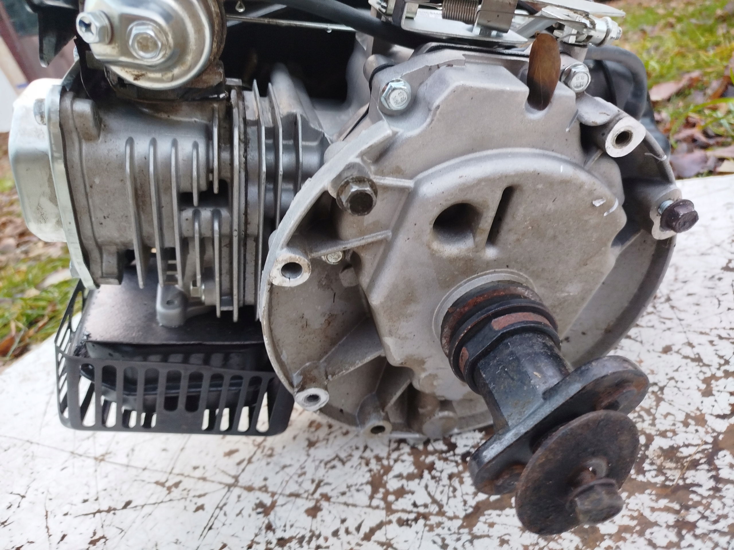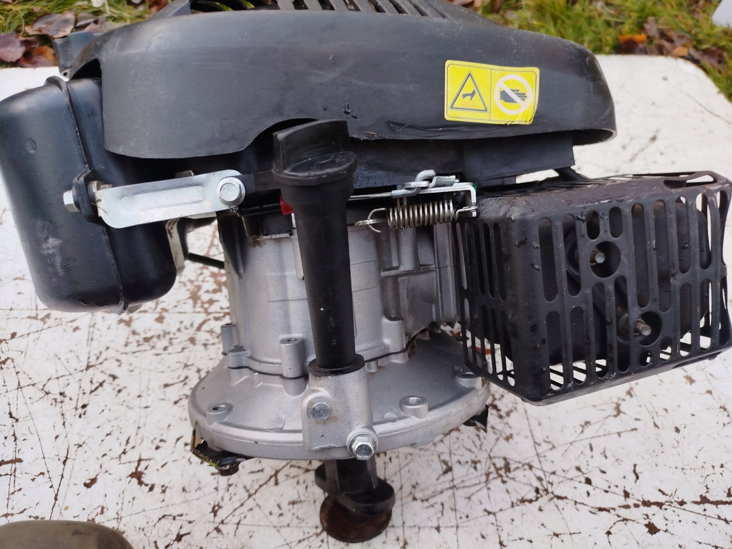 Silnik spalinowy kosiarki Riwall PRO. Wizualnie stan dobry, nic nie brakuje . Dla oceny kompletności zdjęcia są ze wszystkich stron. Szarpak obraca wałem. Wyczuwalna kompresja. Według zapewnień dostawcy silnik jest sprawny. Niemniej , nie podejmowałem próby jego uruchomienia. Średnica wału 22 mm z uchwytem noża.