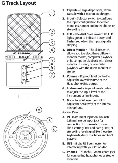Jako pierwszy na świecie pojemnościowy mikrofon USB z wbudowanym interfejsem audio oraz mikserem, G-Track pozwala na równoczesną kontrolę wejścia stereo oraz wzmocnienia sygnału wokalu i gitary, basu lub keyboardu, przy jednoczesnej możliwości monitorowania w trybie stereo, mono lub komputer za pośrednictwem wbudowanego gniazda słuchawek. Co więcej, G-Track posiada dużą 19-milimetrową membranę skonfigurowaną do pracy z superkardioidalną charakterystyką kierunkowości w celu zapewnienia jednolicie płaskiej charakterystyki częstotliwościowej.
