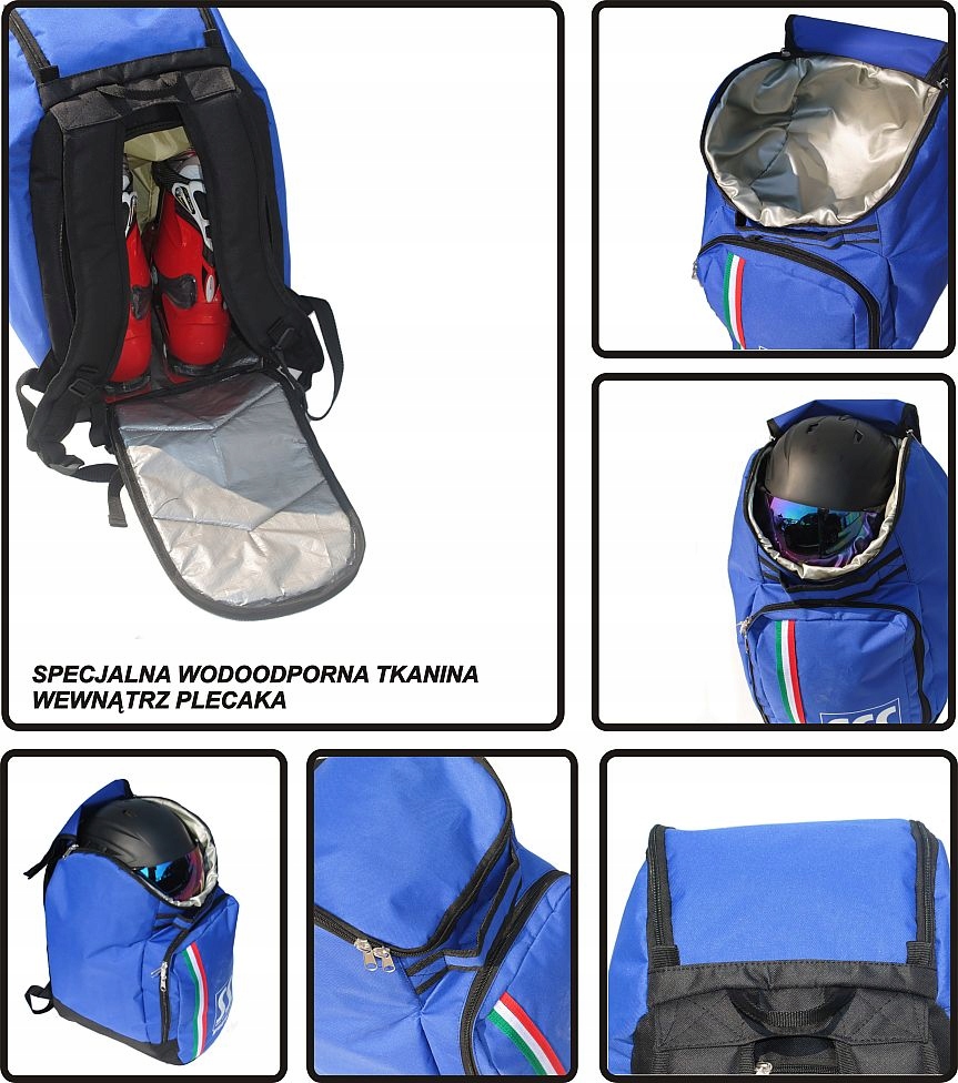 Plecak wykonany jest z wodoodpornej tkaniny kaletniczej NYLON 600/600 ECO - na zewnątrz, wewnątrz zastosowano specjalną tkaninę wodoodporną -TARPAULIN . Plecak posiada oddzielną komorę na buty otwieraną szeroko podwójnym suwakiem #8 - dla wygody pakowania,na górze oddzielna komora na kask , z przodu duża kieszeń na inne potrzebne wyposażenie np rękawice, gogle, smary itp.