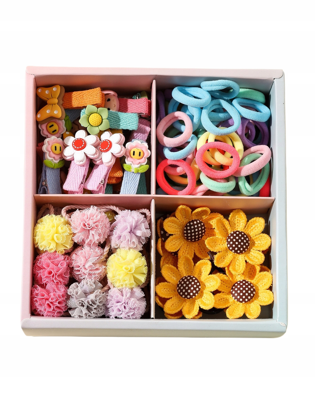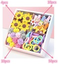 Aż 74 elementy – duży wybór kolorów i wzorów: kwiatki, kokardki, pastelowe gumki, miękkie materiałowe rozetki i duże słoneczniki.
