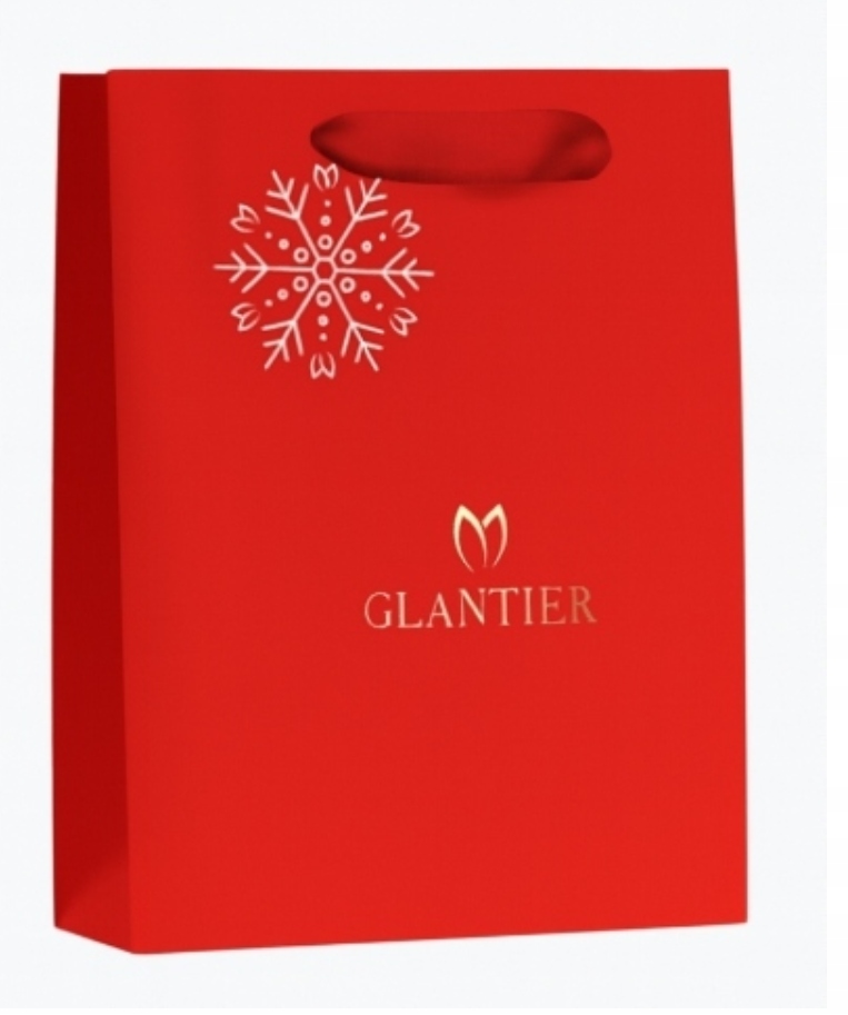 4. Elegancka czerwona torebka prezentowa z logo Glantier i zawieszką z uchwytami w postaci aksamitnych wstążek, o wymiarach: 23 cm x 18 cm x 10 cm. Stworzona z myślą o wręczaniu zestawów prezentowych, ponieważ jej ekskluzywny wygląd i design podkreśli wyjątkowość zawartych w niej upominków.