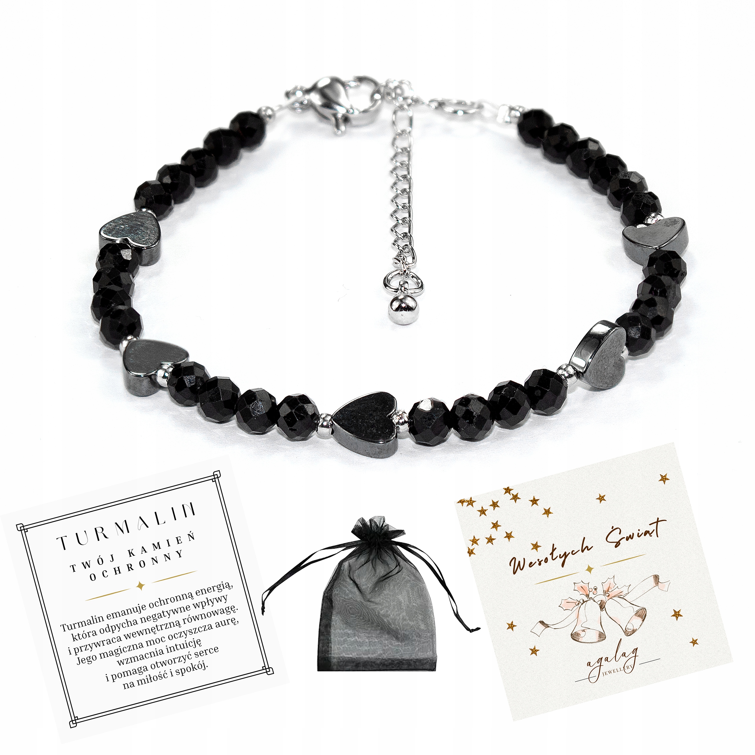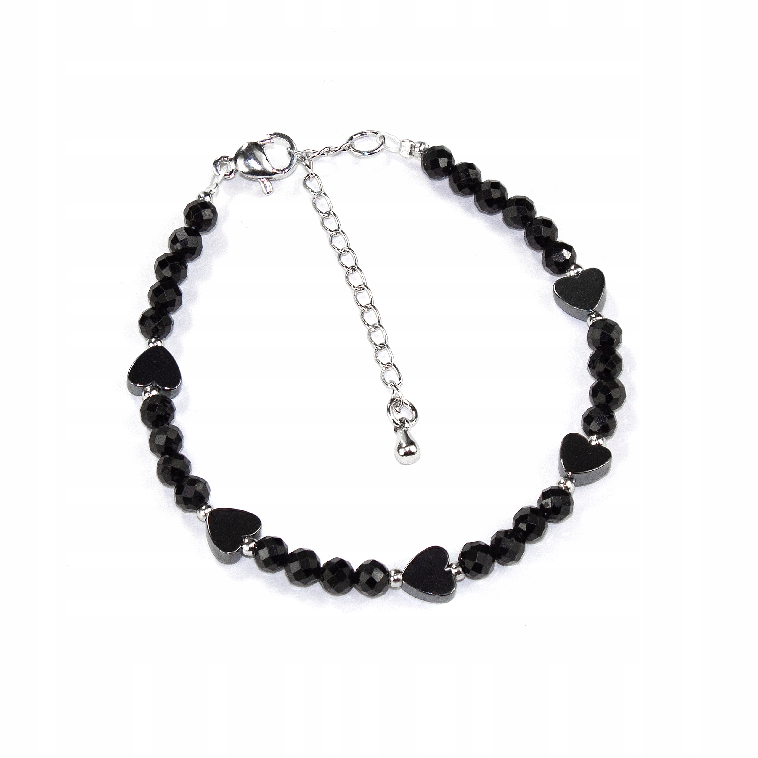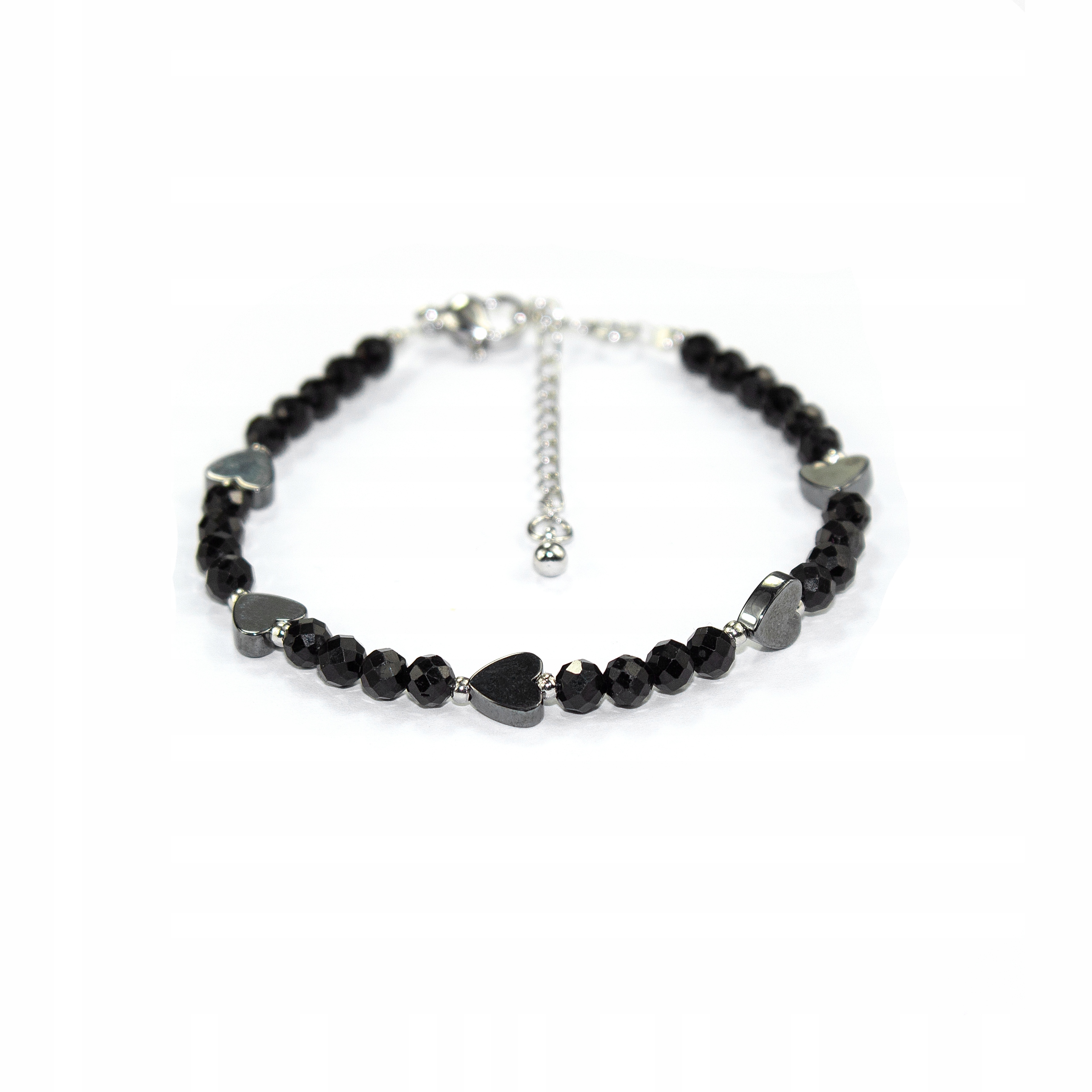 Subtelna i elegancka bransoletka regulowana, wykonana z fasetowanych kulek czarnego turmalinu, które pięknie odbijają światło, tworząc delikatny połysk przy każdym ruchu. Centralnym elementem kompozycji są hematytowe serca – gładkie, błyszczące i utrzymane w głębokim, grafitowym odcieniu.