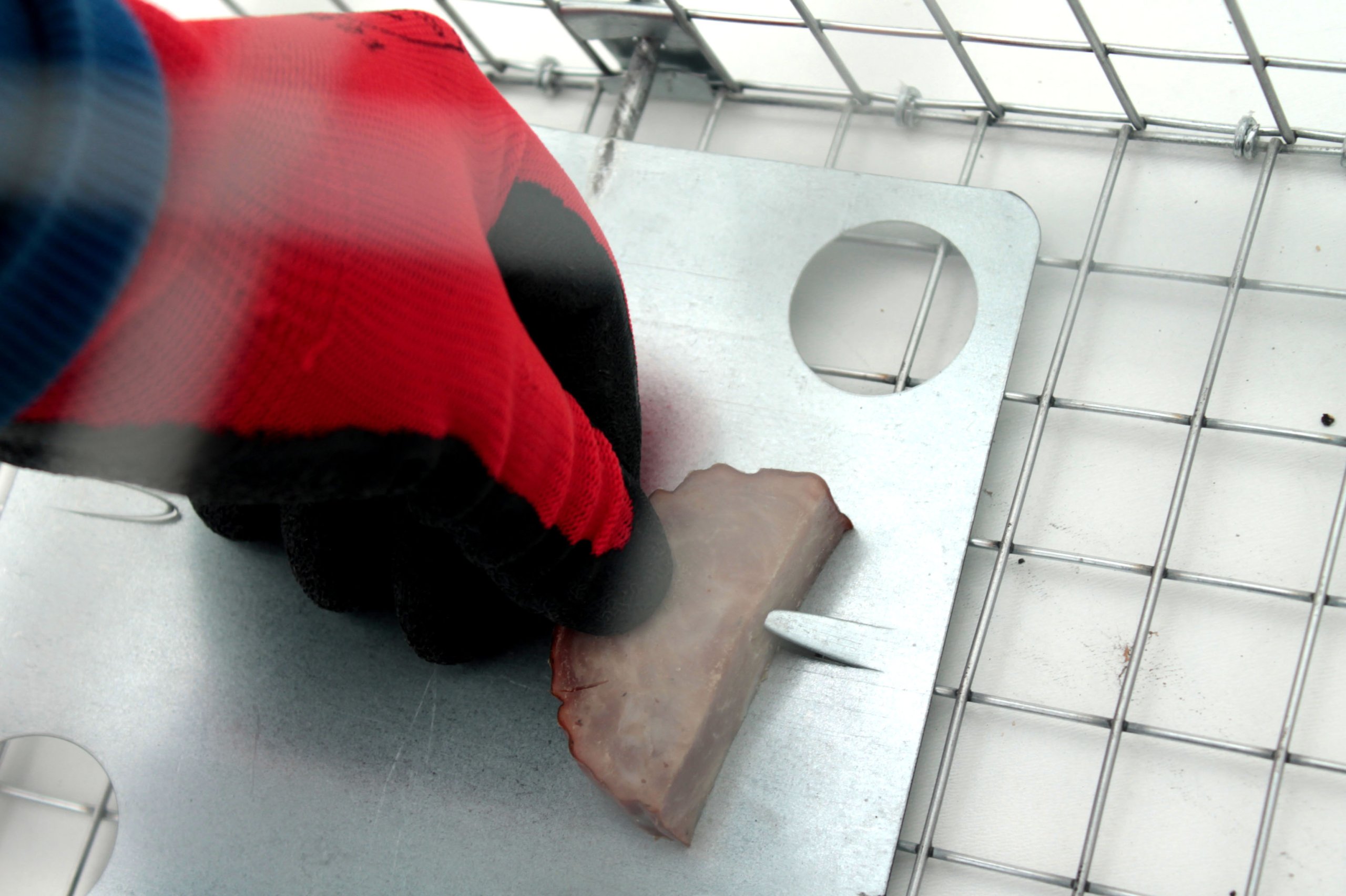 TACA ZANĘTOWA POSIADA SPECJALNE HACZYKI NA MIĘSO - nasze pułapki są zaopatrzone dodatkowo w haczyki do zakłuwania mięsa tak by zwierz nie mógł go zdjąć z tacy nie poruszając jej, przy czym zwierz nie ma o tym pojęcia - myśli że mięso po prostu leży na tacy i próbując je zabrać - porusza zapadki i zamyka pułapkę !! Haczyki można schować w podłoże. W tej pułapce są aż 2 takie haczyki.