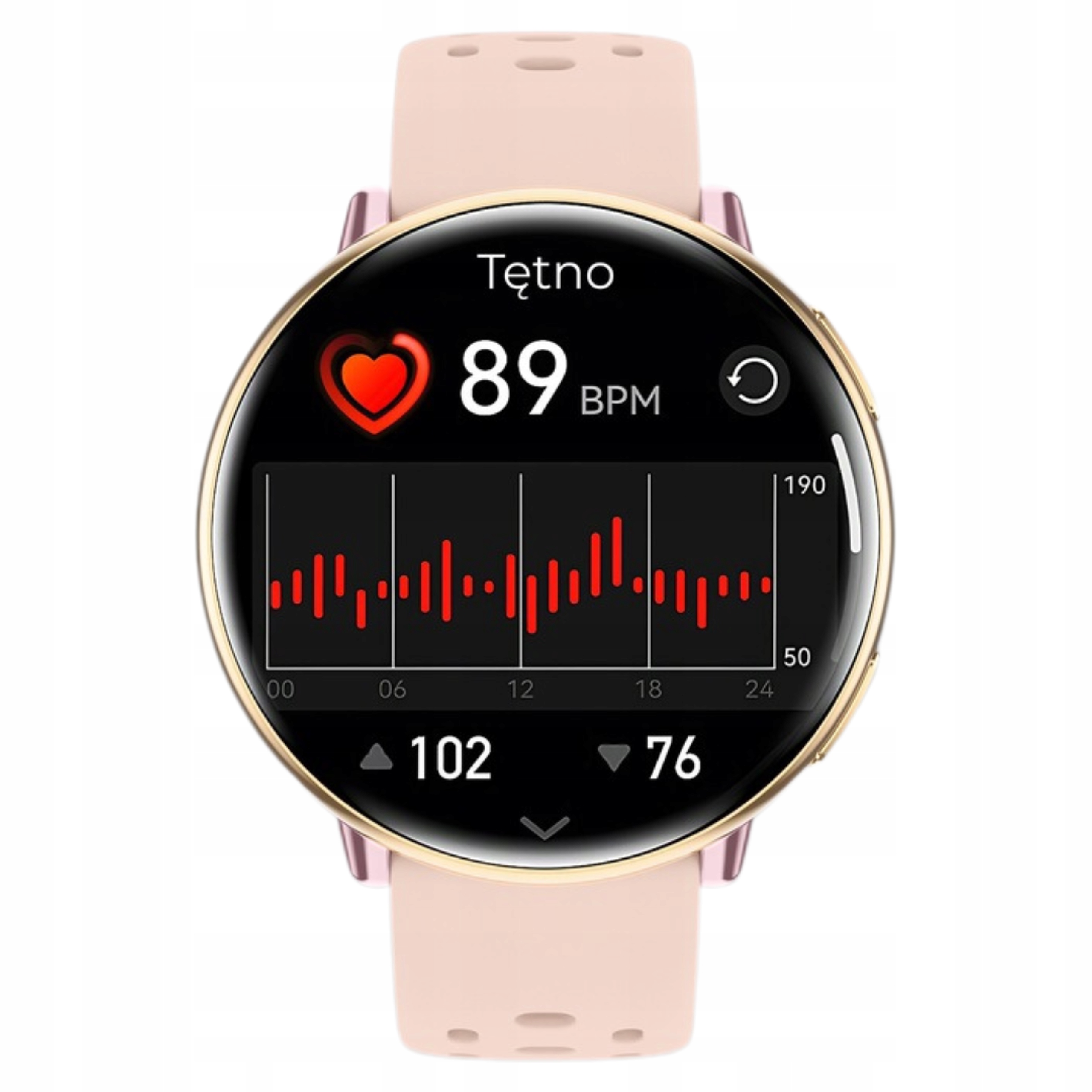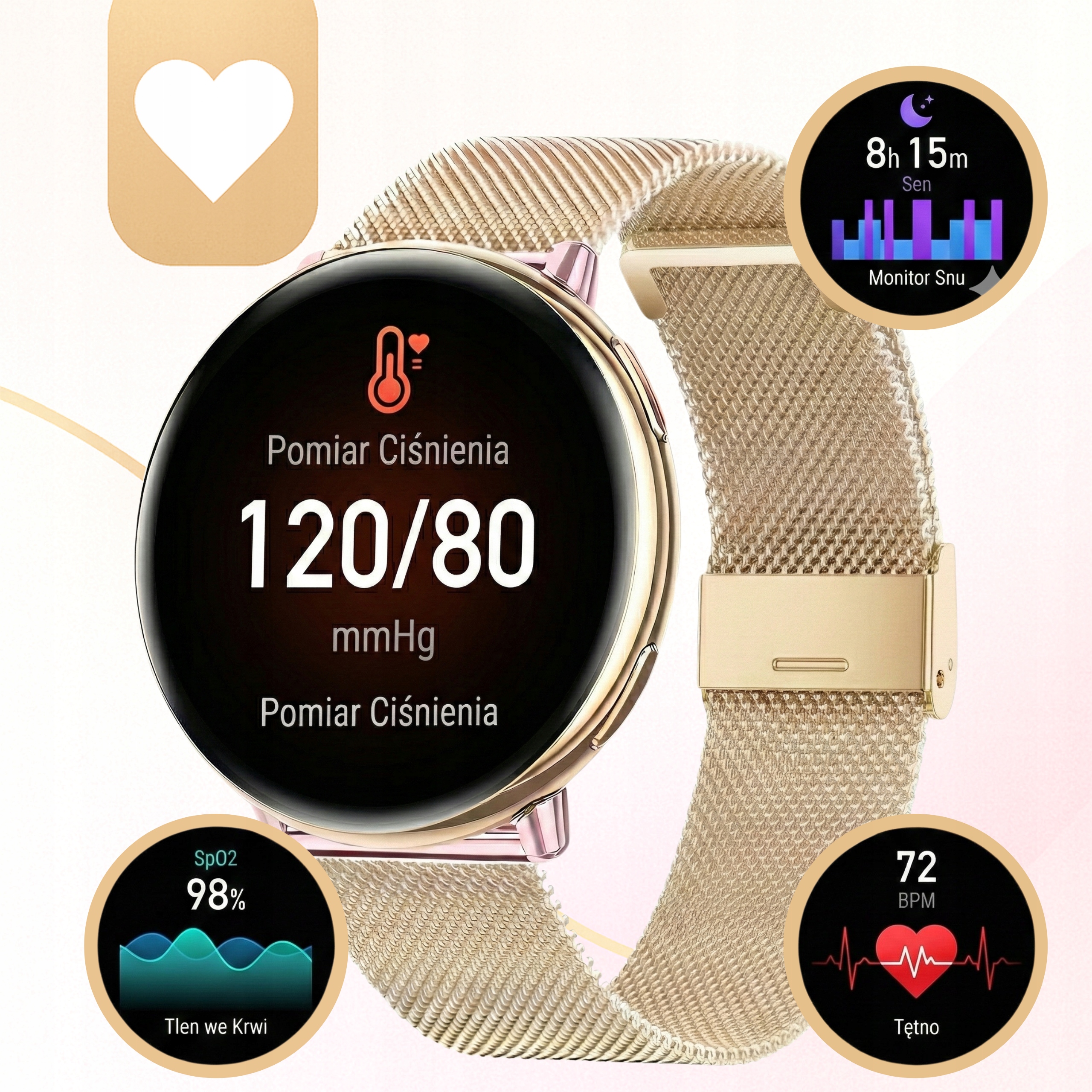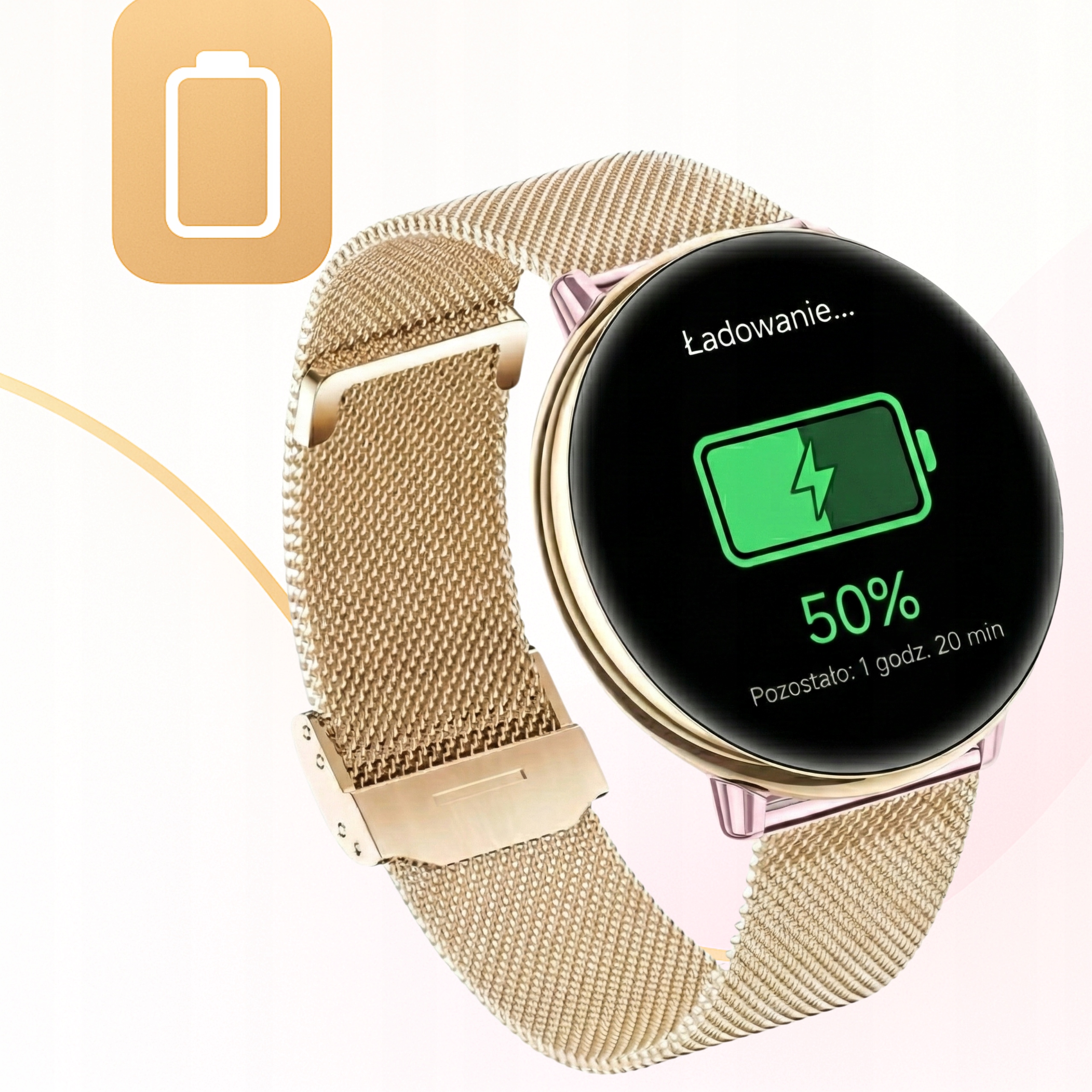 Złota koperta, kobiecy design i lekka konstrukcja sprawiają, że zegarek wygląda jak biżuteria, a jednocześnie pozwala odbierać powiadomienia, dbać o zdrowie, monitorować aktywność i prowadzić rozmowy.