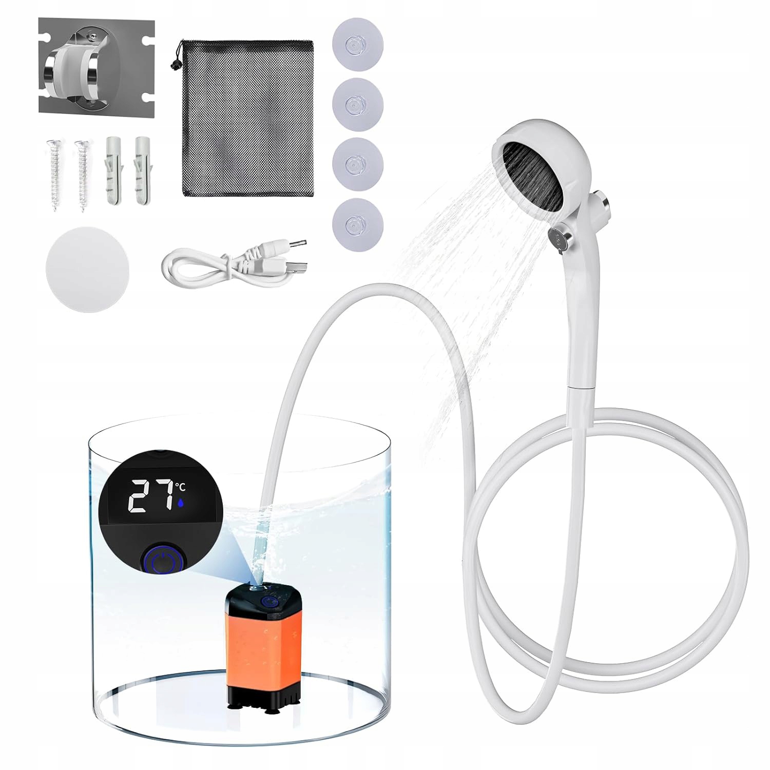 Lista rzeczy do spakowania: Pompa wodna*1 Prysznic*1 Wąż 2m*1 Uchwyt prysznicowy*1 Przyssawki*4 Kabel do ładowania USB*1 Akcesoria śrubowe* 1 sztuka Instrukcja obsługi*1 Torba do przechowywania*1