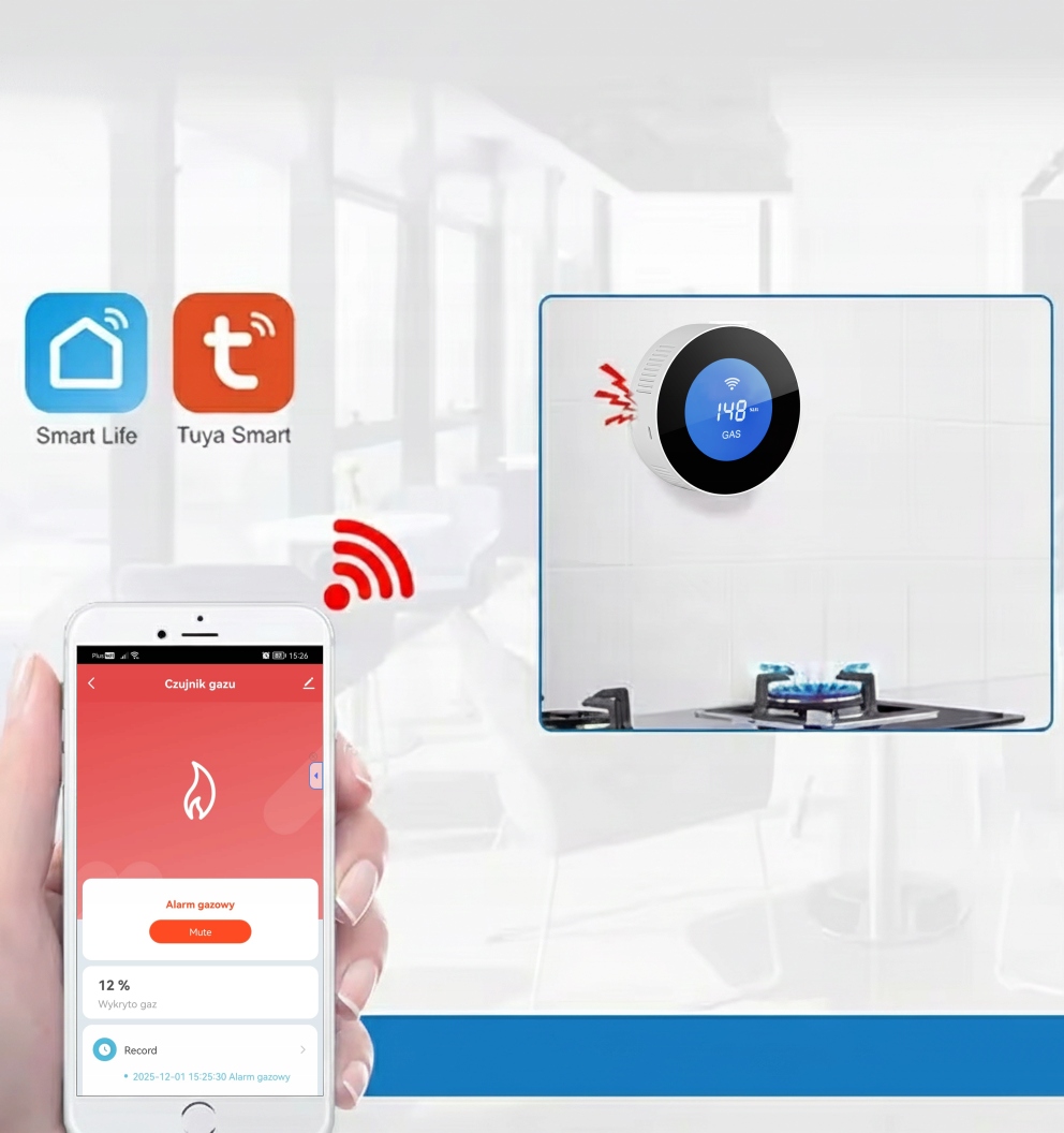 Czujnik łączy się z aplikacją "Tuya" lub "Smart life" na telefon, w przypadku wykrycia niebezpiecznego gazu niezwłocznie przesyła powiadomienie na urządzenie mobilne, wystarczy połączenie z internetem.