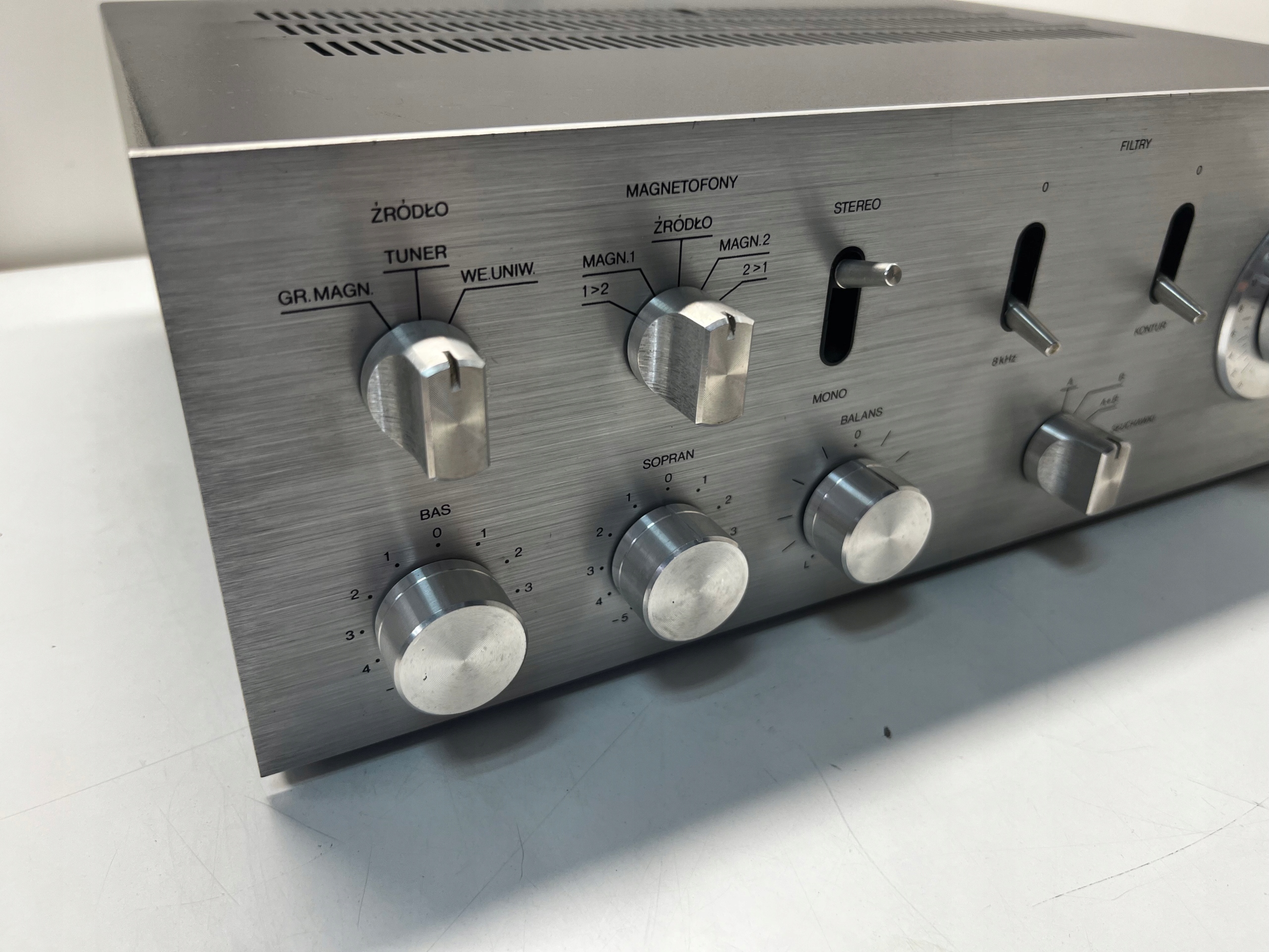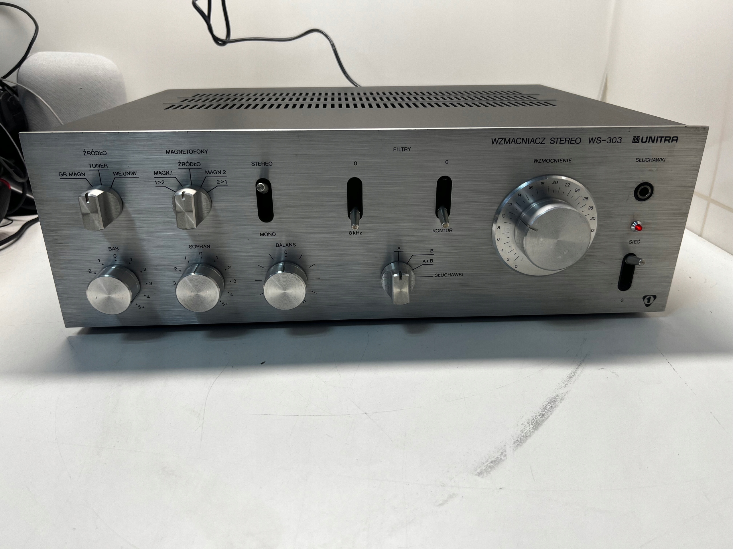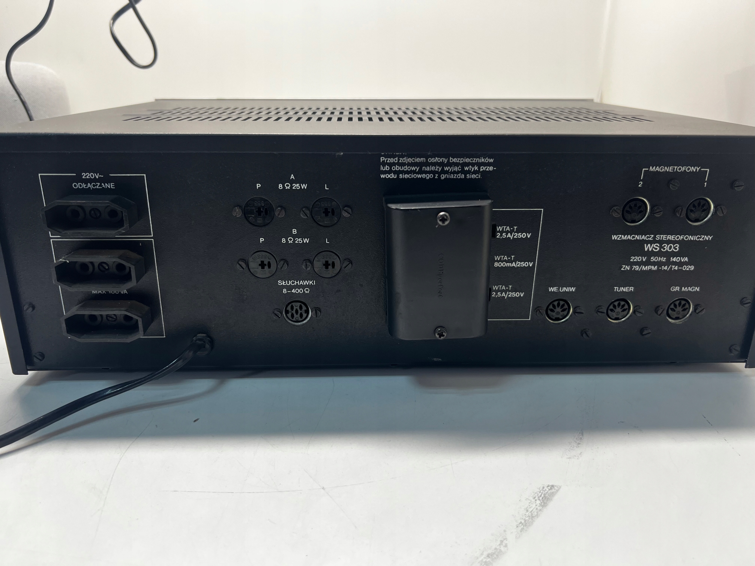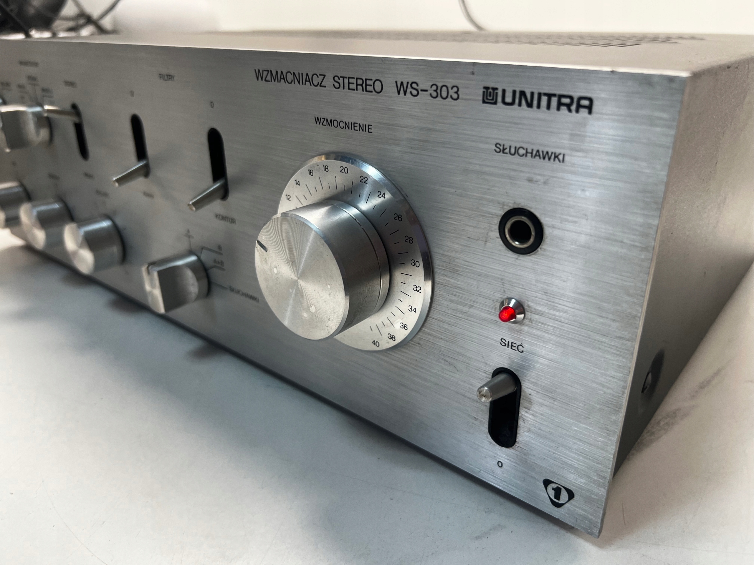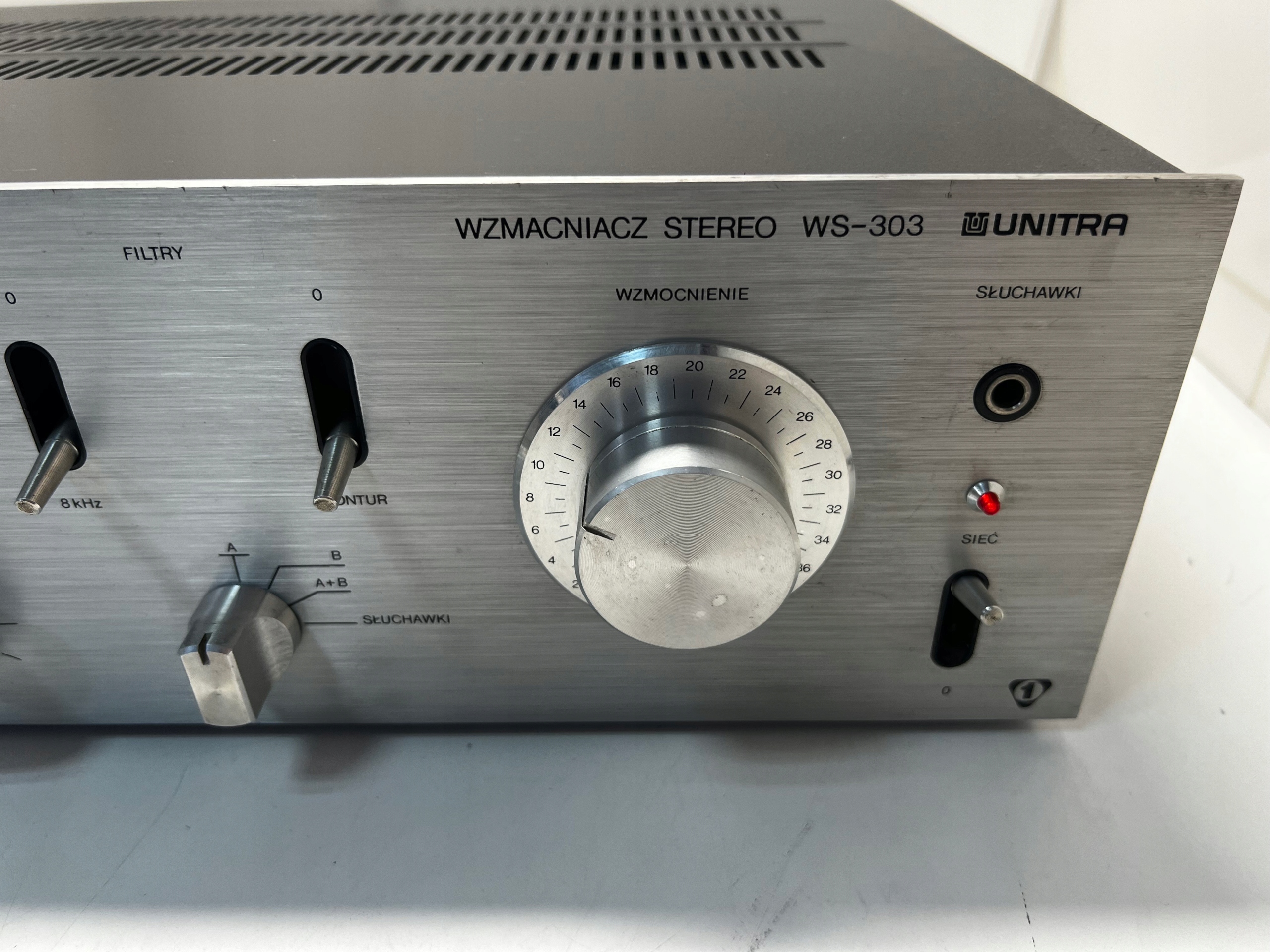 Unitra WS-303 to klasyczny polski wzmacniacz stereofoniczny z końcówki lat 70. i początku 80. XX wieku. Konstrukcja w części tranzystorowa, w solidnej metalowej obudowie z charakterystycznym aluminiowym frontem. Prosty układ toru audio oraz klasyczne analogowe sterowanie sprawiają, że urządzenie jest cenione przez miłośników sprzętu vintage i brzmienia epoki PRL. Wzmacniacz posiada możliwość podłączenia dwóch par kolumn (A/B) oraz wejście gramofonowe z przedwzmacniaczem dla wkładki MM. Nadaje się do systemów domowych o niewielkiej lub średniej powierzchni.