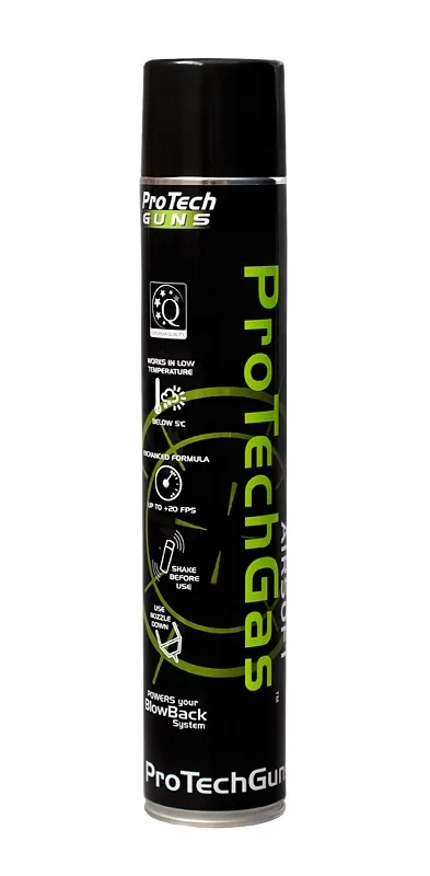 ProTechGas (Green Gas) przeznaczony jest do zasilania replik ASG o uśrednionym ciśnieniu. Uśrednione ciśnienie pozwala na stosowanie go we wszystkich replikach, bez obawy o uszkodzenie któregokolwiek elementu. Jego składnikiem jest olejek silikonowy, który zabezpiecza i smaruje elementy repliki, a jego proporcja została dobrana w taki sposób, aby broń pozostawała czysta po użyciu.