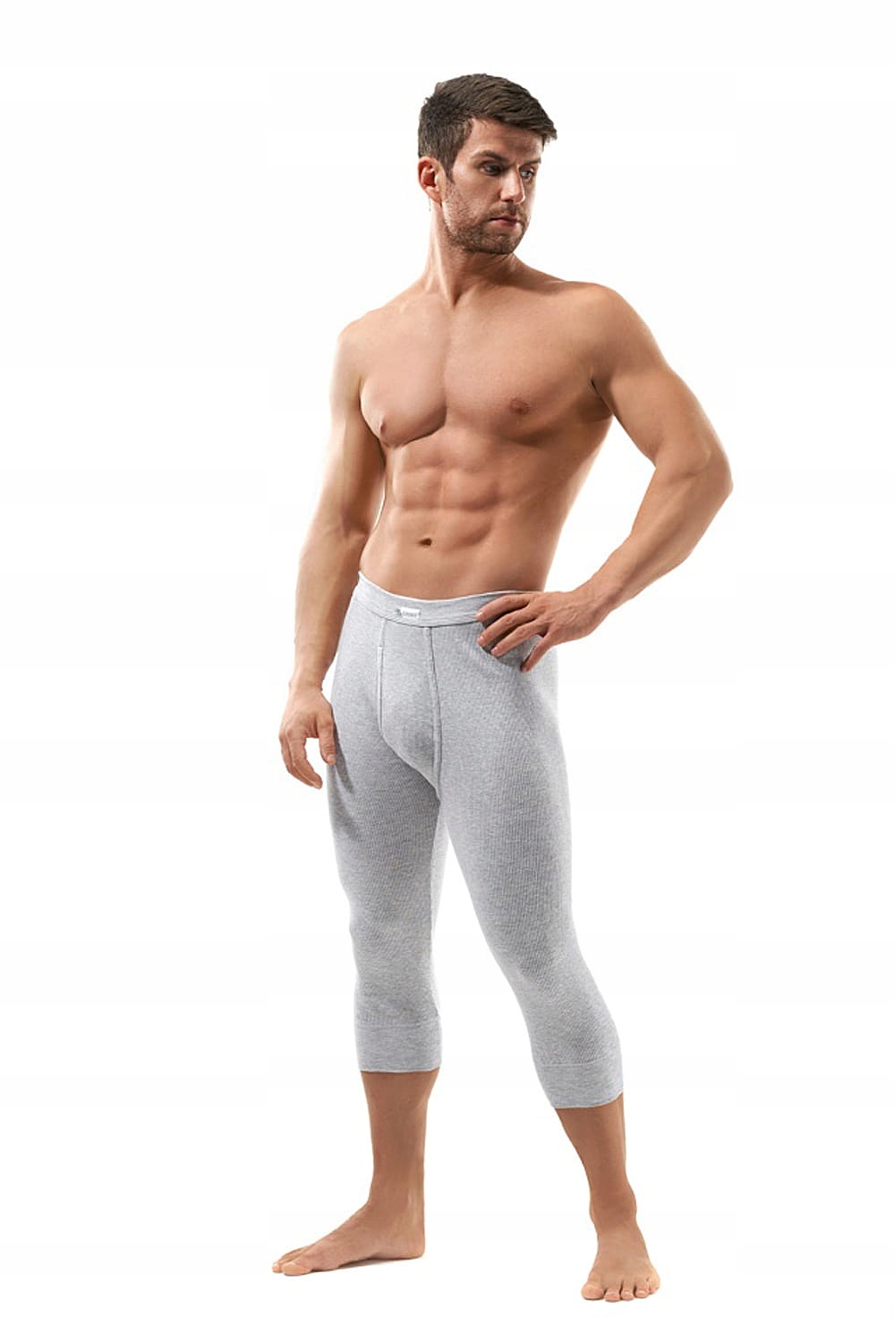 Kalesony męskie z rozporkiem, długości 3/4. Wyjątkowo wygodne! Wykonane z dzianiny bawełnianej o strukturze prążka, która zachowuje kształt produktu i łatwo dopasowuje się do sylwetki. W pasie zamiast gumy zastosowano tzw. elaston (miękka dzianina ściągaczowa z bardzo wysoką domieszką lycry) produkowany na maszynach okrągłych o średnicach dostosowanych do poszczególnych rozmiarów.