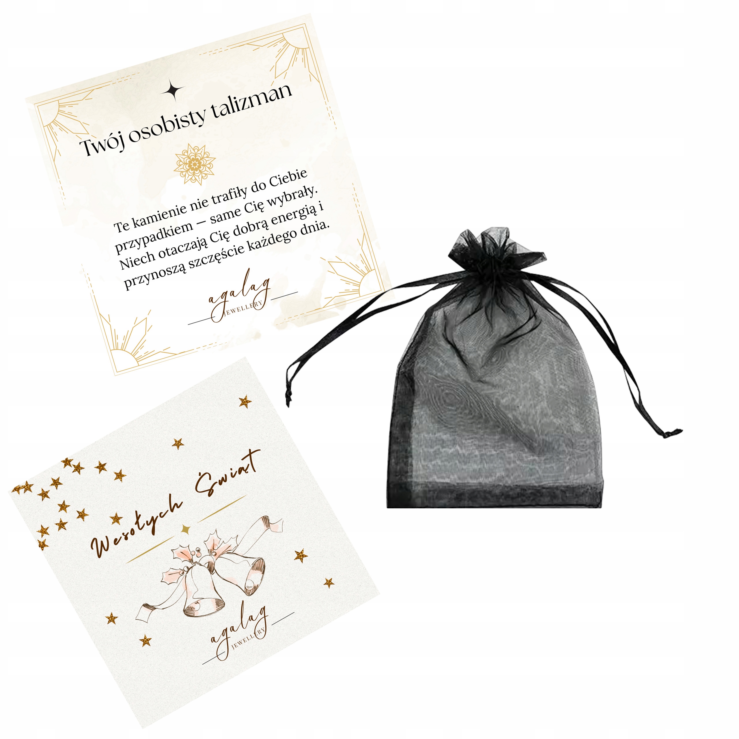 Do każdej bransoletki dołączona jest ozdobna sakiewka, która podkreśla charakter biżuterii, oraz dwa bileciki premium wykonane na grubym, matowym papierze kredowym 350 g.