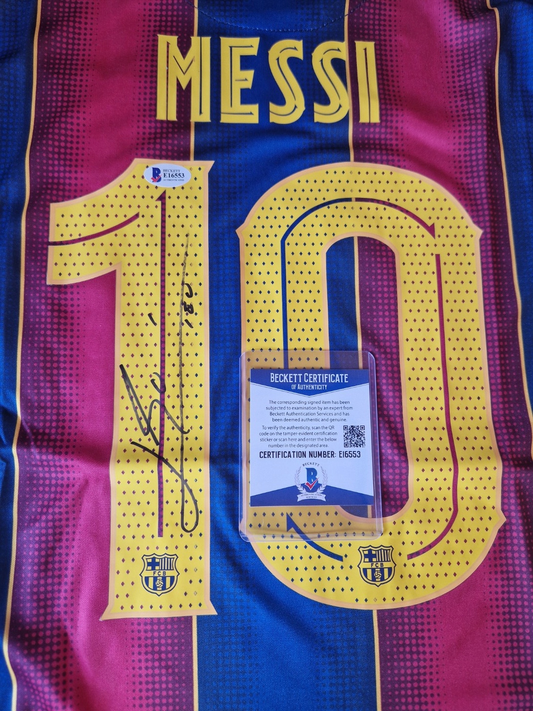Koszulka z certyfikatem autentyczności Beckett w formie hologramu na koszulce z indywidualnym numerem seryjnym i kodem qr + zgodny certyfikat w ramie. Koszulka pochodzi z jednej z wielu komercyjnej sesji składania autografów.
