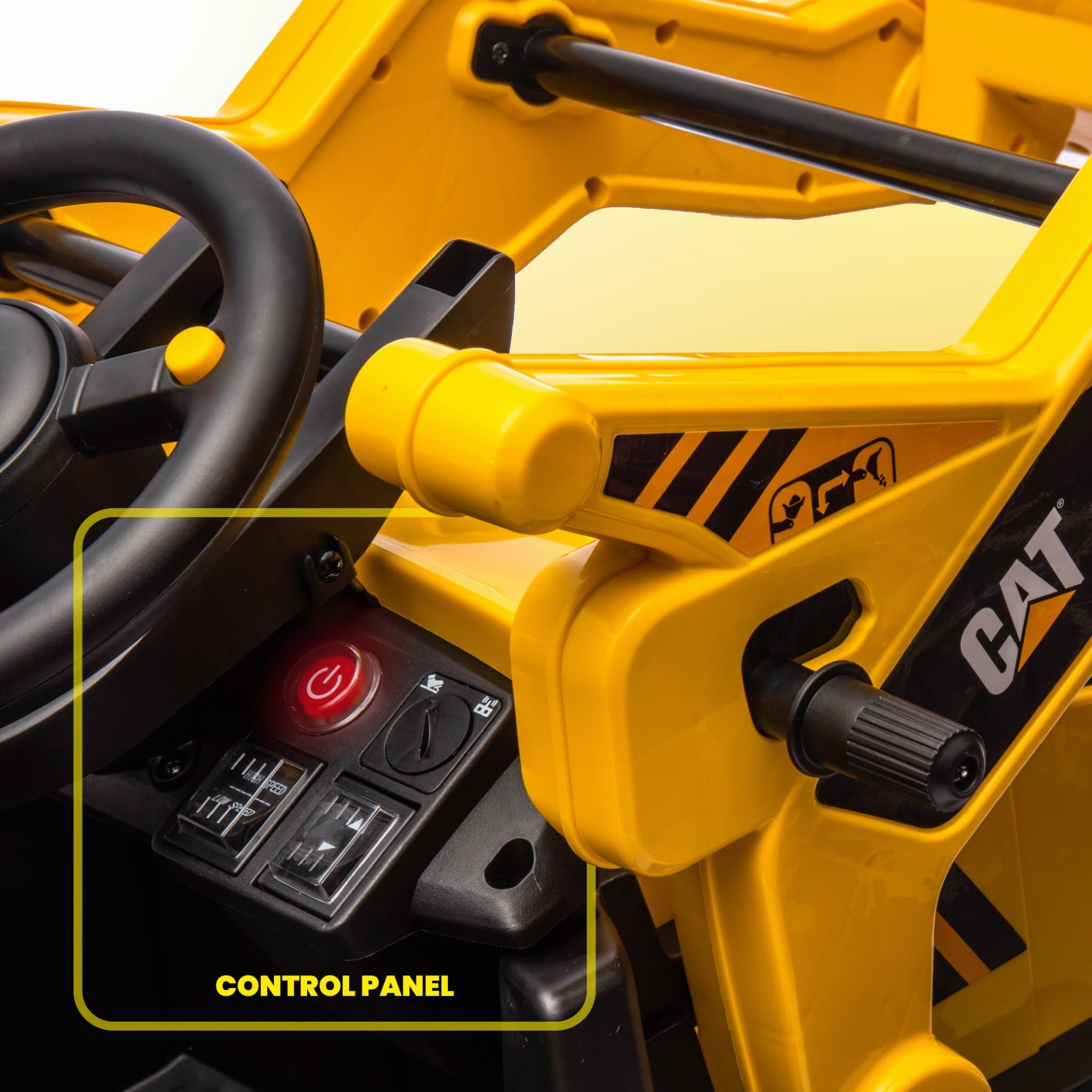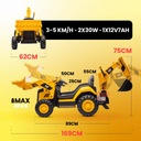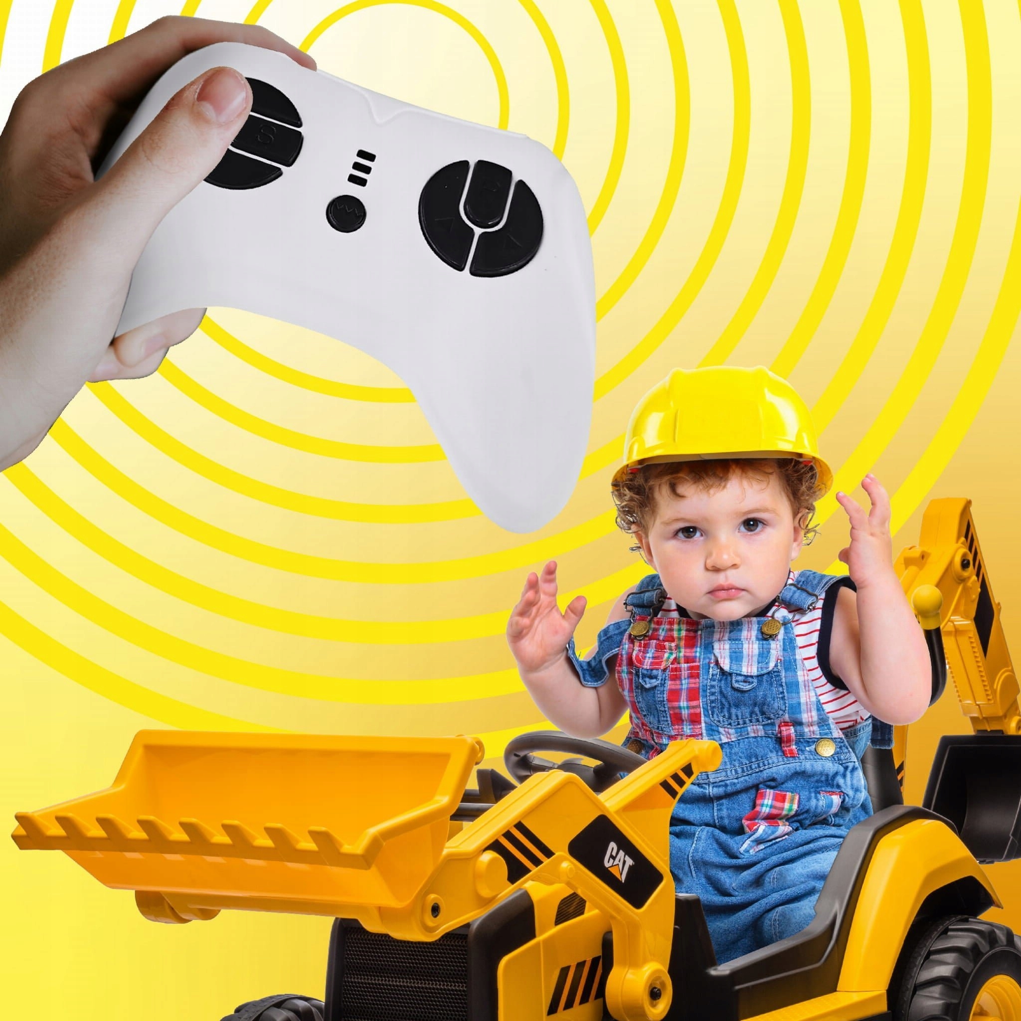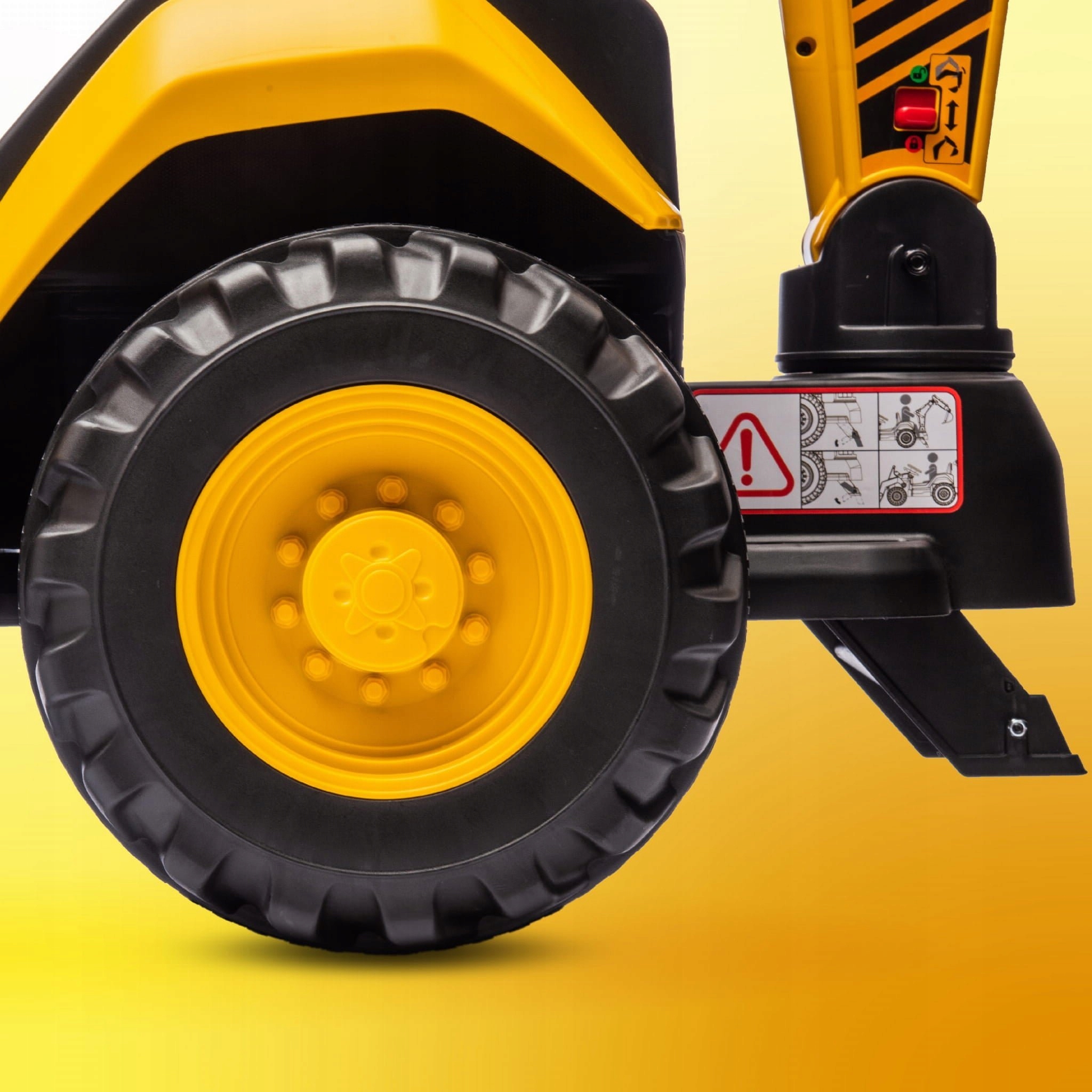 Koparka wyposażona jest w tryb sterowania zarówno dla dziecka (kierownica i pedał gazu), jak i rodzica (pilot). Funkcja całkowitego odłączenia prądu oraz czerwony przycisk zasilania zapewniają maksymalne bezpieczeństwo użytkowania.