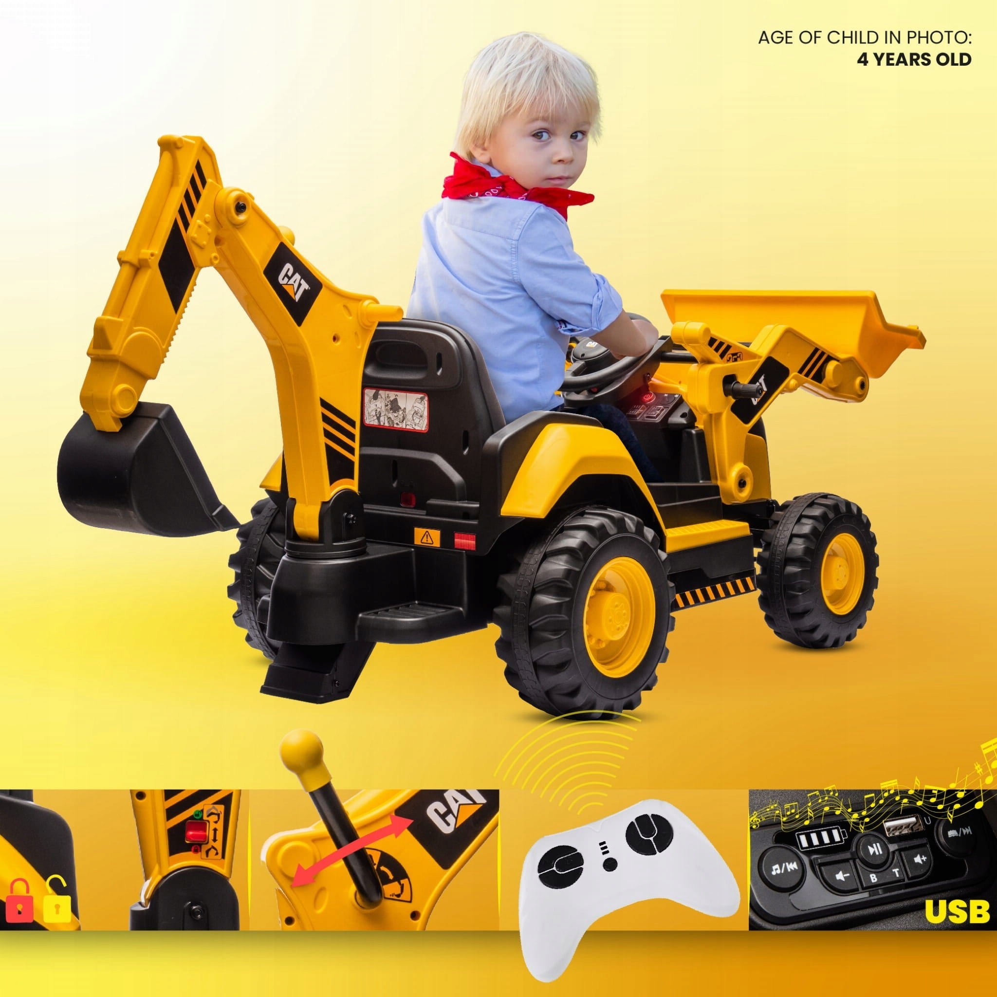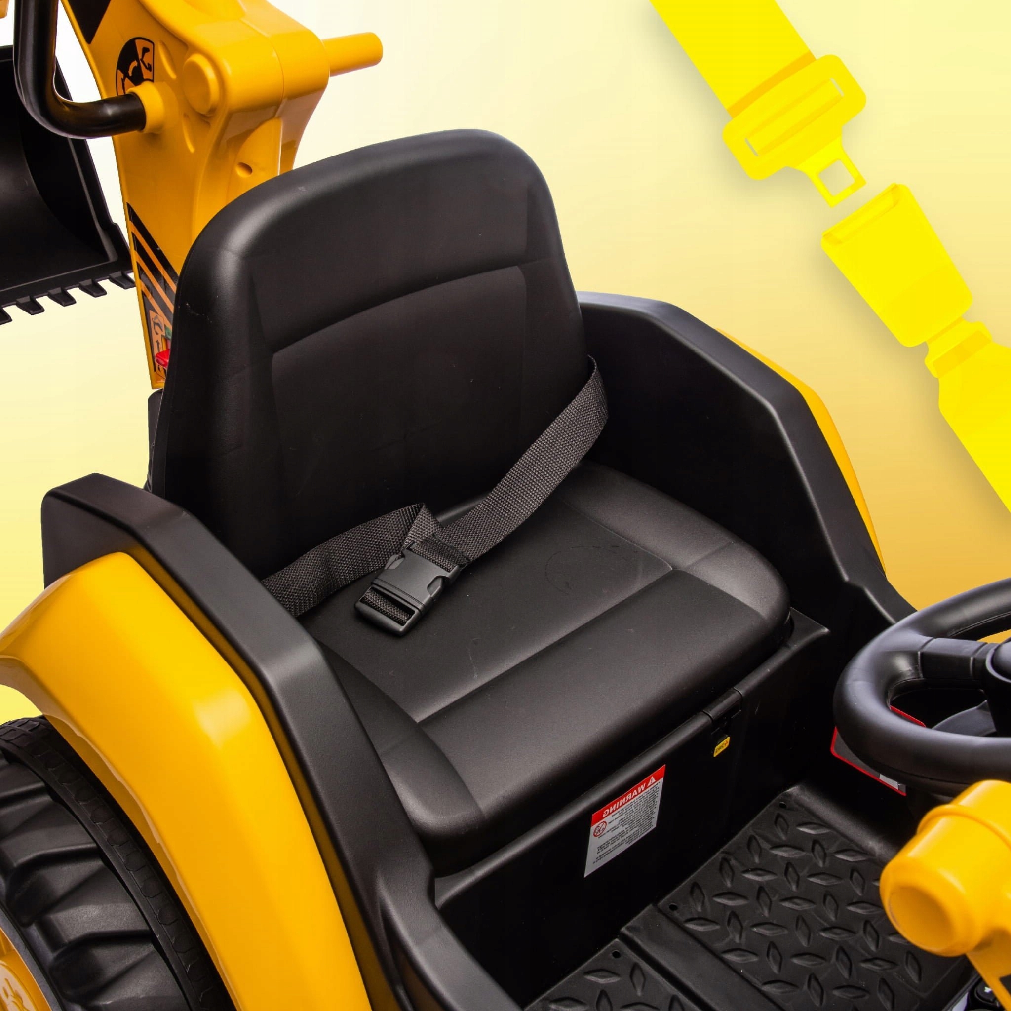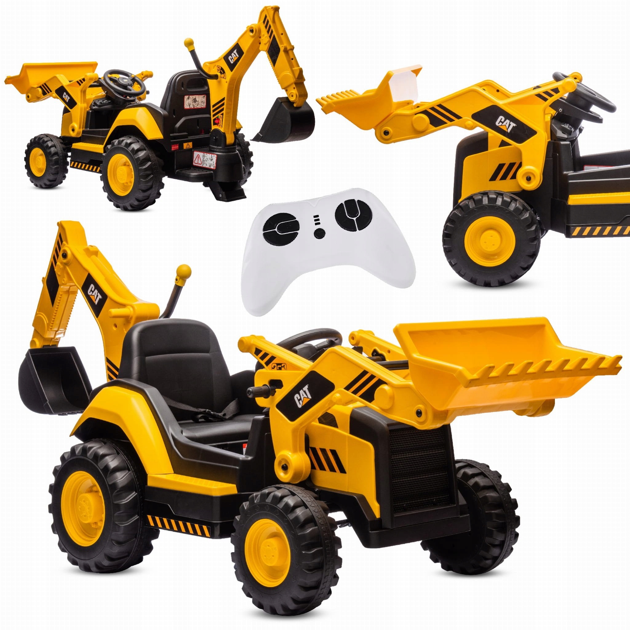 Koparka wyposażona jest w tryb sterowania zarówno dla dziecka (kierownica i pedał gazu), jak i rodzica (pilot). Funkcja całkowitego odłączenia prądu oraz czerwony przycisk zasilania zapewniają maksymalne bezpieczeństwo użytkowania.