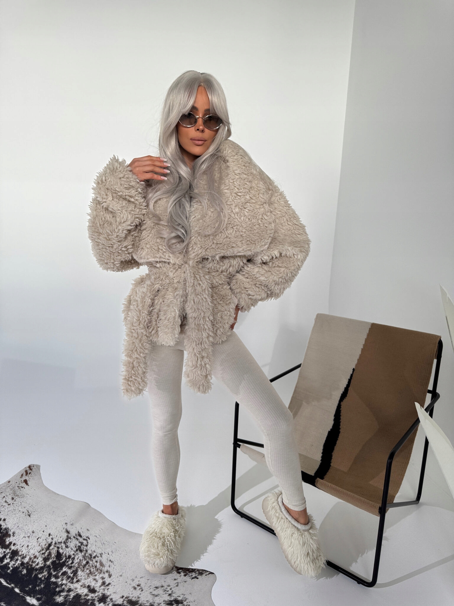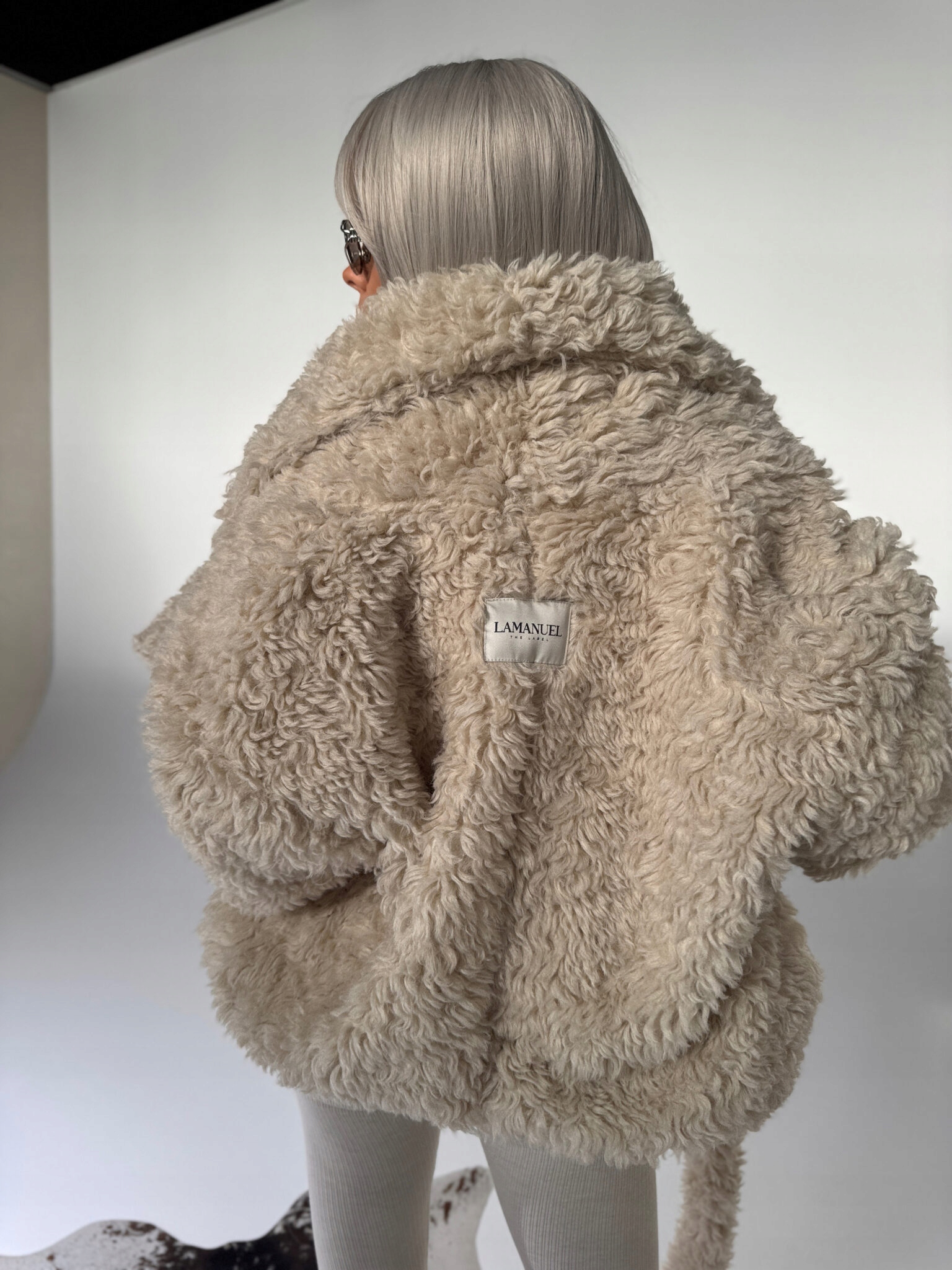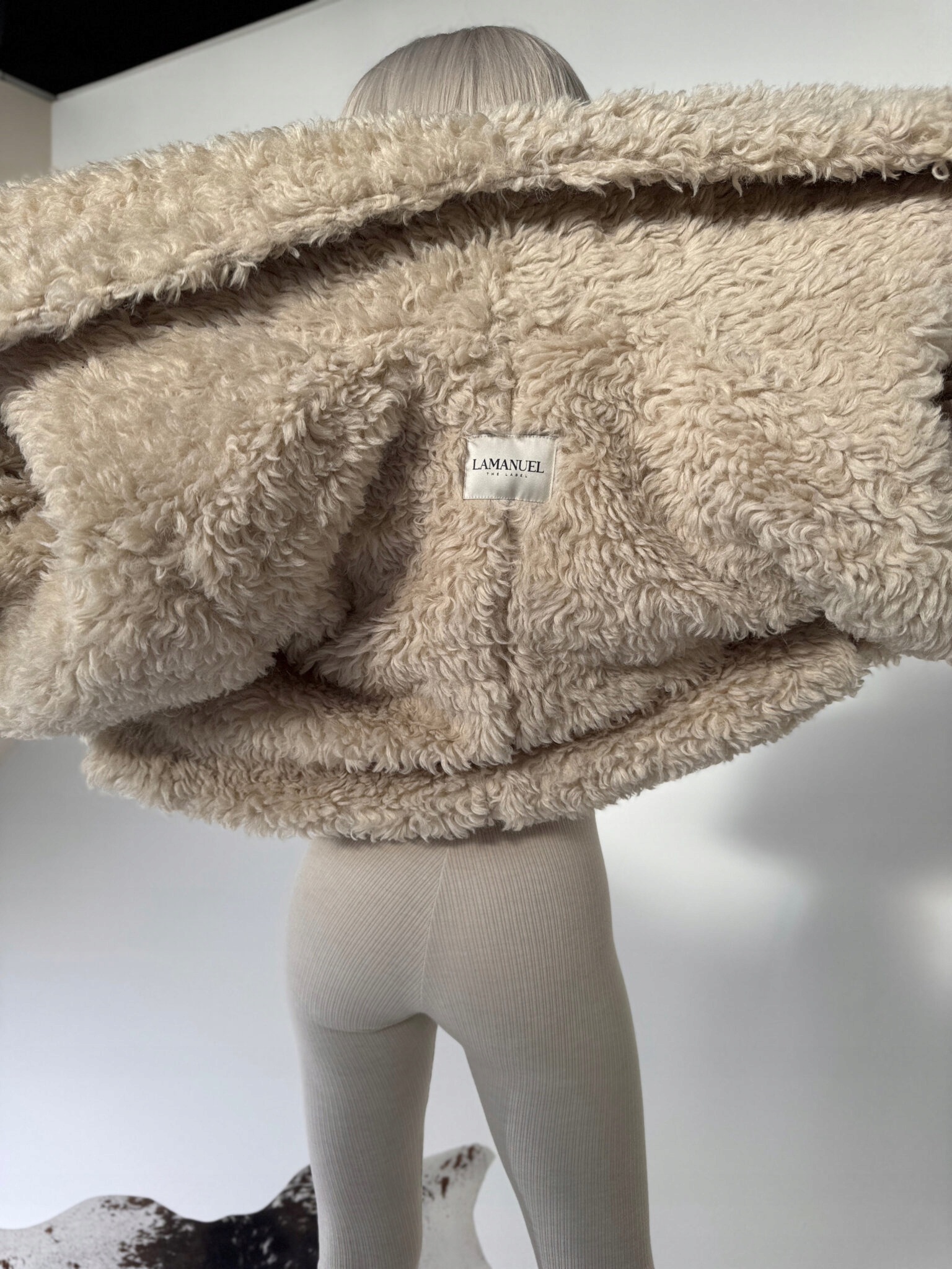 Futro, które mówi samo za siebie. Mięsiste, puszyste, z szerokim kołnierzem i nonszalanckim fasonem – wygląda jak luksus, czuje się jak koc. Pasek w talii pozwala nosić je swobodnie lub bardziej zdefiniowanie, w zależności od nastroju. Na plecach naszywka LAMANUEL, która dyskretnie przypomina, że styl ma znaczenie. To nie jest kolejna zimowa narzutka – to statement piece, który robi całą stylizację.