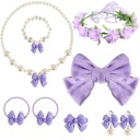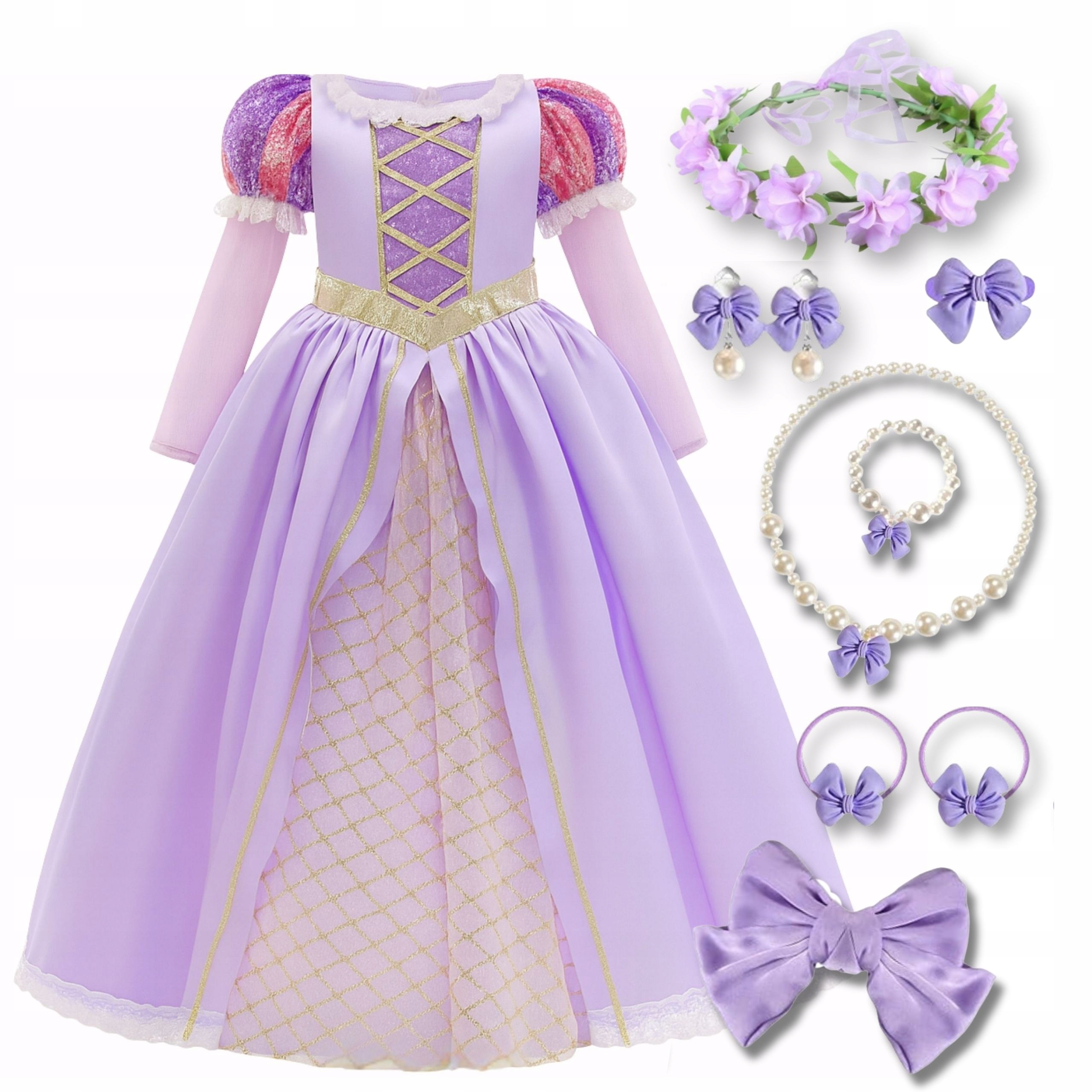 Zestaw uzupełniają dopasowane akcesoria: • naszyjnik i bransoletka z imitacji pereł z uroczą fioletową kokardką, • lawendowy wianek podkreślający dziewczęcy urok, • duża kokarda do włosów, • kolczyki z kokardkami i perełkami (klipsy), • śliczny pierścionek z kokardką.