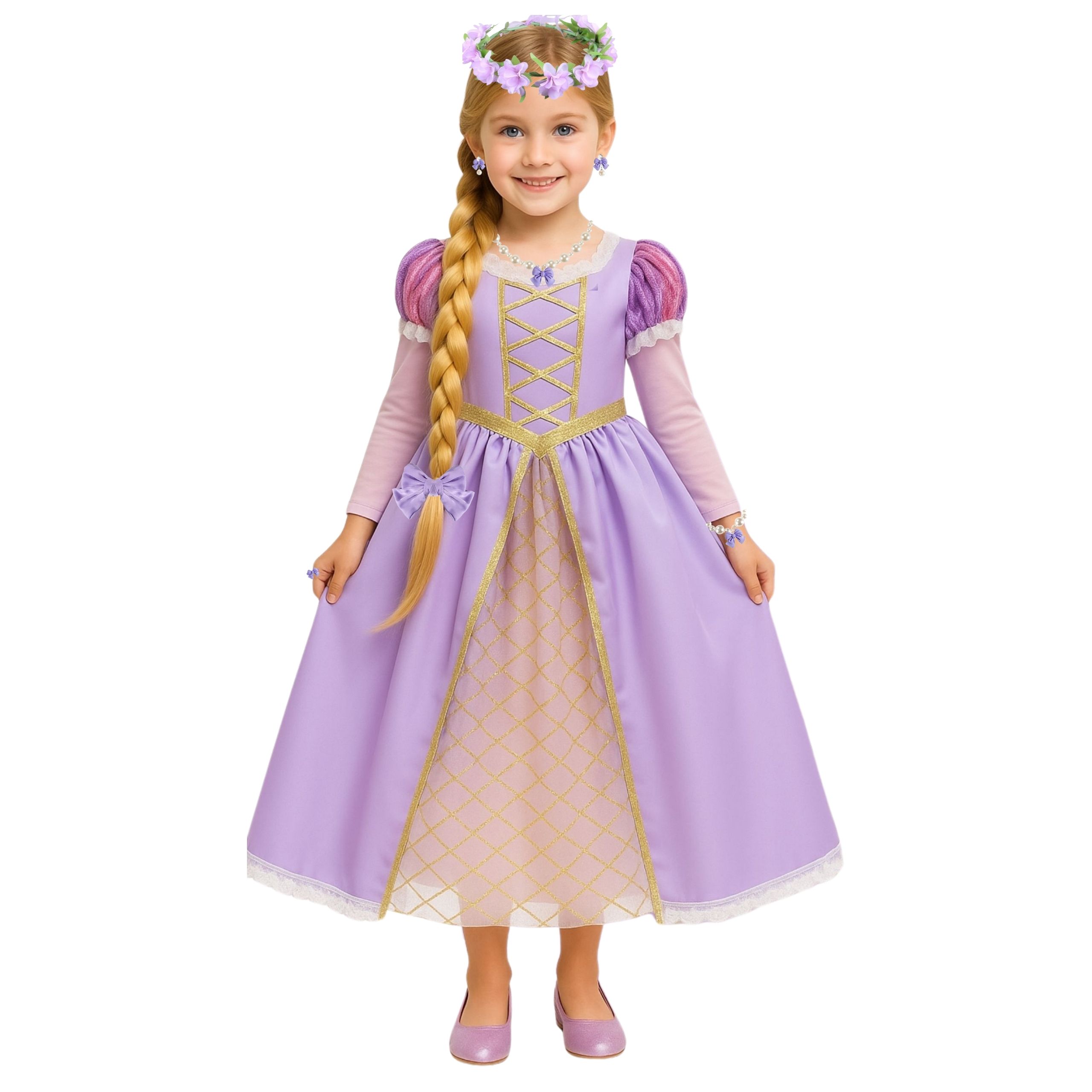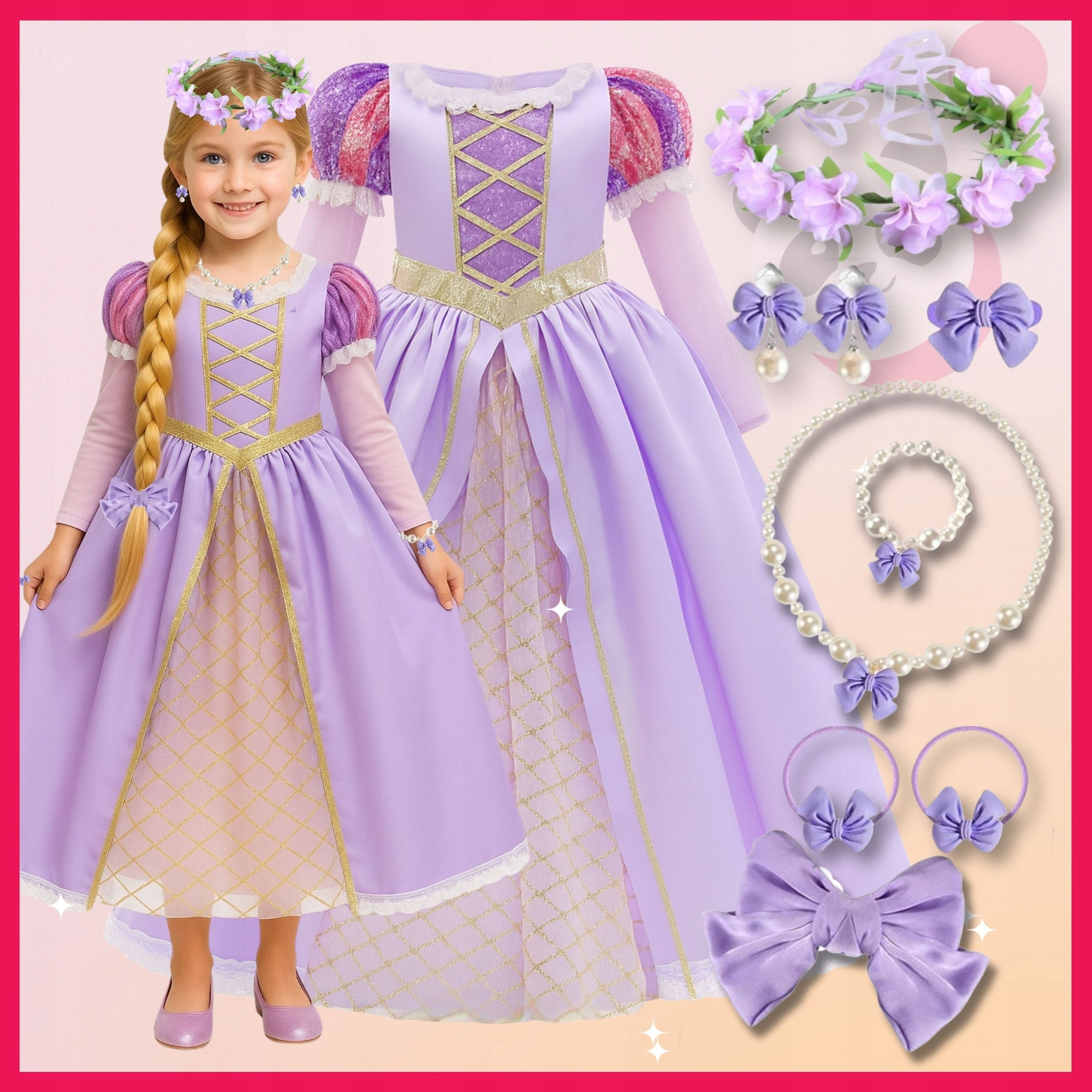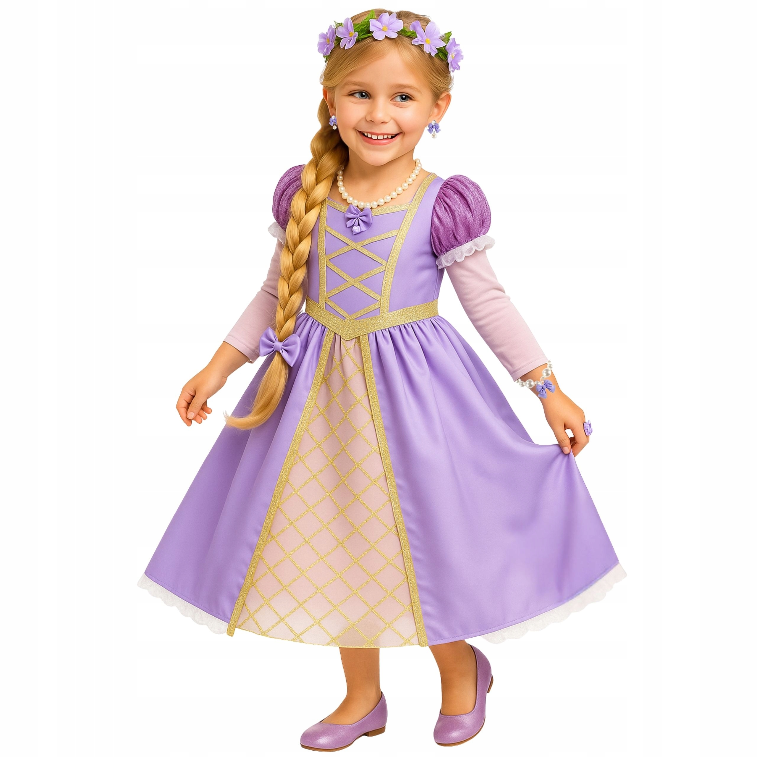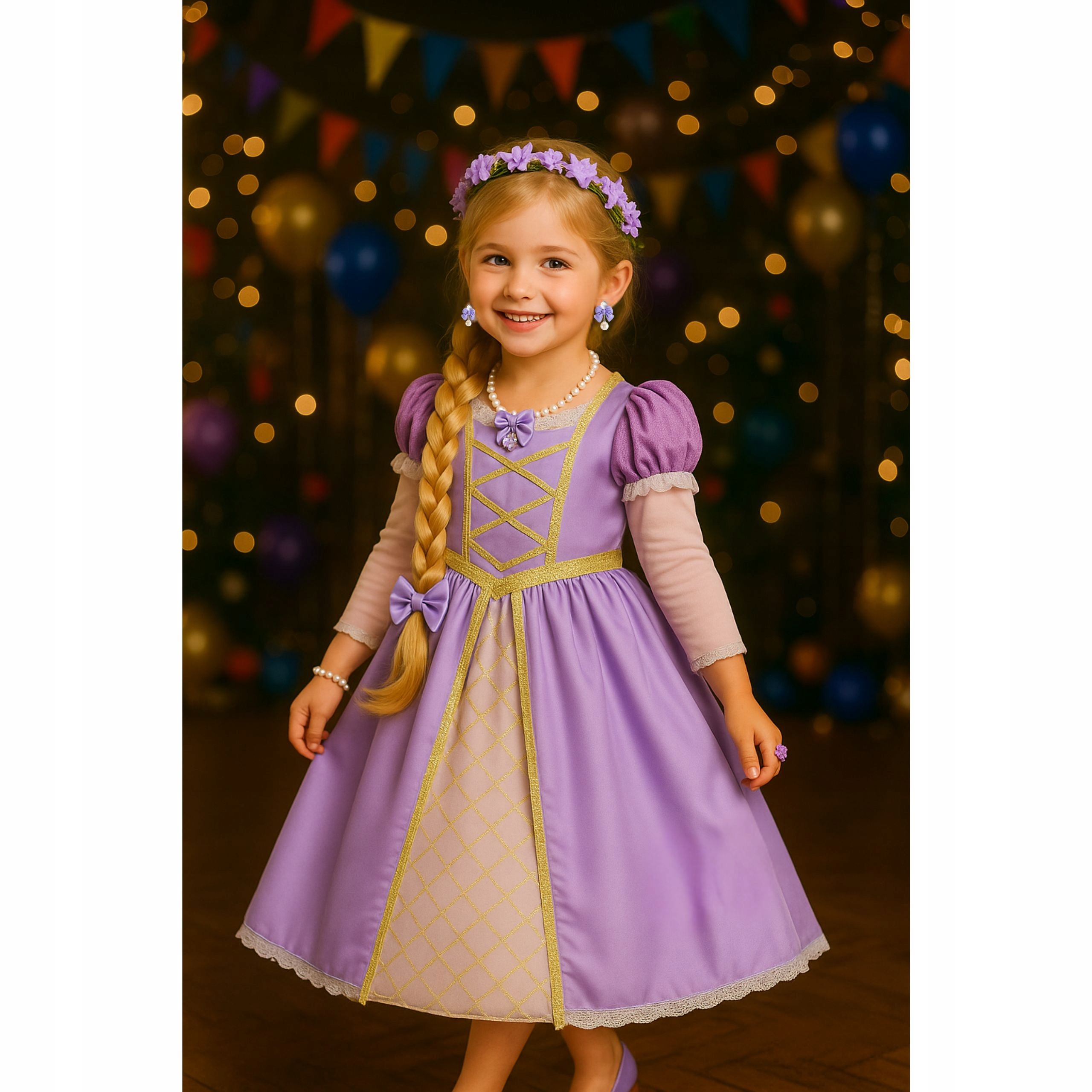 ✔️ Kompletny zestaw księżniczki – sukienka + biżuteria + wianek + dodatki.