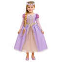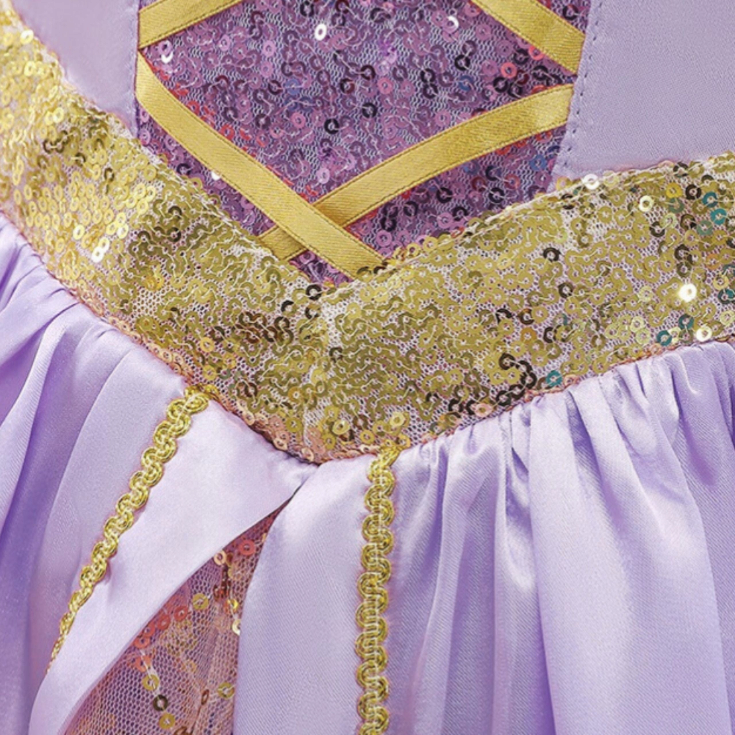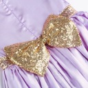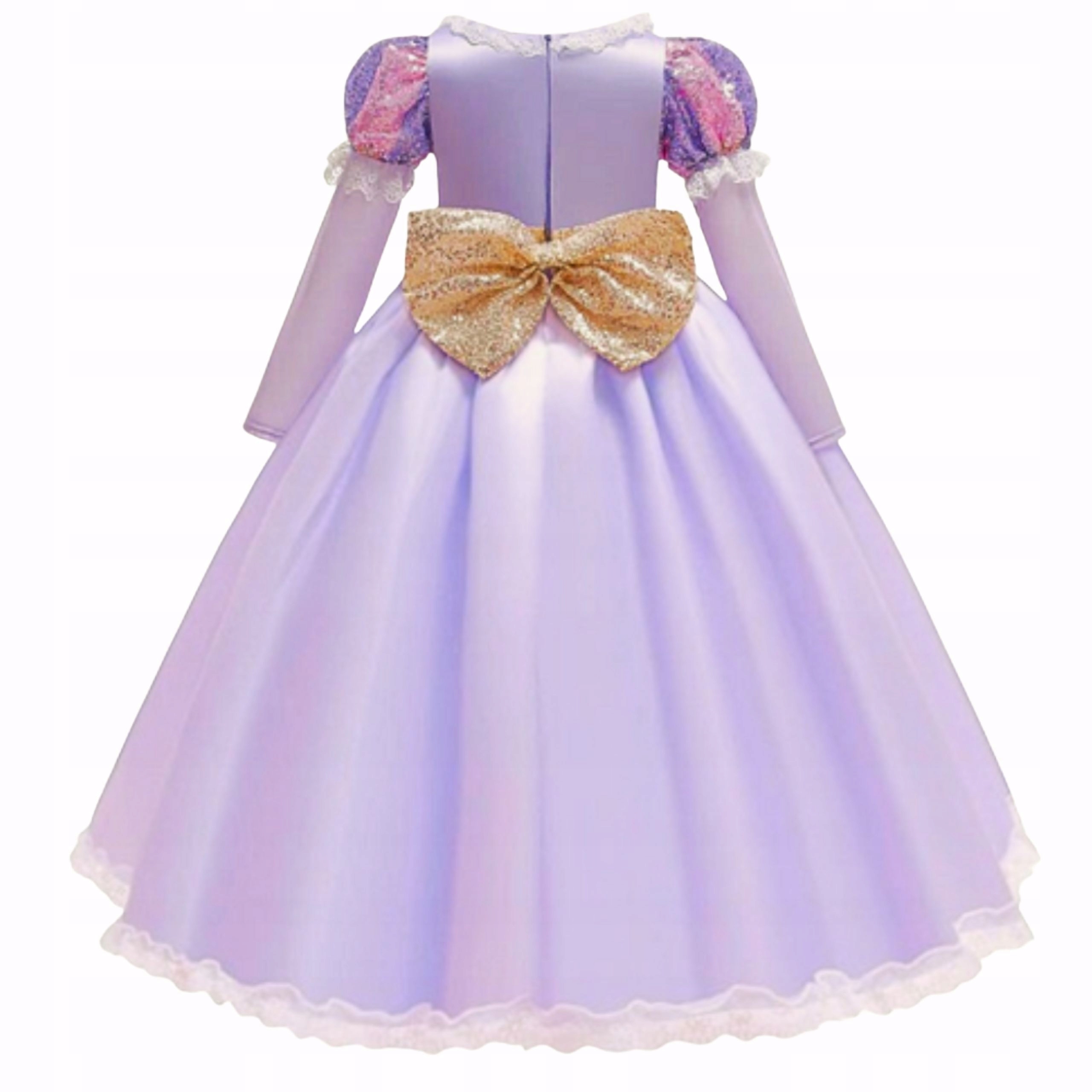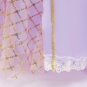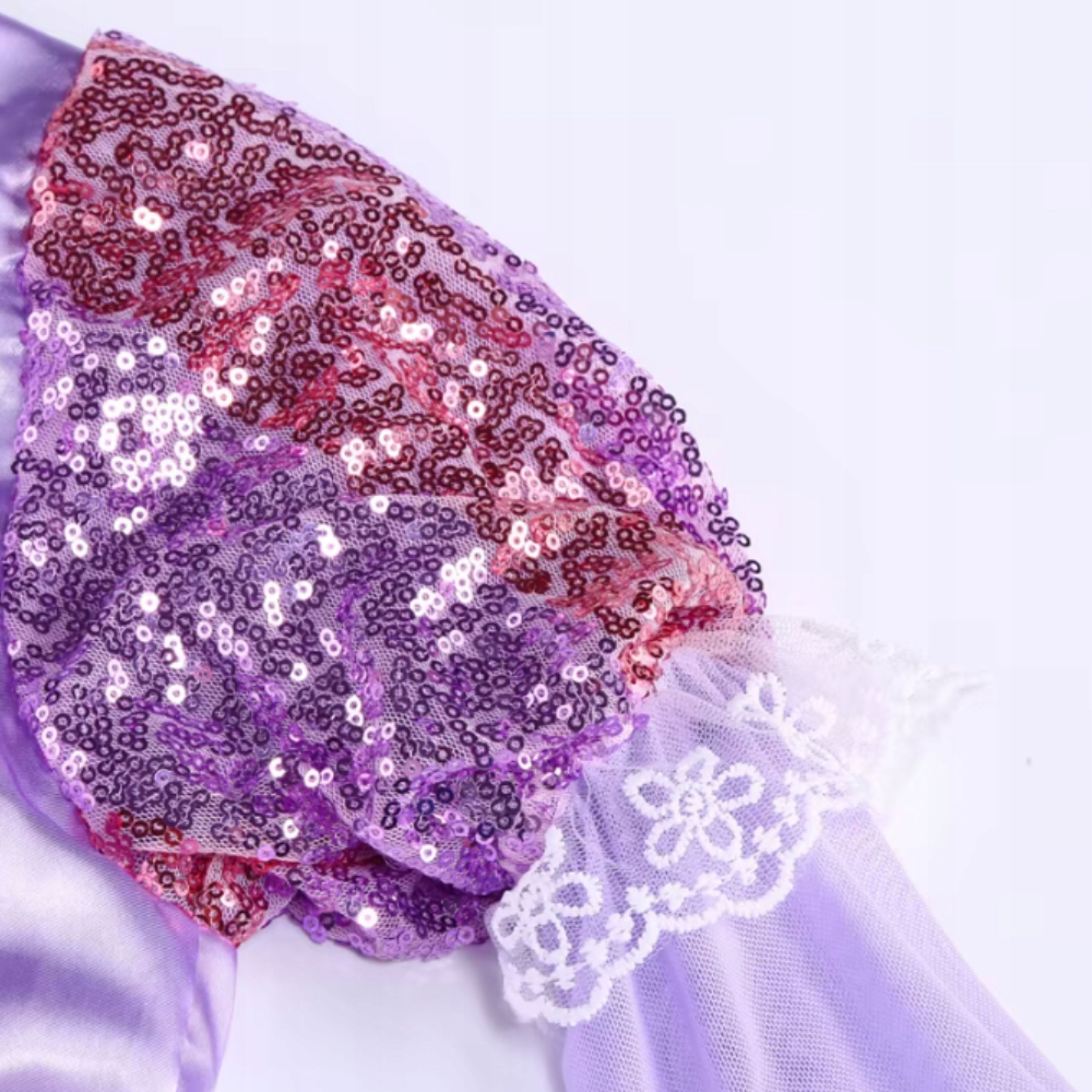 Przepiękna, bajkowa sukienka, która przenosi każdą dziewczynkę w świat magicznych opowieści o odważnej księżniczce. Uszyta z miękkich, atłasowych tkanin w odcieniach fioletu i różu, zachwyca delikatnymi białymi i złotymi zdobieniami oraz migoczącymi cekinami na gorsecie. Góra posiada bawełnianą podszewkę, a dół tworzą trzy warstwy: lekka poliestrowa, sztywny tiul i połyskująca warstwa atłasowa. Całość wykończona jest subtelną, ażurową koronką.