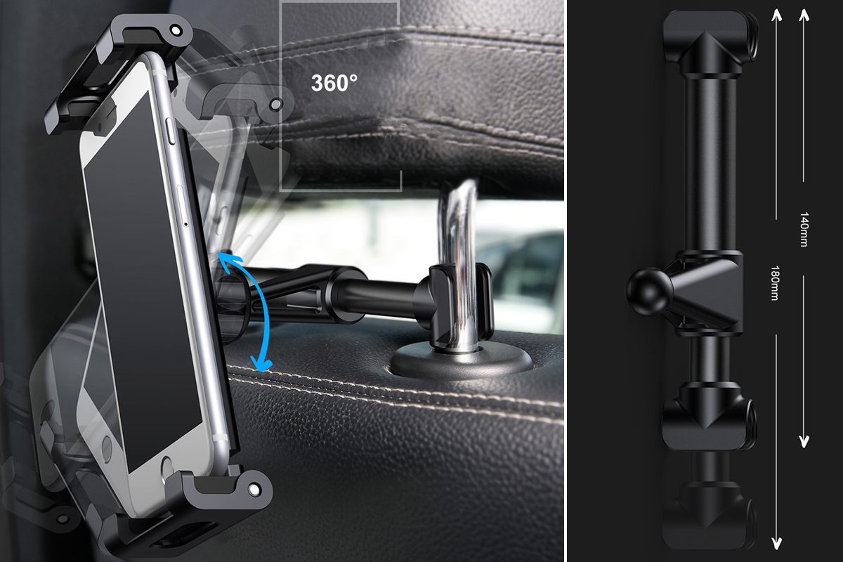 Jego obrót o 360 stopni umożliwia łatwą regulację kąta widzenia, a szeroki zakres dopasowania do mocowań zagłówka (140-172mm) zapewnia uniwersalność użycia. Uchwyt dysponuje również praktycznymi wycięciami na kabel ładowania i słuchawki, co zwiększa wygodę użytkowania. Solidna konstrukcja zapewnia stabilność nawet na nierównych drogach, oferując możliwość ustawienia ekranu w pionie lub poziomie.