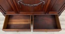 W dolnej części znajdują się dwa szerokie szuflady z dekoracyjnymi uchwytami w kształcie pierścieni. Nogi są toczone, smukłe i lekko zwężane, co nadaje całości lekkości mimo masywnej bryły.
