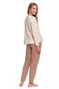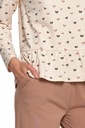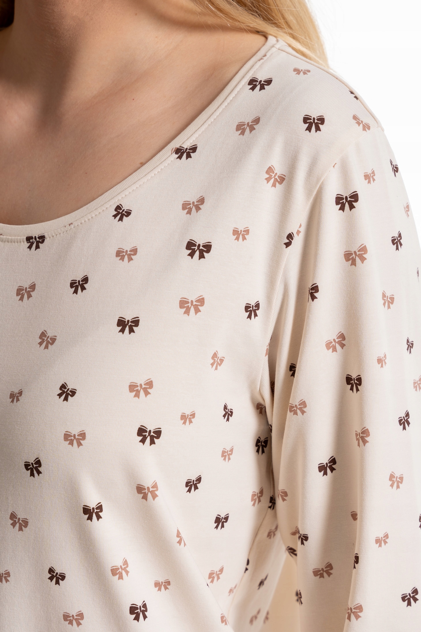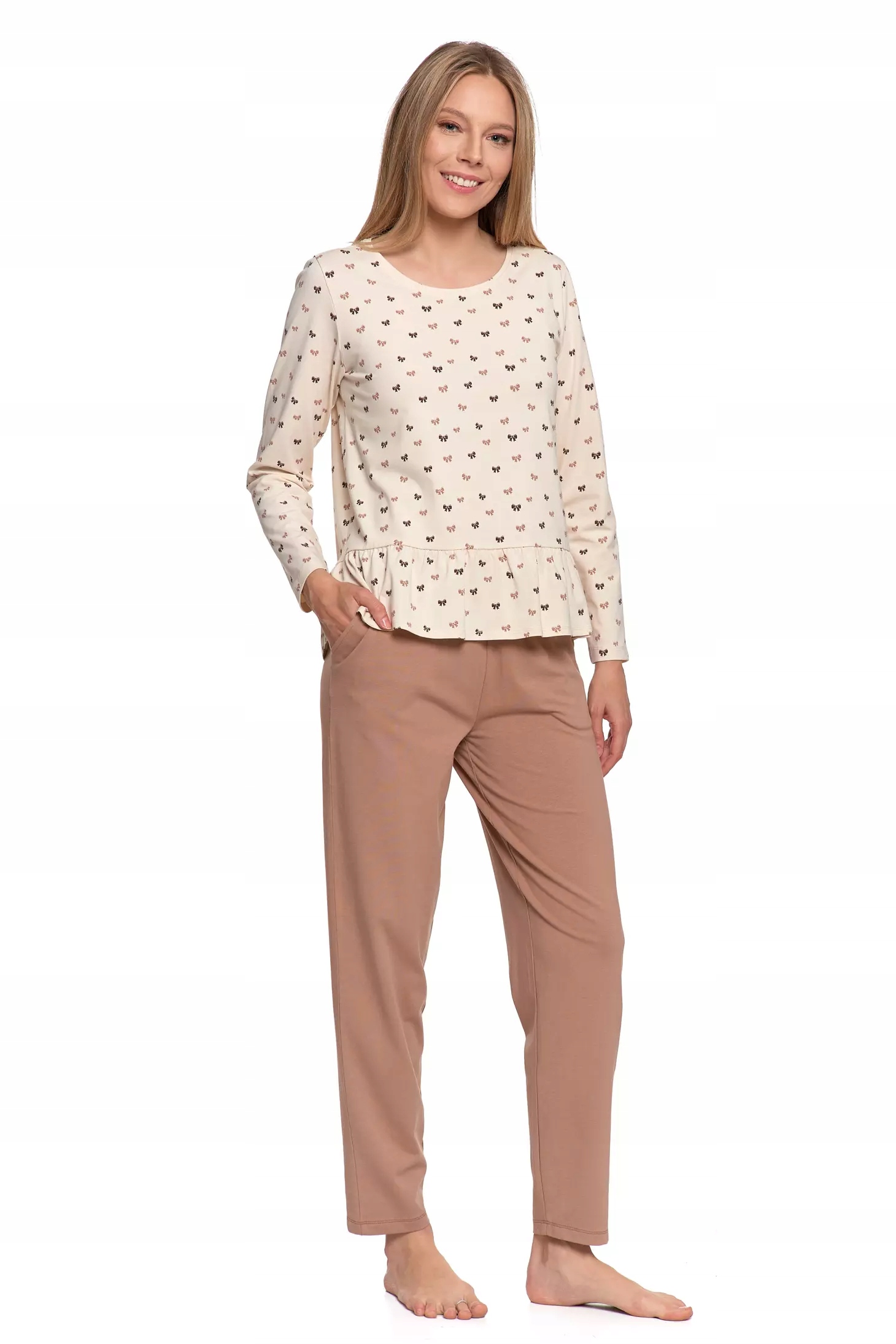 Dwuczęściowa piżama damska w delikatnym, beżowym odcieniu, ozdobiona subtelnym wzorem małych kokardek. Góra z długim rękawem i falbaną na dole nadaje całości lekko romantycznego charakteru. Spodnie o prostym kroju w stonowanym kolorze, z wygodną gumką w pasie i kieszeniami po bokach. Całość wykonana z miękkiej bawełny z dodatkiem elastanu - materiał jest przyjemny w dotyku i lekko elastyczny, co zwiększa komfort noszenia.