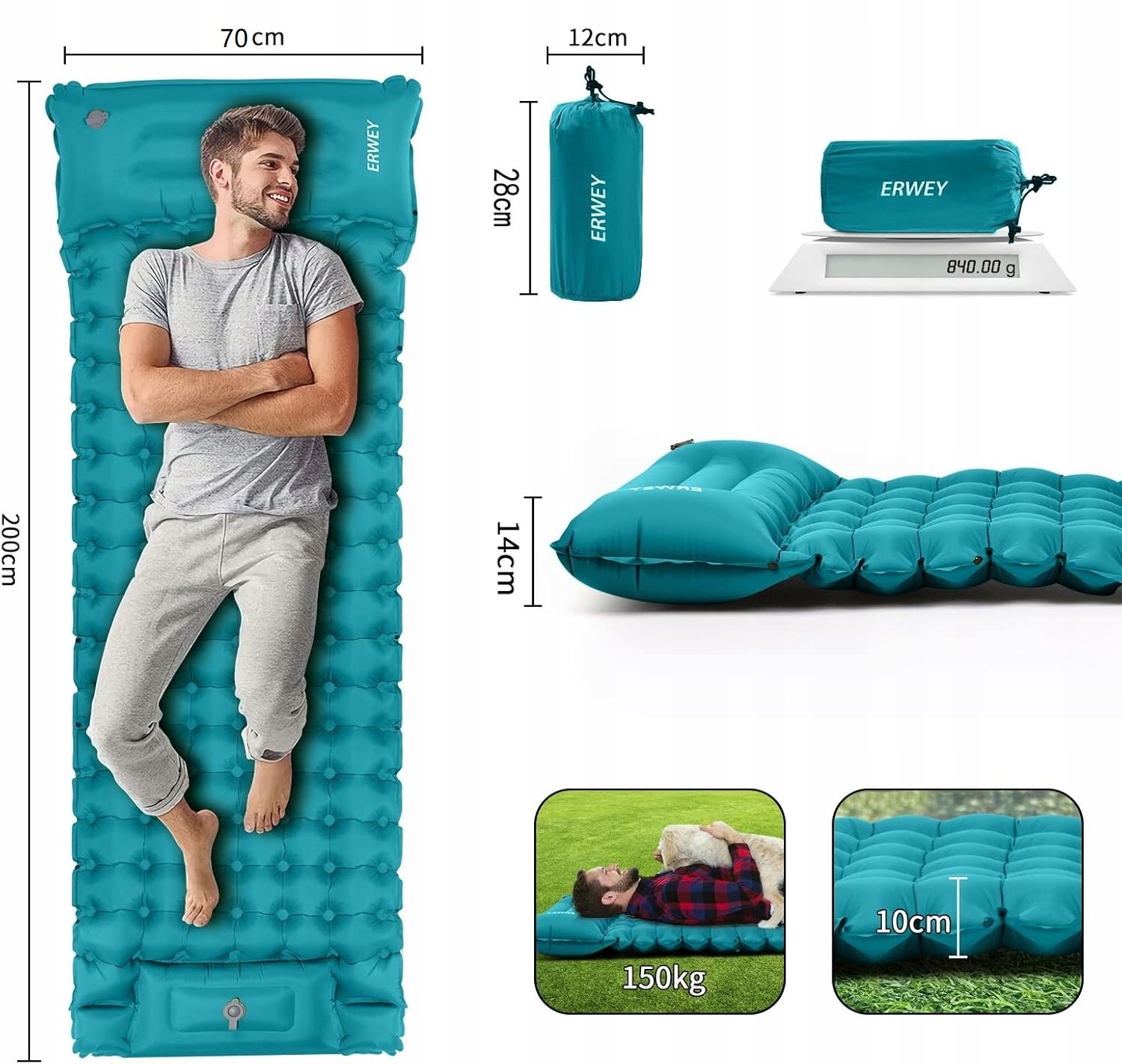 mata do spania nadmuchująca rozmiar rozszerzający na zewnątrz 200 x 70 x 10 cm, wysokość poduszki: 14 cm, rozmiar torby do przechowywania: 28 x 12 x 12 cm; obciążenie może osiągnąć 150 kg. Zmniejsz obciążenie i podróżuj łatwo, dzięki czemu możesz iść dalej i cieszyć się większą zabawą. Nadaje się do maty do spania na wędrówki, maty do spania na wędrówki z plecakiem, maty do spania na kemping, maty do spania na namiot. Taki sam rozmiar i waga jak mały bidon, idealnie mieści się w plecaku lub walizce, co czyni go najtrwalszym sprzętem kempingowym.