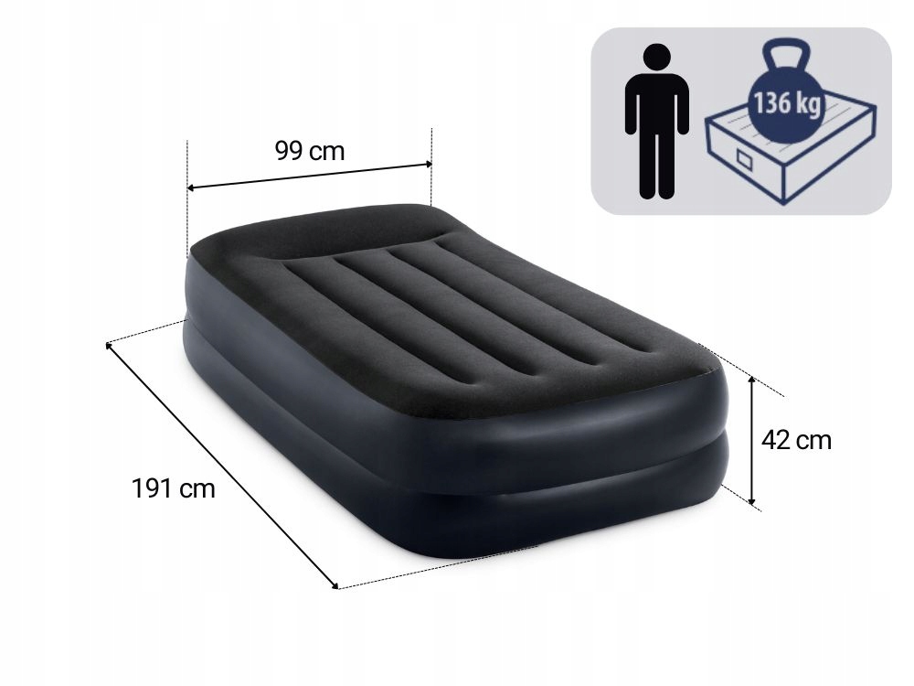 Dmuchany materac jednoosobowy marki Intex z kolekcji Pillow Rest Raised Air Mattress zapewni Ci komfort na jaki zasługujesz. Pokryty został ciemnym materiałem welurowym, który jest łatwy w czyszczeniu. Zagłówek może zastępować poduszkę, a dolny pierścień zapewnia stabilność całego materaca. Dołączona do zestawu torba nylonowa ułatwi transport oraz przechowywanie. Materac welurowy idealnie sprawdzi się jako luksusowe łóżko turystyczne.
