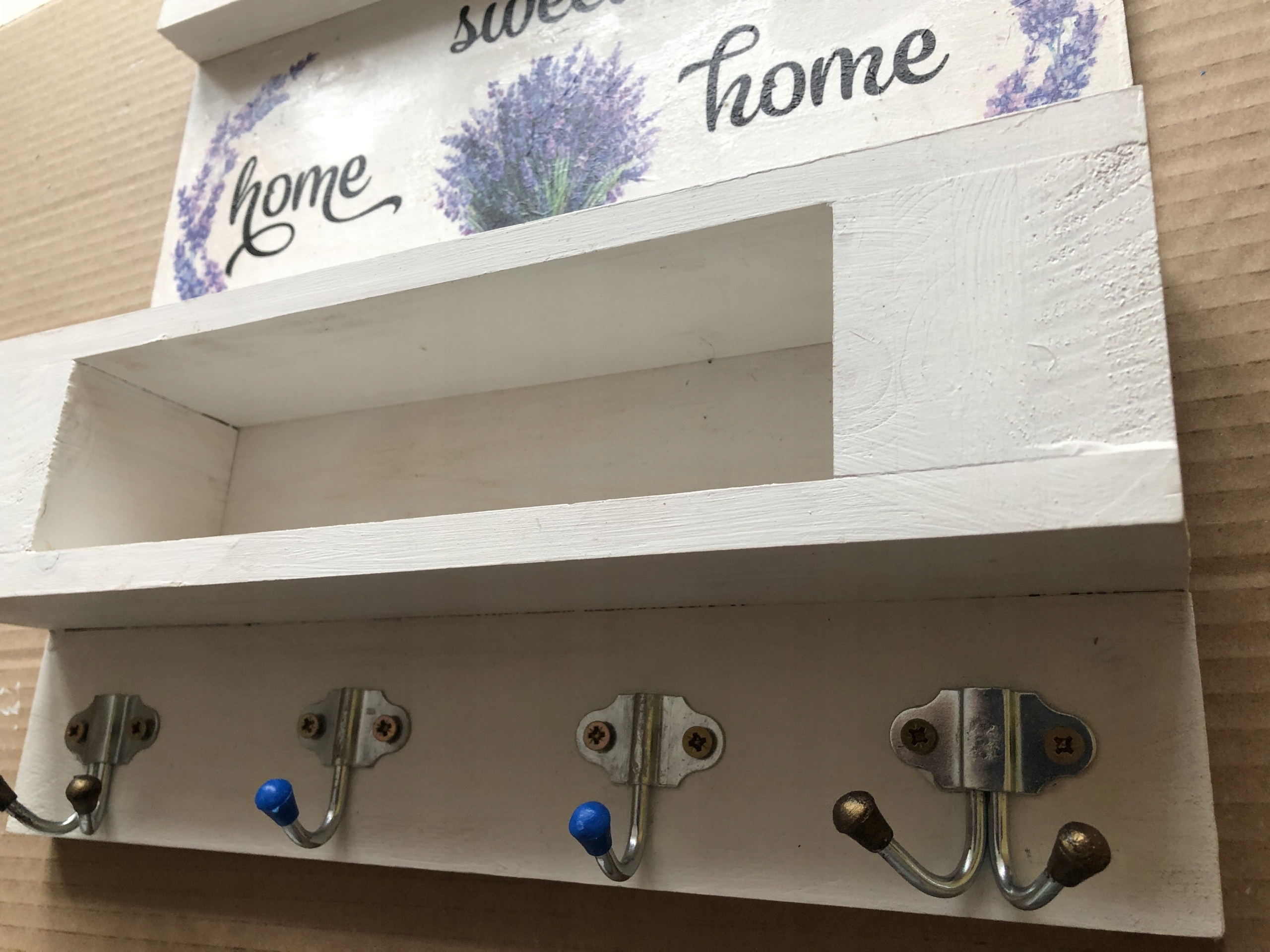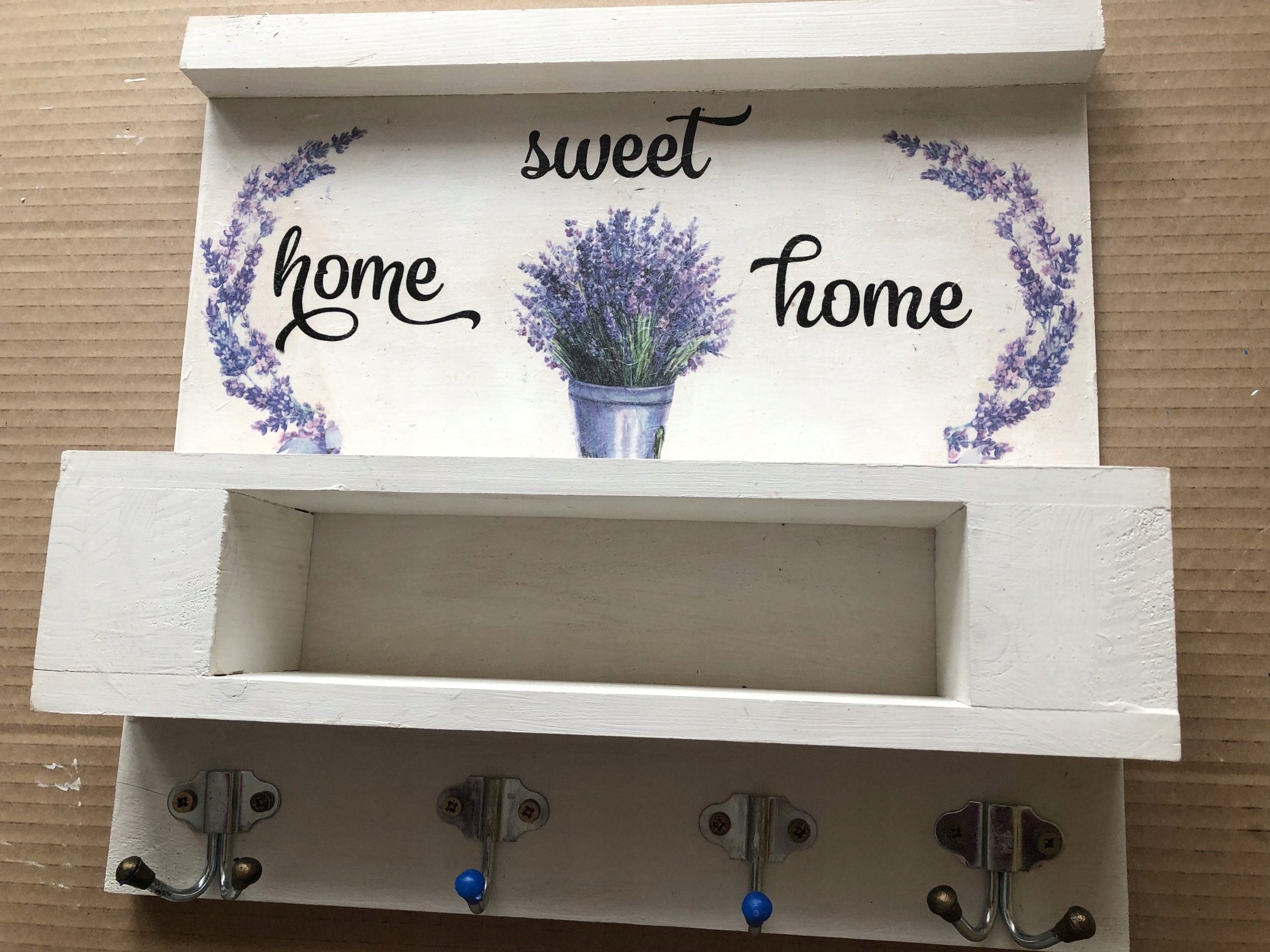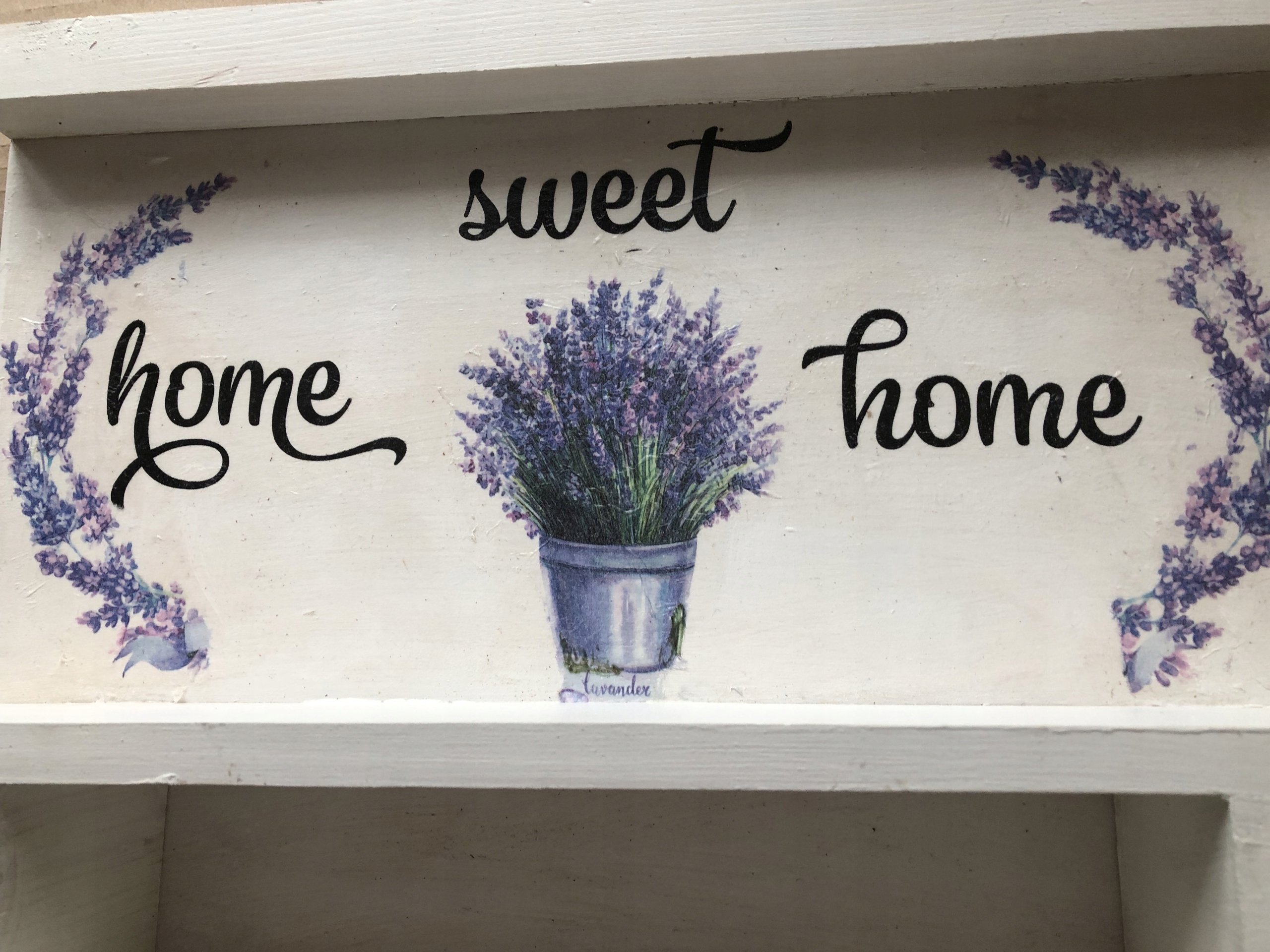 Wysokość ;36 cm z półeczką szer. 38 cm pomalowany farbami akrylowymi na biało - zdobiony techniką decupage - zdobiony lawenda . z tyłu zawieszki .gotowy do powieszenia.