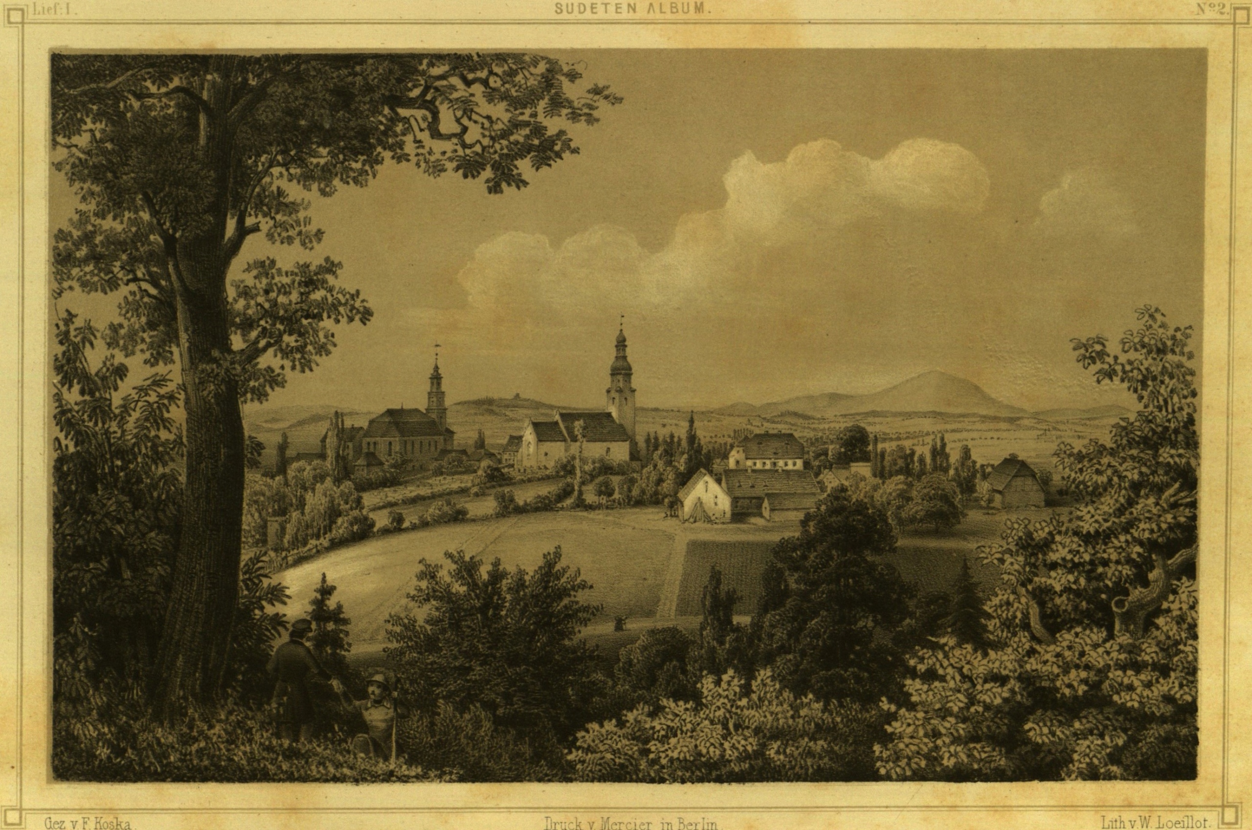 SZCZAWNO-ZDRÓJ (pow. Wałbrzych). Panorama miasta, rysunek Ferdinand Koska, Lith. Anst. v. Mercier & Loeillot, Berlin, pochodzi z: Sudeten-Album. Die Schlesischen Bäder und ihre Umgebungen..., wydanie Eduard Trewendt, 1846-1862; litografia tonowana; pożółkłe marginesy; wymiary grafiki: ok. 223x143 mm.