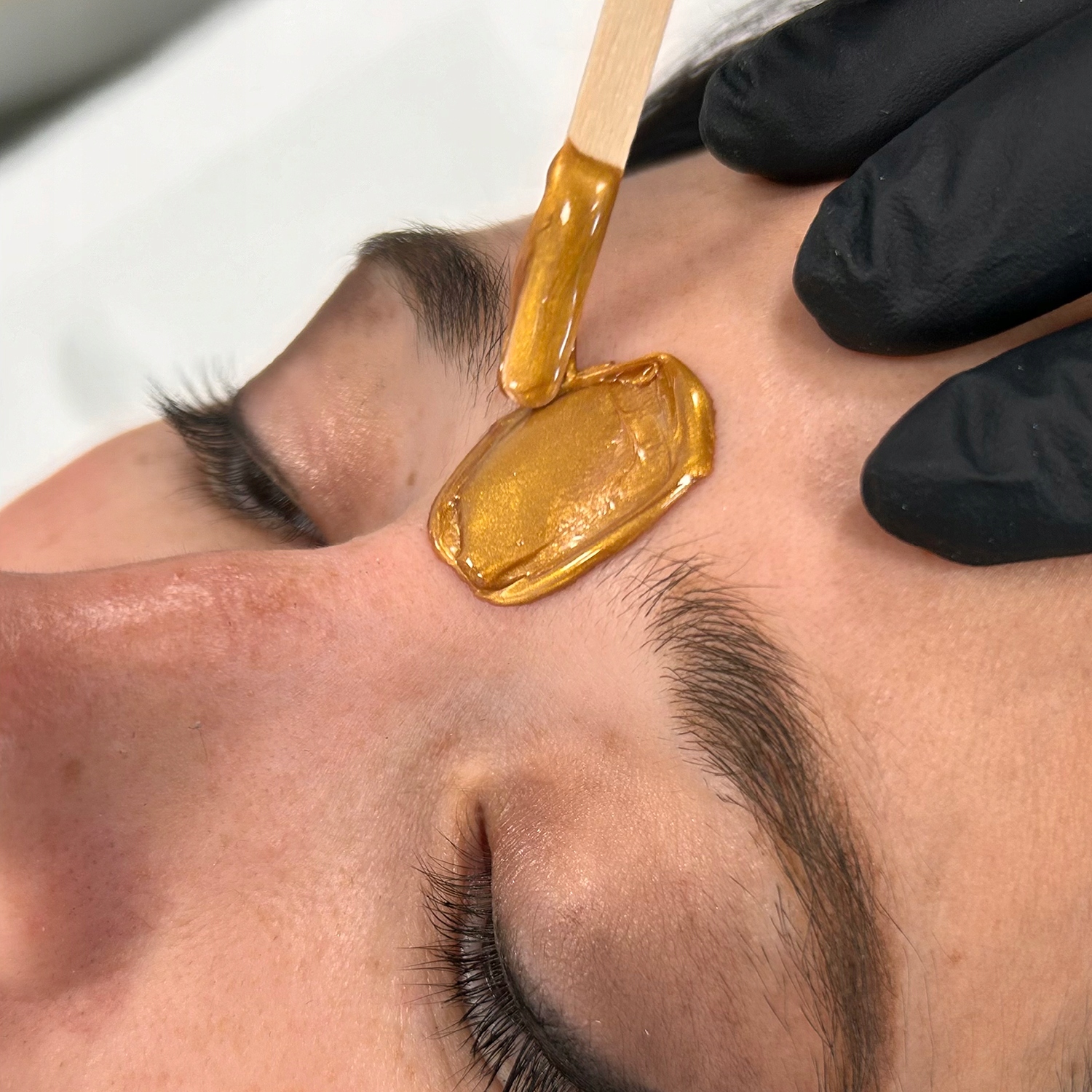 ➡️ Nałóż szpatułką cienką warstwę wosku niezależnie od kierunku wzrostu włosa, ale w kierunku do siebie i pozostaw mały „płatek”, który później będzie używany jako chwyt.
