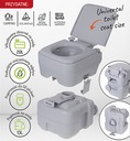 Wbudowany w toaletę pojemnik na wodę sprawia, że nie trzeba martwić się o zewnętrzne przyłącze do wody czy zasilania, aby można było z niej korzystać. Innowacyjna konstrukcja: tłokowa pompa płucząca i zbiornik na nieczystości o pojemności do 50 spłukań pozwalają na wielokrotne użycie toalety bez konieczności częstego jej opróżniania. Pojemnik na nieczystości 20 litrów i pojemnik na czystą wodę 13 litrów sprawdzają się przy większej i mniejszej grupie podróżnych. Wytrzymałe ścianki, odporne na korozję zatrzaski są gwarancją wytrzymałości produktu i szansą na długotrwałe użytkowanie toalety.