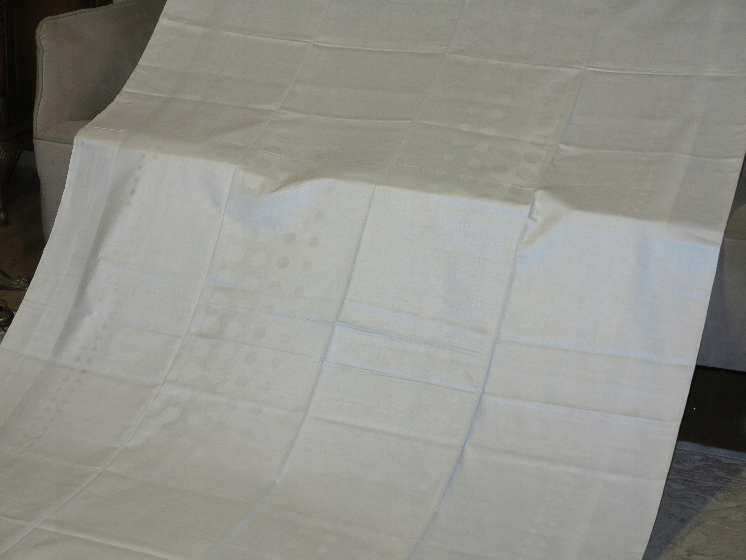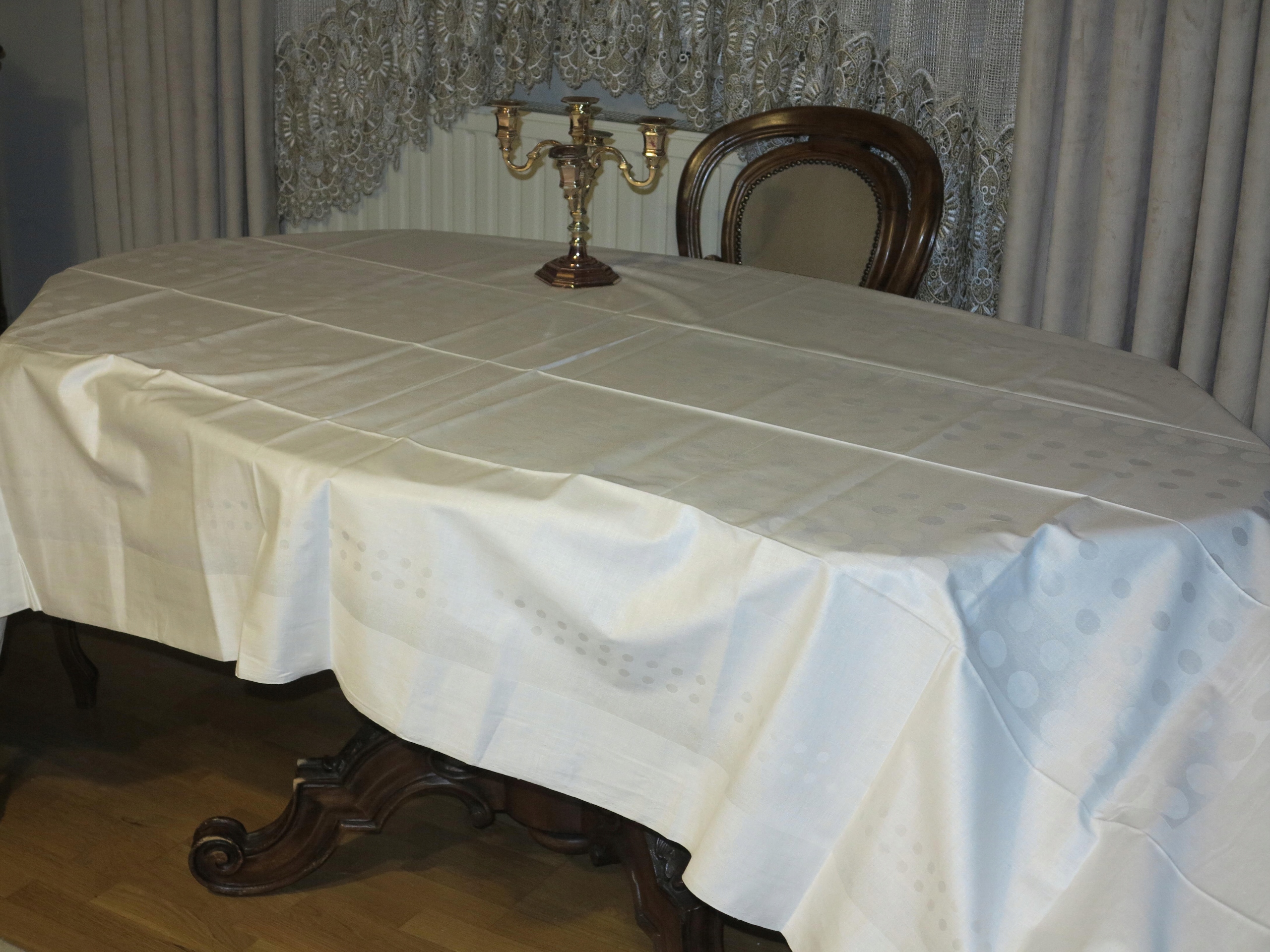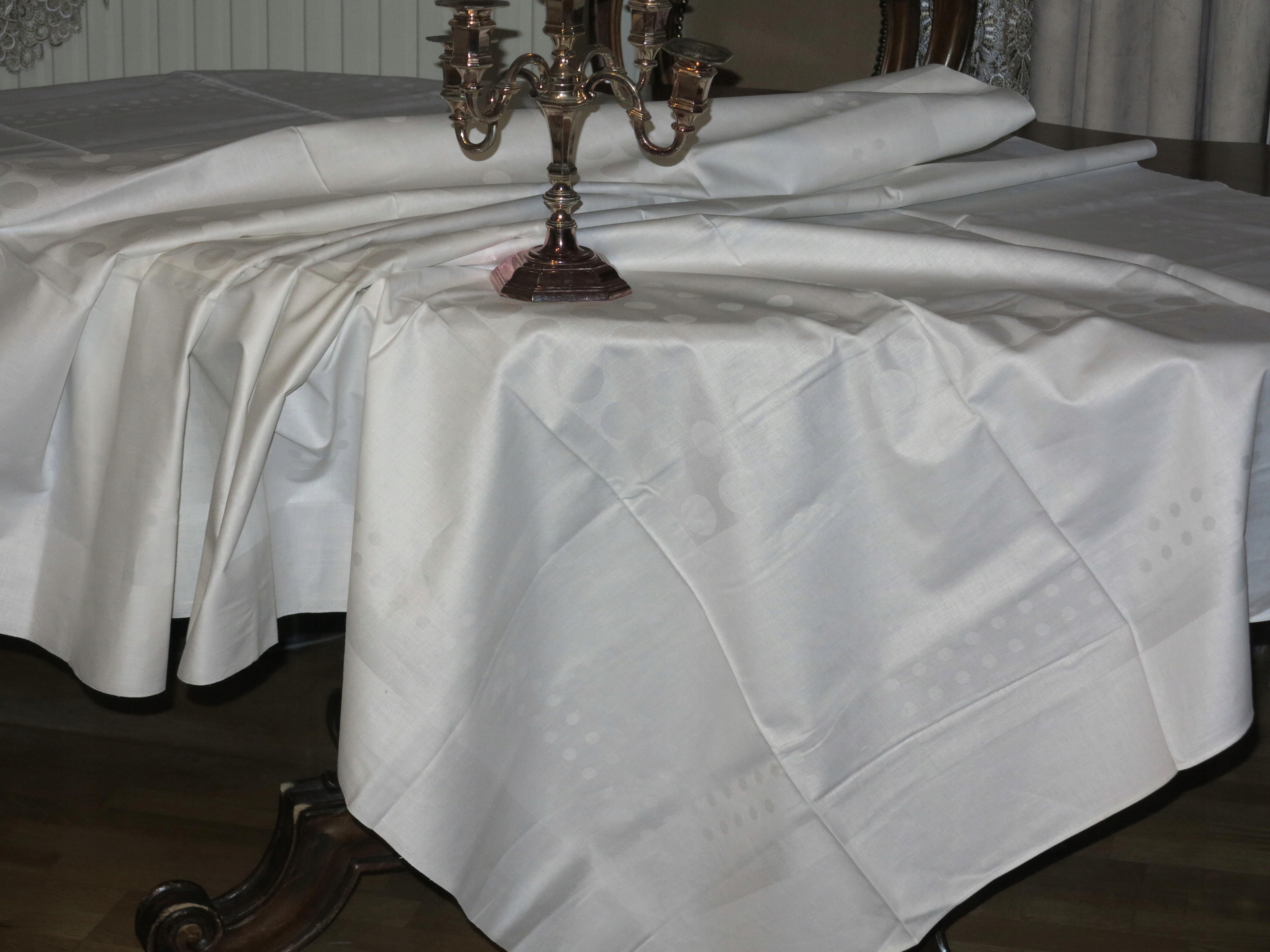 OKAZ- PIĘKNY, KLASYCZNY OGROMNY WIEKOWY BIELUTKI NIEMIECKI OBRUS Z BAWEŁNIANEGO ADAMASZKU Z KÓŁECZKOWYMI WZORAMI.