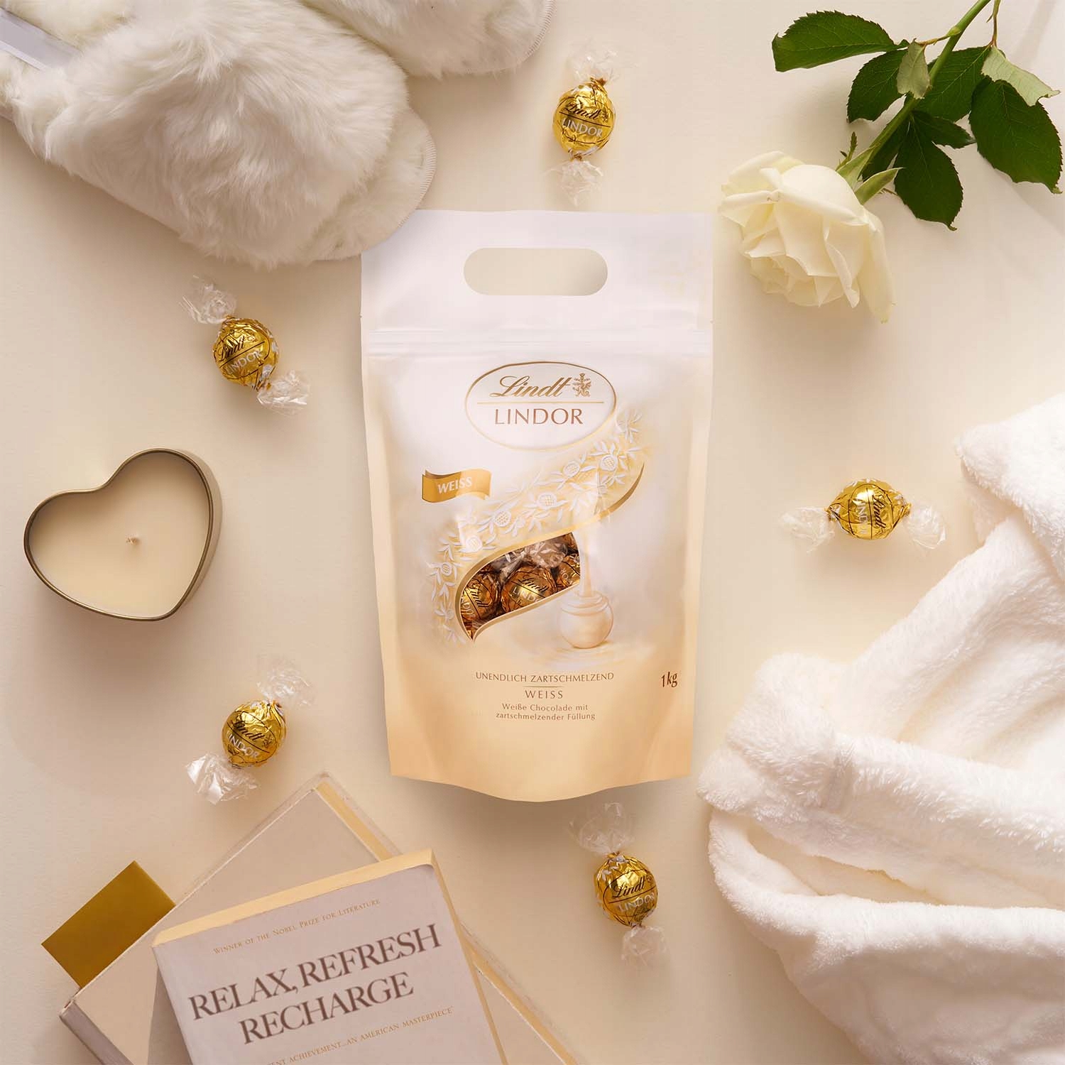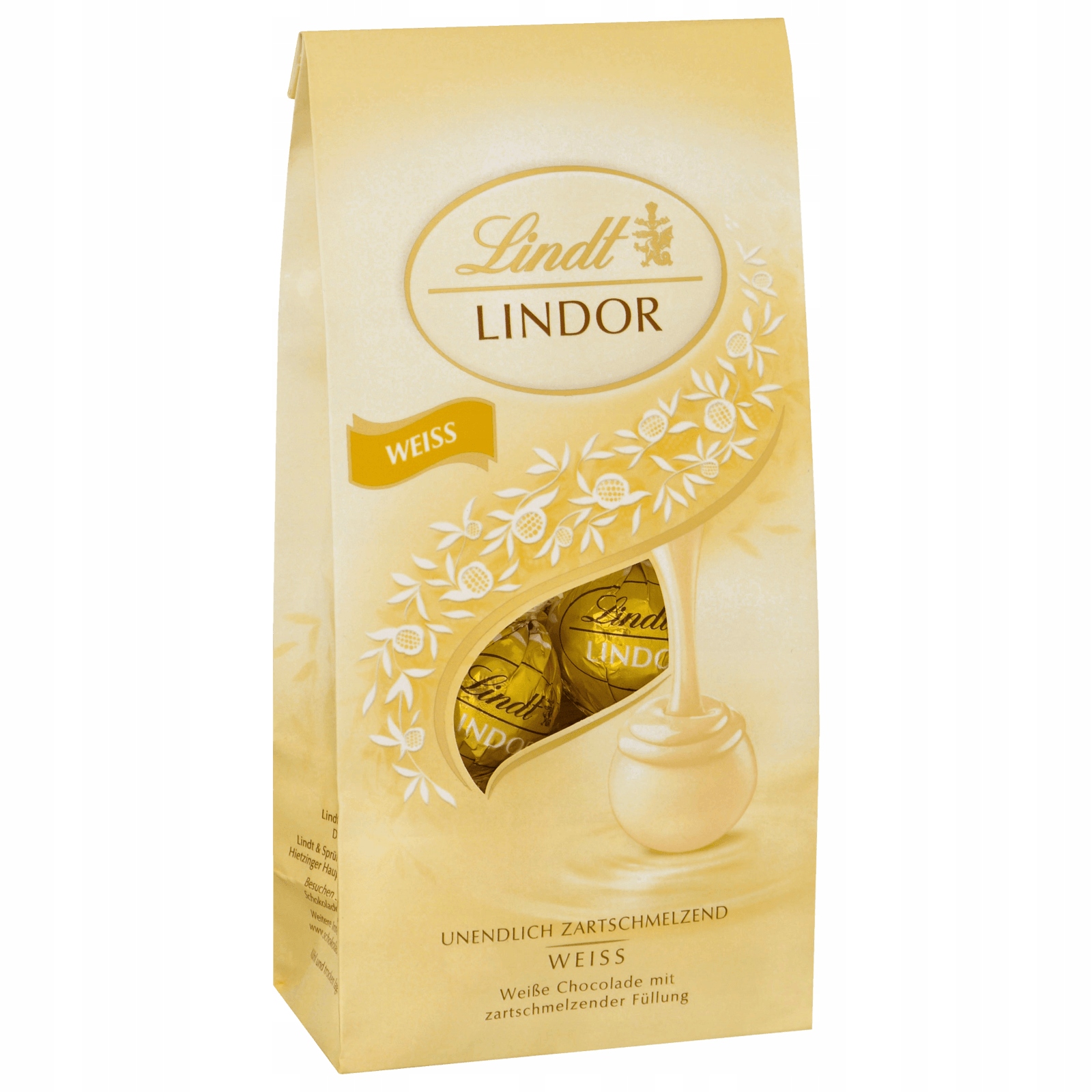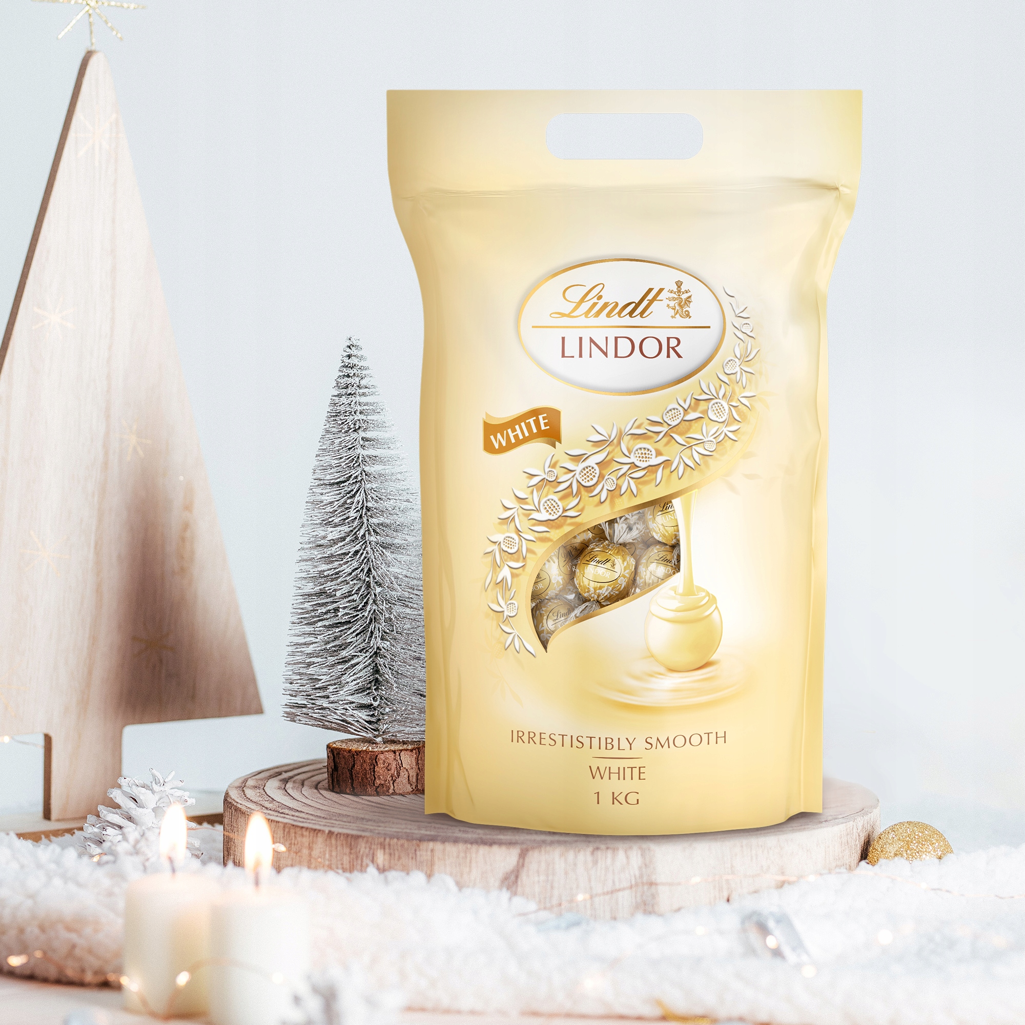 Lindt LINDOR White to praliny, rozpływające się w ustach, ze zniewalająco aksamitnym nadzieniem w otoczce z białej czekolady.