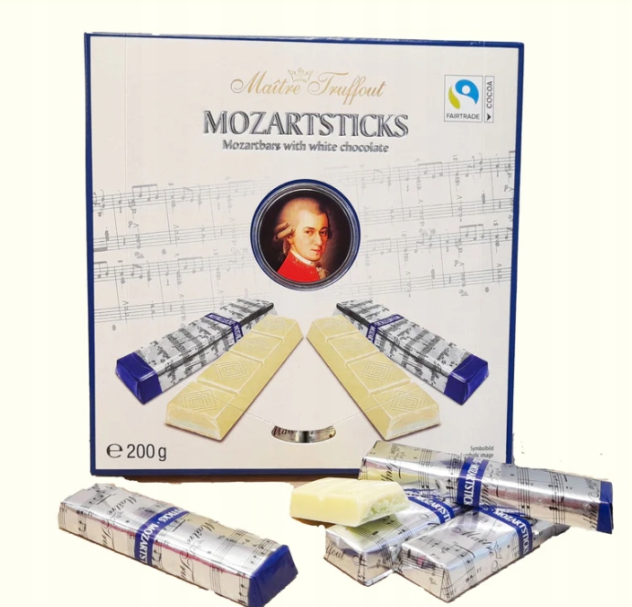 Mozartsticks White to wyjątkowy biały baton inspirowany smakiem Mozarta od Maître Truffout. Przełamując barierę konwencjonalnych smaków, biała czekolada doskonale komponuje się ze smakiem marcepanu i pistacji, tworząc niepowtarzalną pralinową przyjemność w długiej formie.
