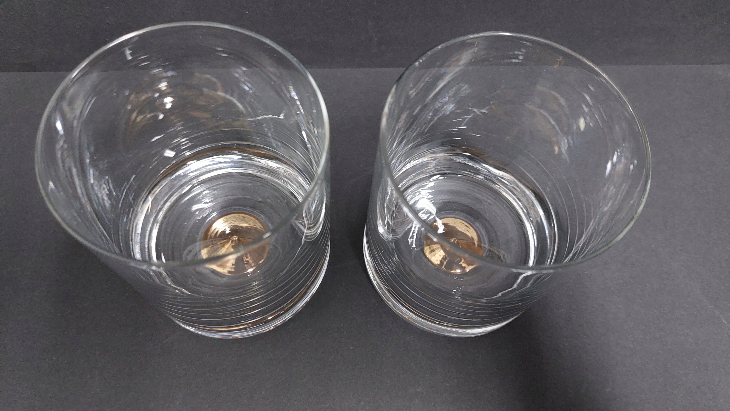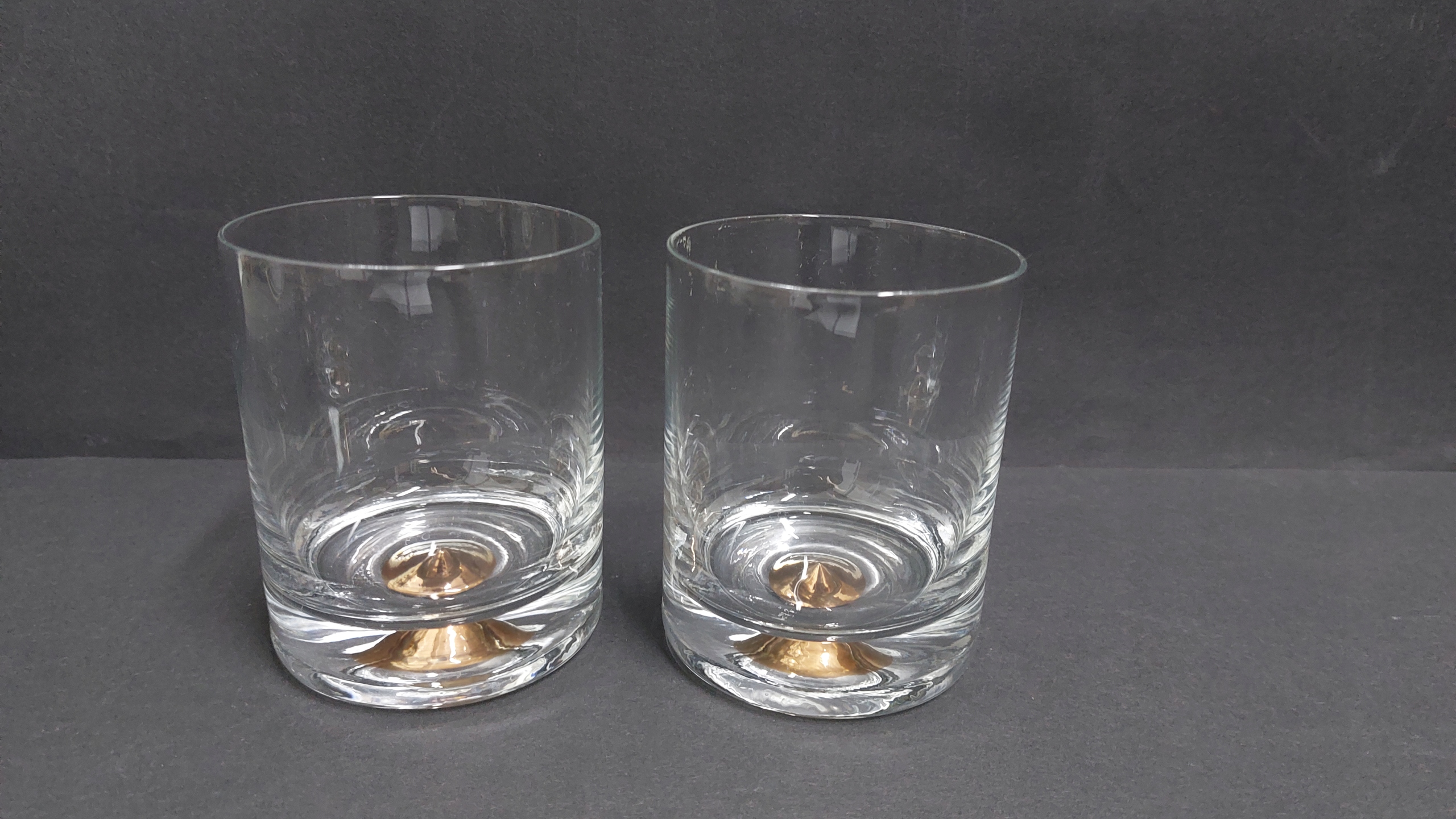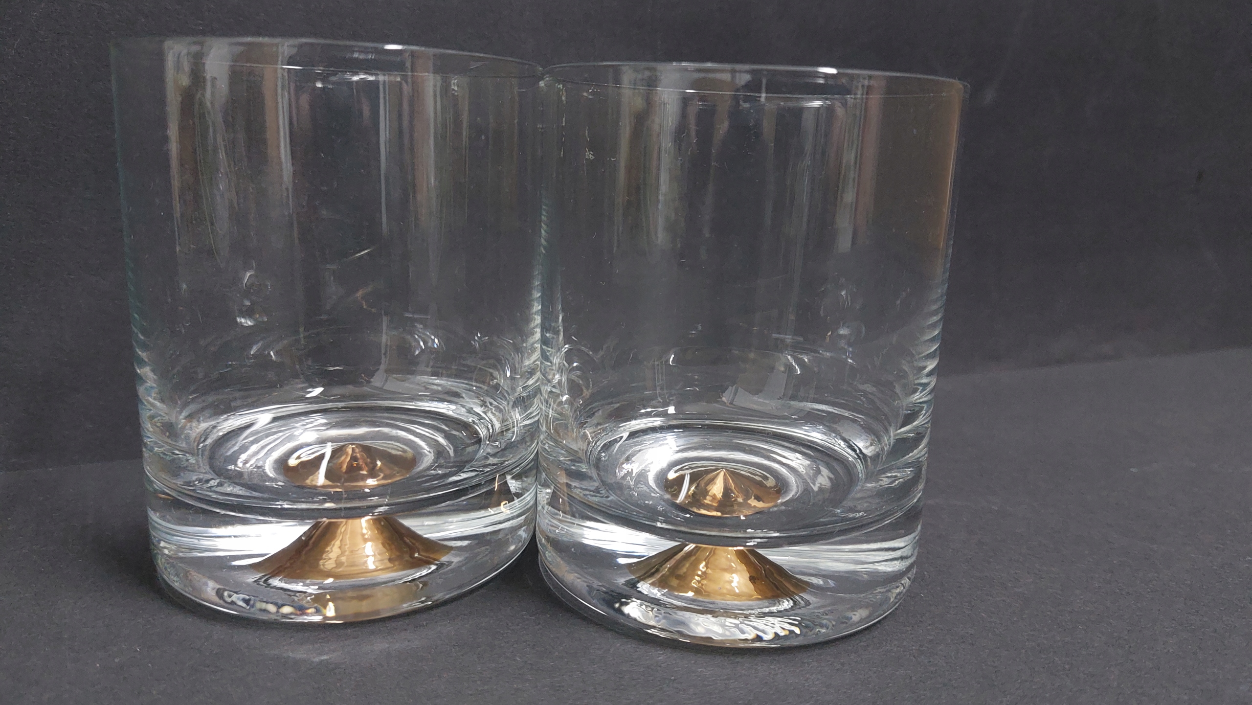 Para przepięknych szklanek ze złotym stożkiem w spodzie, bardzo ładny stan zachowania, jak na zdjęciach. Fantastycznie się prezentują, idealne na niebanalny prezent. Pojemność 200 ml.