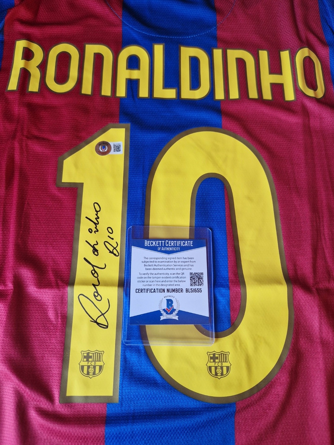 Koszulka z certyfikatem autentyczności Beckett w formie hologramu na koszulce z indywidualnym numerem seryjnym i kodem qr + zgodny certyfikat w ramie. Koszulka pochodzi z jednej z wielu komercyjnej sesji składania autografów, którą Ronaldinho odbył dla jednego z oficjalnych partnerów icons.com.