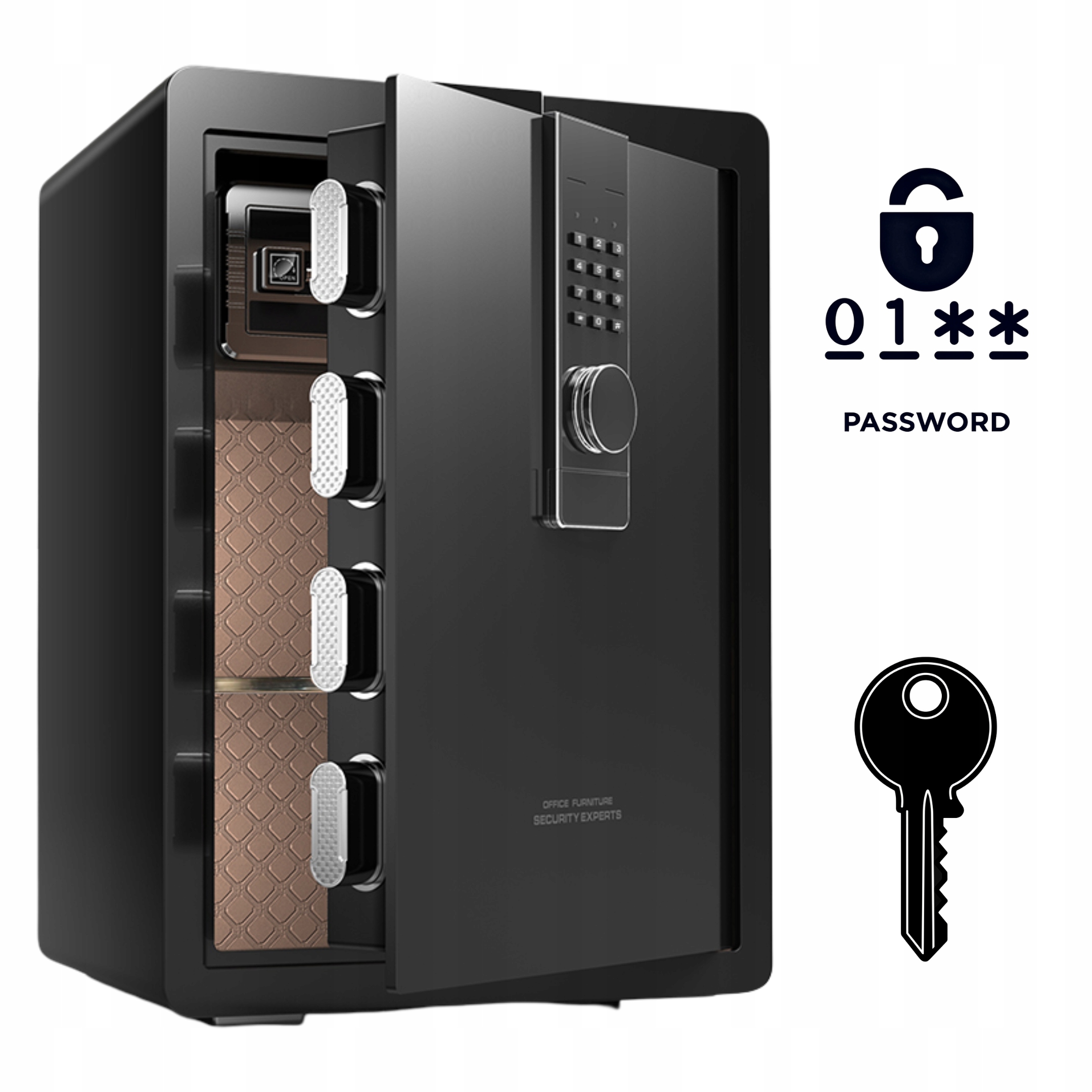 Sejf wyposażono w nowoczesny system alarmowy, który aktywuje się po trzech nieudanych próbach wprowadzenia hasła, zwiększając poziom bezpieczeństwa. Oferuje dwa sposoby otwierania: kod elektroniczny oraz tradycyjne klucze (2 sztuki w zestawie), co zapewnia pełną elastyczność i komfort użytkowania.