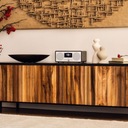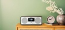 To kompaktowe radio ma idealne wymiary do sypialni, gabinetu lub na półkę w kuchni. Wewnątrz drewnianego korpusu, za stylową, szczotkowaną aluminiową obudową, znajdują się dwa pełnozakresowe głośniki zapewniające przyjemność słuchania dźwięku stereo o mocy 6 W.