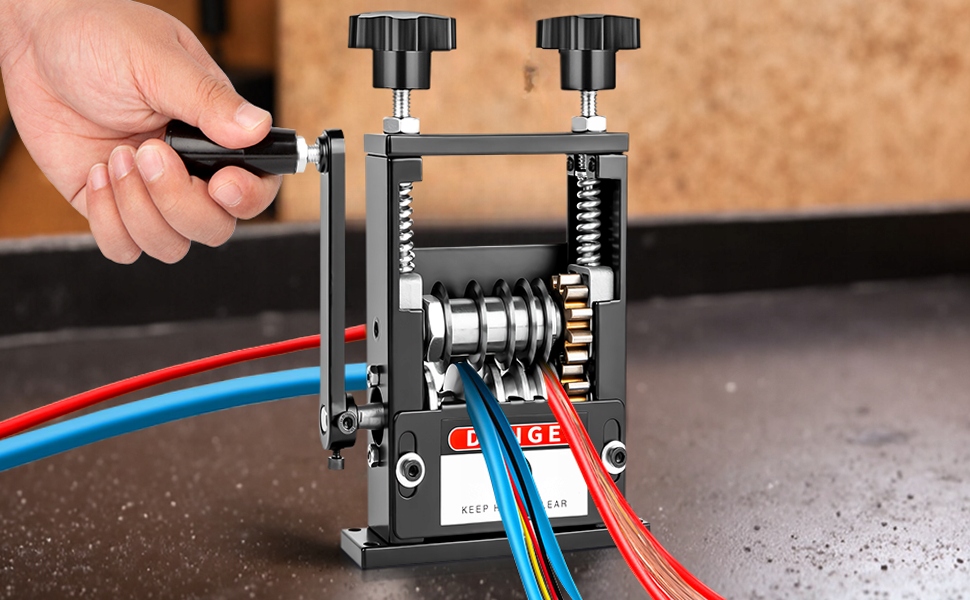 ✅ Wyposażona w 6 kanałów podających i 5 ostrzy, obsługuje przewody o średnicach 3 mm, 5 mm, 7 mm, 9 mm, 12 mm i 17 mm. Idealna do zdejmowania izolacji z przewodów twardych i miękkich, przewodów wielożyłowych, żył monofilamentowych i innych.