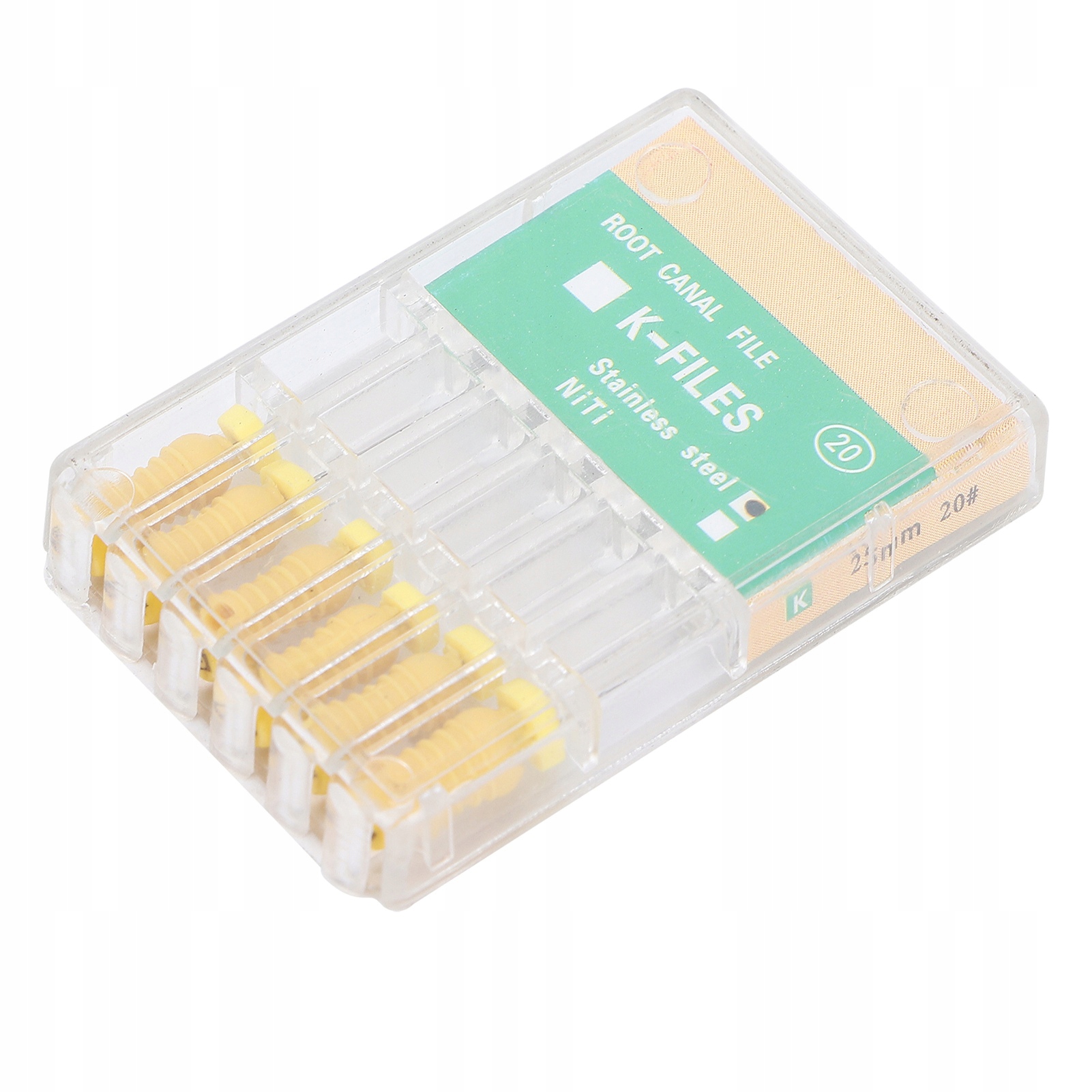 1. 6 sztuk pilników K nr 20, ze stałą plastikową uszczelką i uchwytem, specjalnie zaprojektowanych do stosowania w leczeniu stomatologicznym.