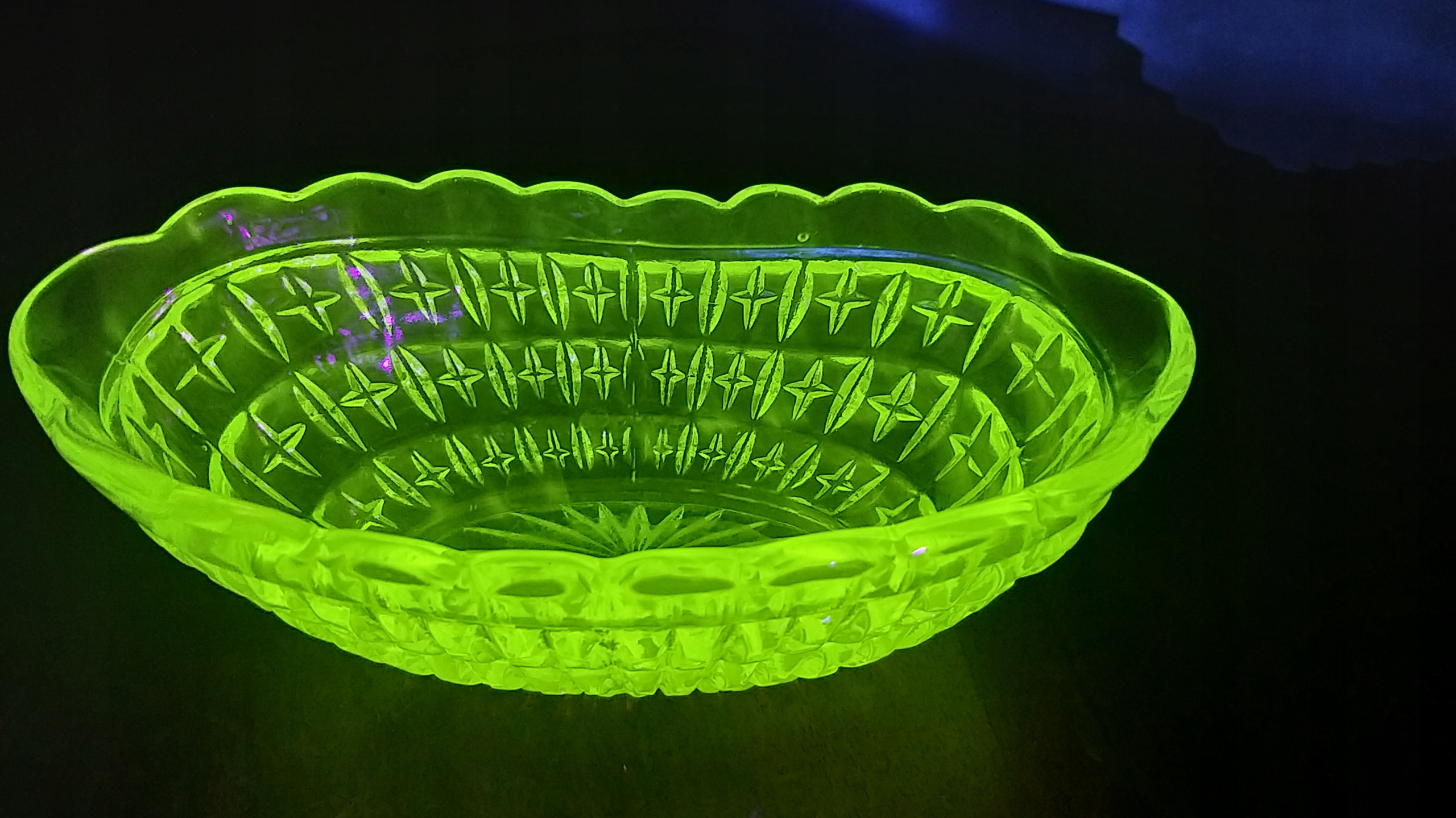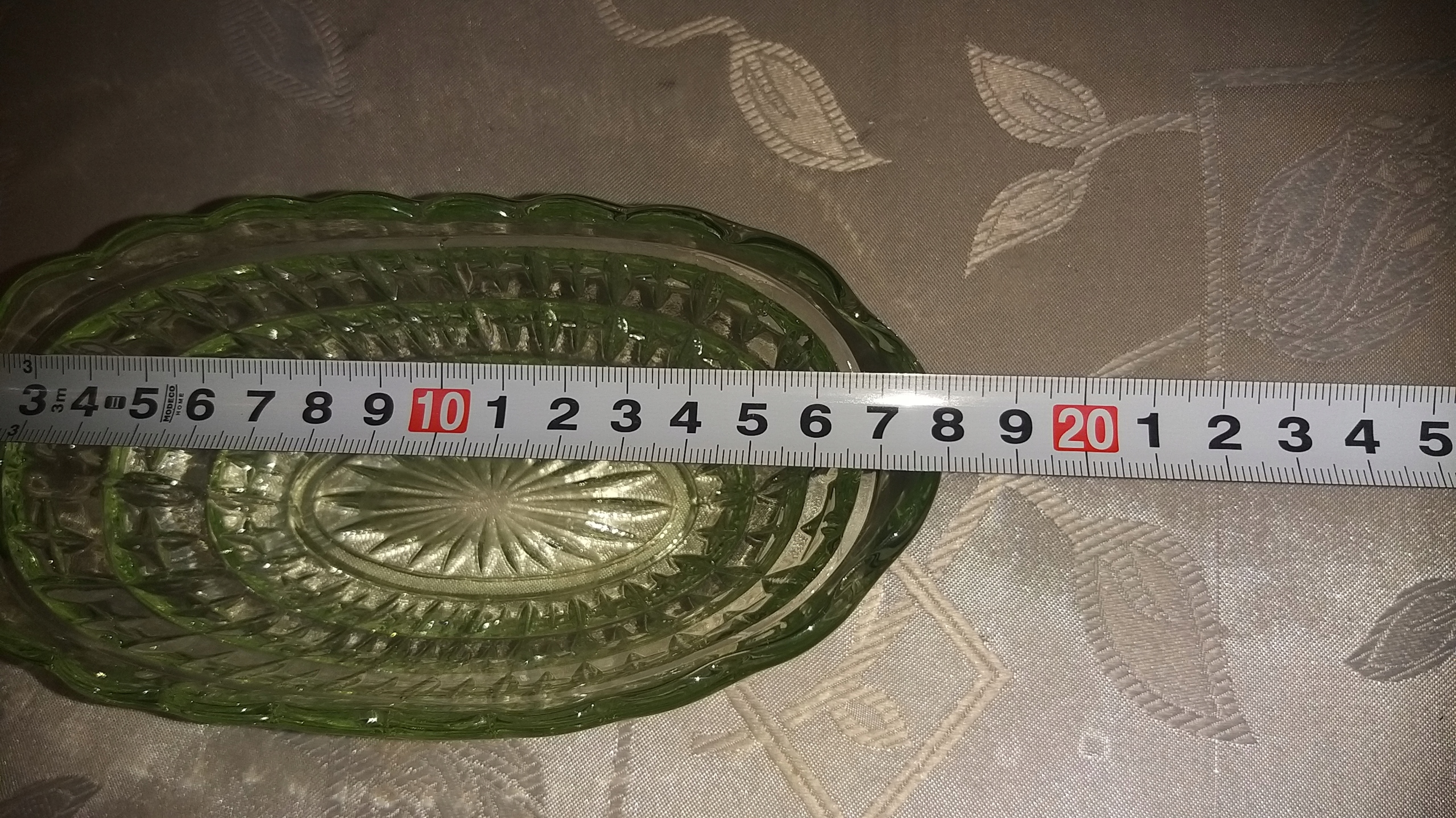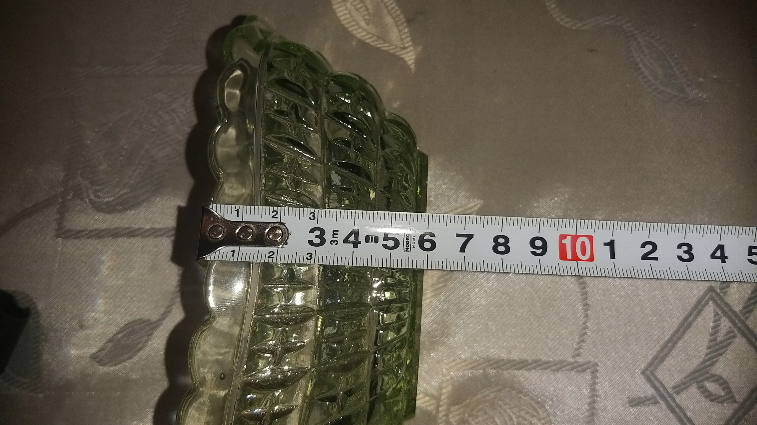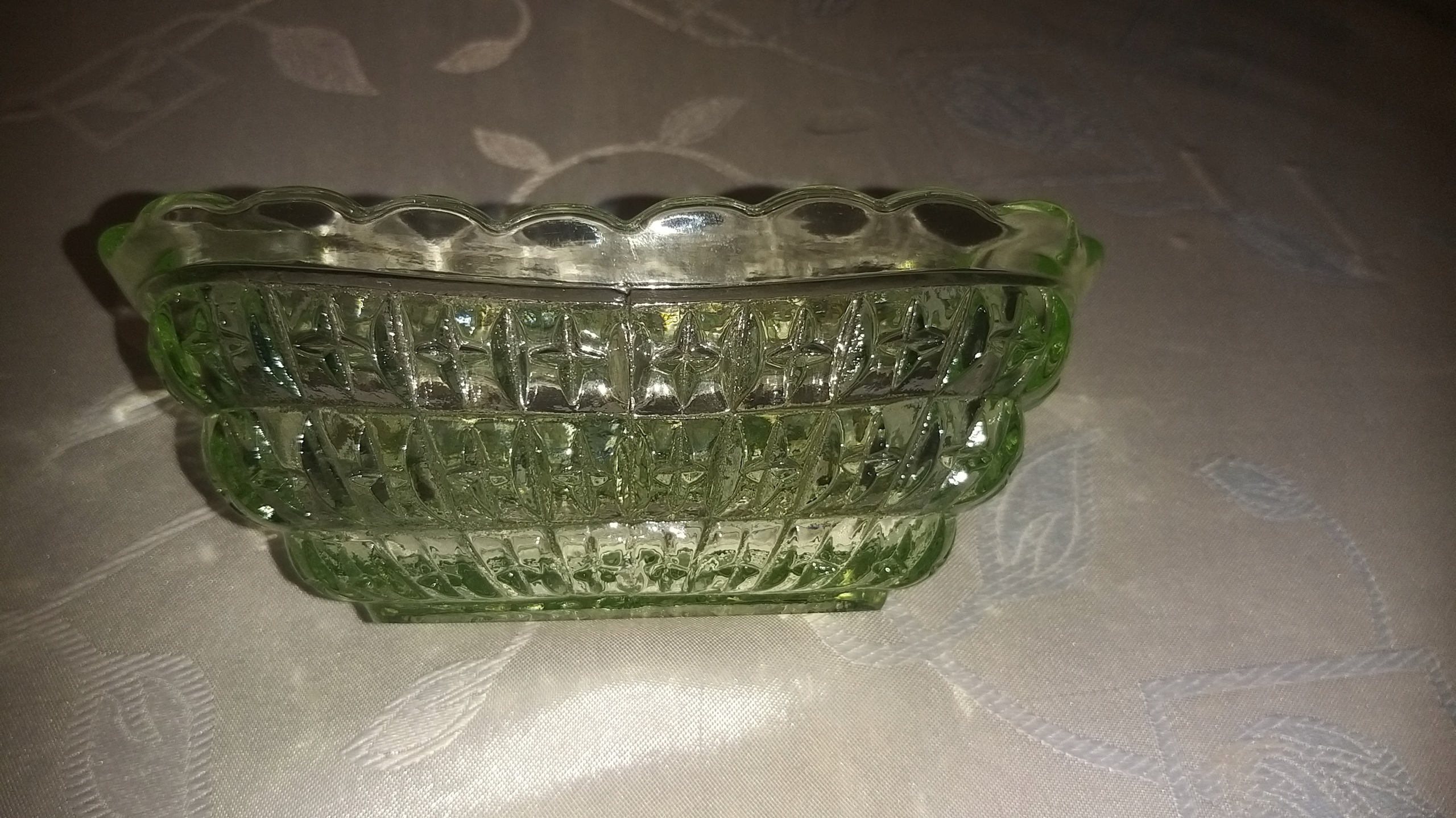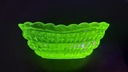 Oferuję starą , małą żardinierę. Przedmiot wykonany ze szkła prasowanego, uranowego. Przedmiot w bardzo dobrym stanie, bez pęknięć i ubytków. Wymiary żardiniery takie jak na fotografiach. Kolor szkła jasno zielony, po oświetleniu lampą UV świeci intensywnie w kolorze seledynowym.Ciekawy przedmiot do kolekcji.