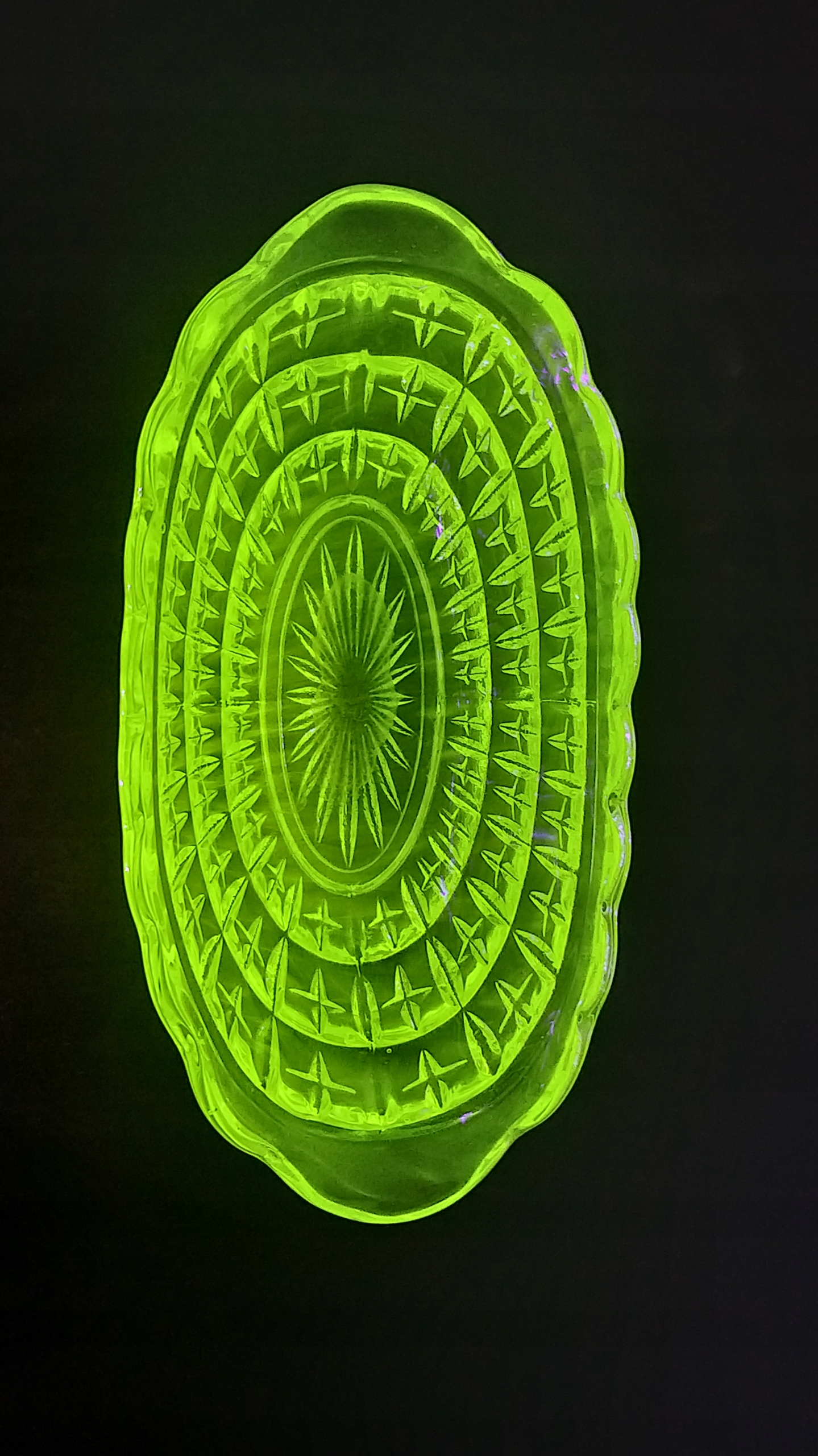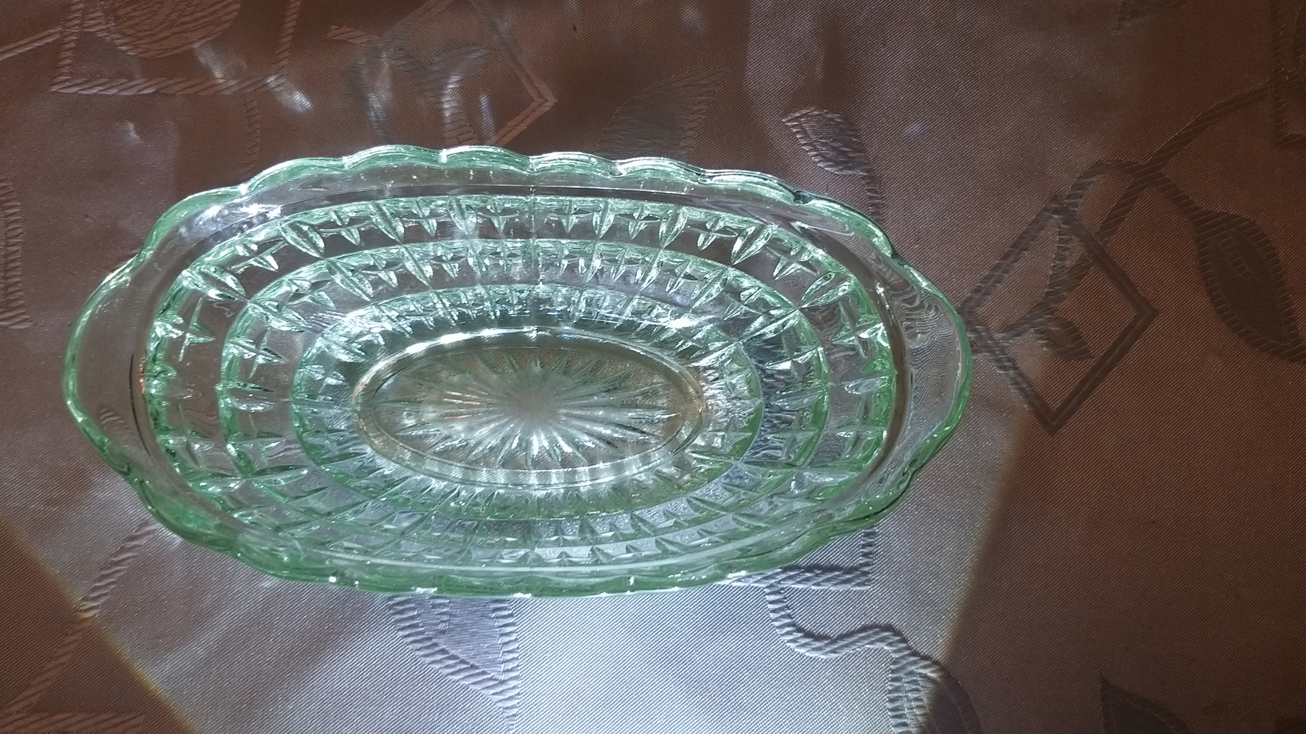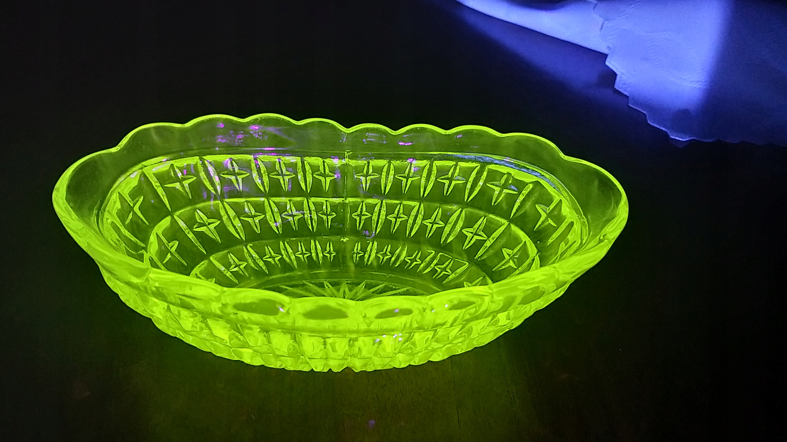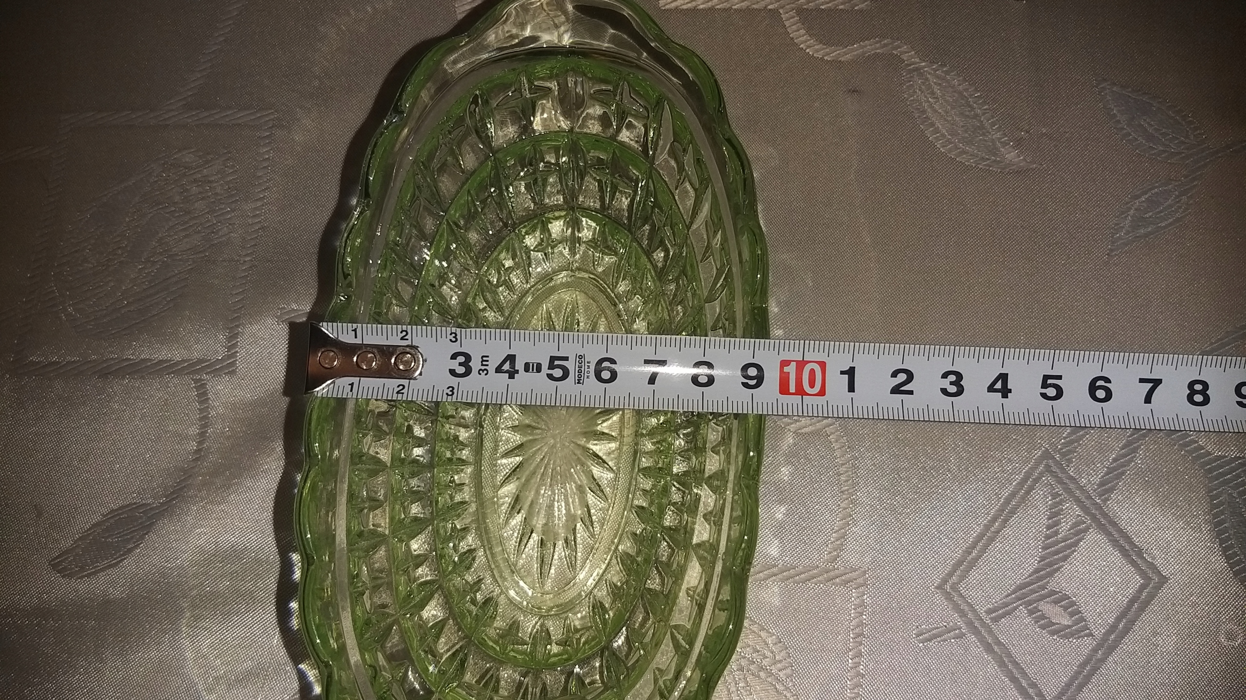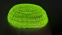 Oferuję starą , małą żardinierę. Przedmiot wykonany ze szkła prasowanego, uranowego. Przedmiot w bardzo dobrym stanie, bez pęknięć i ubytków. Wymiary żardiniery takie jak na fotografiach. Kolor szkła jasno zielony, po oświetleniu lampą UV świeci intensywnie w kolorze seledynowym.Ciekawy przedmiot do kolekcji.