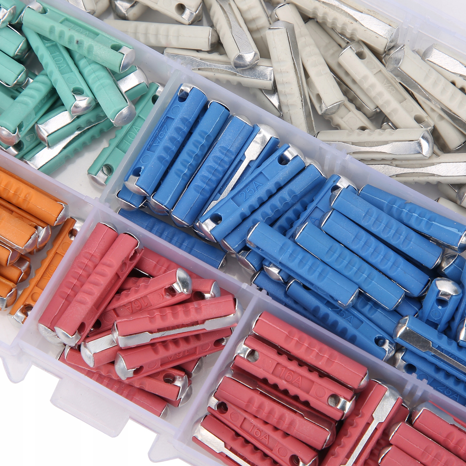 3. Dołączone bezpieczniki o różnym natężeniu. 5A, 8A, 10A, 16A, 25A odpowiadają odpowiednio kolorom pomarańczowym, białym, zielonym, czerwonym i niebieskim.