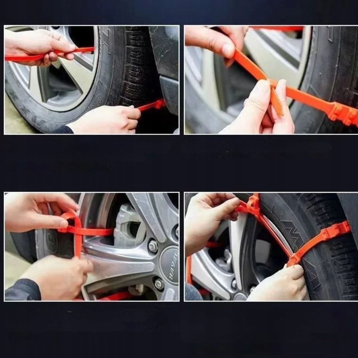 Pasują do większości opon samochodów osobowych i dostawczych. Regulowany pasek pozwala dopasować opaskę do szerokości opony.