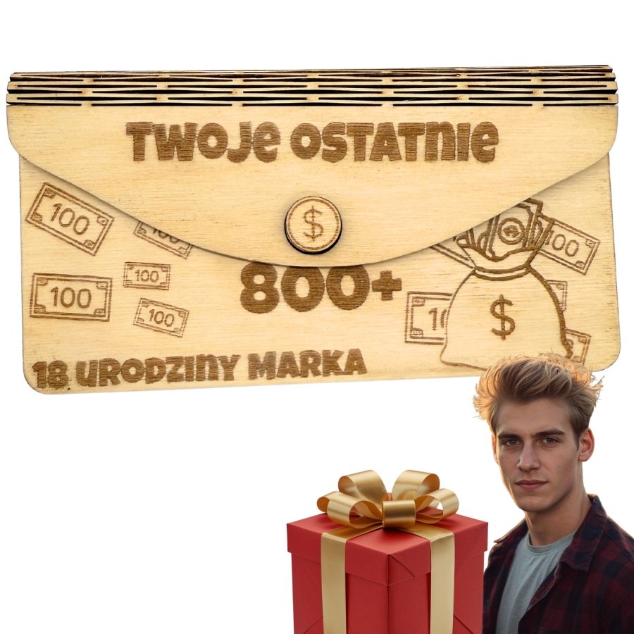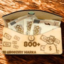 Nasza drewniana koperta to elegancka i trwała pamiątka dekoracyjna, która zastępuje tradycyjną kartkę lub papierową kopertę. Idealna, aby wręczyć „ostatnie 800+” w wyjątkowy i zabawny sposób. W środku bez problemu zmieścisz banknoty.