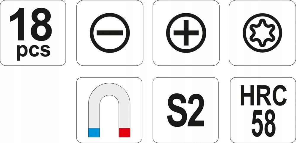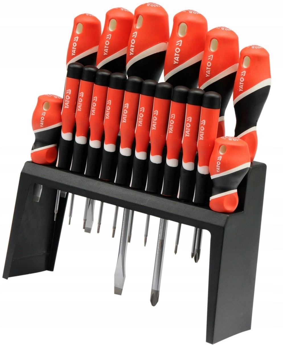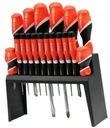 Zestaw osiemnastu profesjonalnych wkrętaków.Trzpień wykonany ze stali o symbolu S2, utwardzany do około 58 HRC. Powierzchnia trzpienia satynowana, końcówka robocza utwardzana i piaskowana / wzmacnia to stabilność grota /. Rękojeść wykonana z odpowiednio dobranych tworzyw o różnych twardościach.